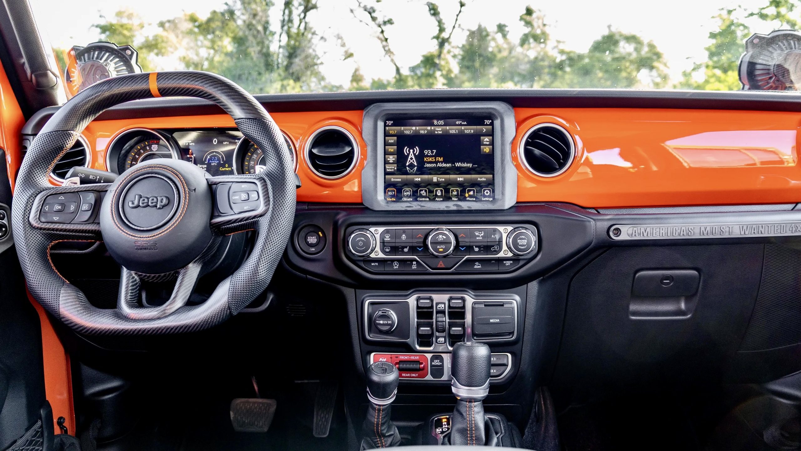 Inside, it’s just as custom. The cabin gets premium black Tuscany leather with orange stitching, AMW logos, a carbon fiber steering wheel with paddle shifters, and even a special AMW-branded tach and speedometer. Tech includes an 8.4-inch Uconnect touchscreen with Apple CarPlay, Android Auto™, built-in navigation, a 4G Wi-Fi hotspot, and a booming Alpine audio system.