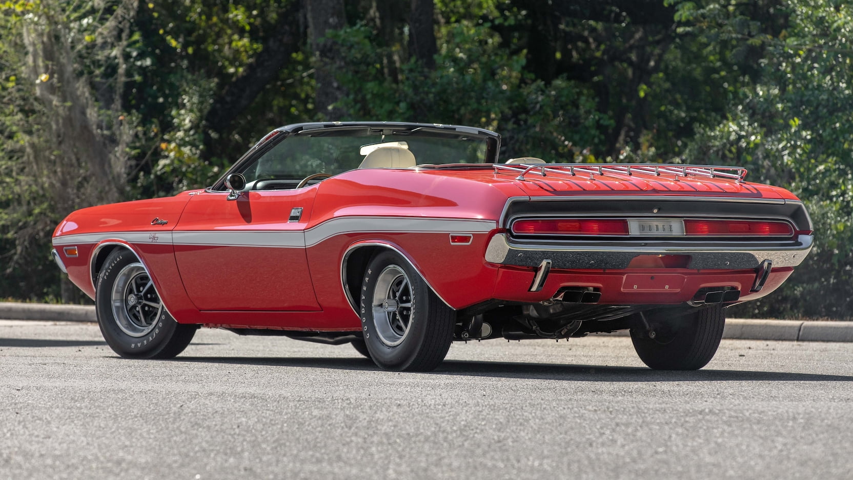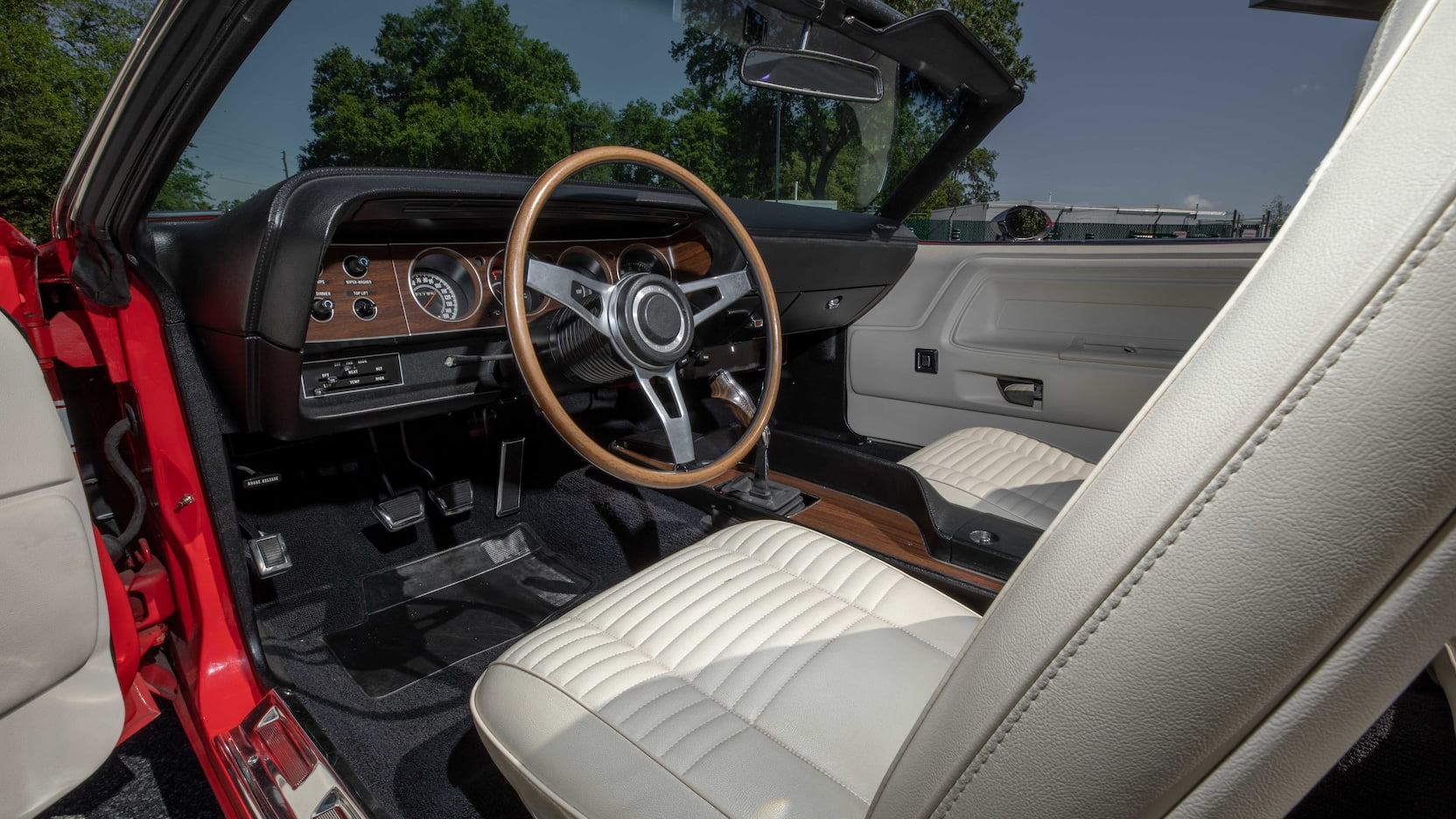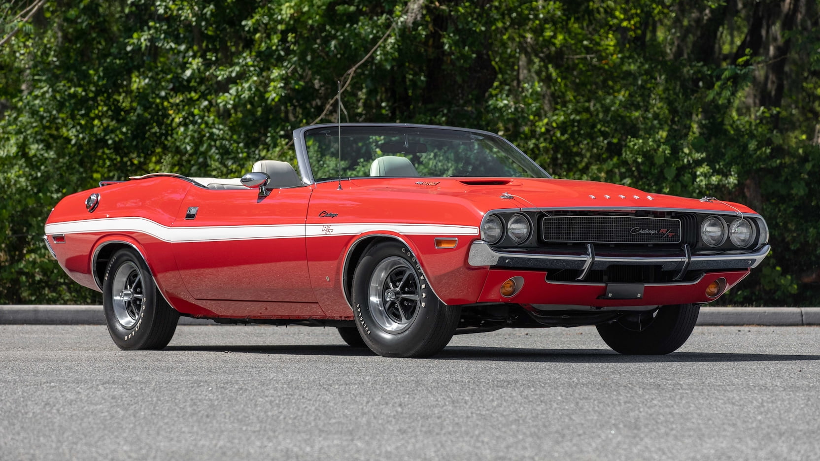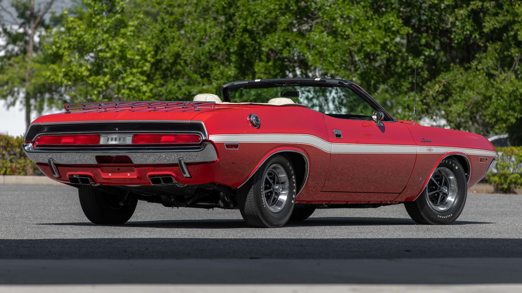 The car is decked out in Bright Red (FE5) paint with white R/T stripes, a white convertible top, and a white and black interior with vinyl bucket seats, a woodgrain console, Pistol Grip shifter, and the Rallye dash. Outside, you’ll spot hood pins, chrome mirrors, a luggage rack, and Styled Road wheels wrapped in Goodyear Polyglas tires.