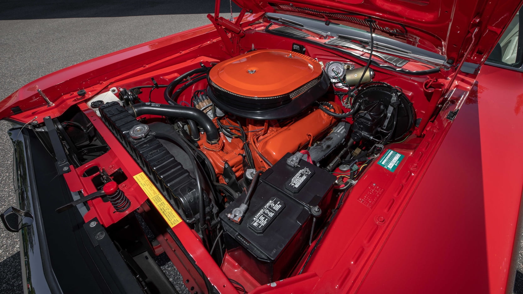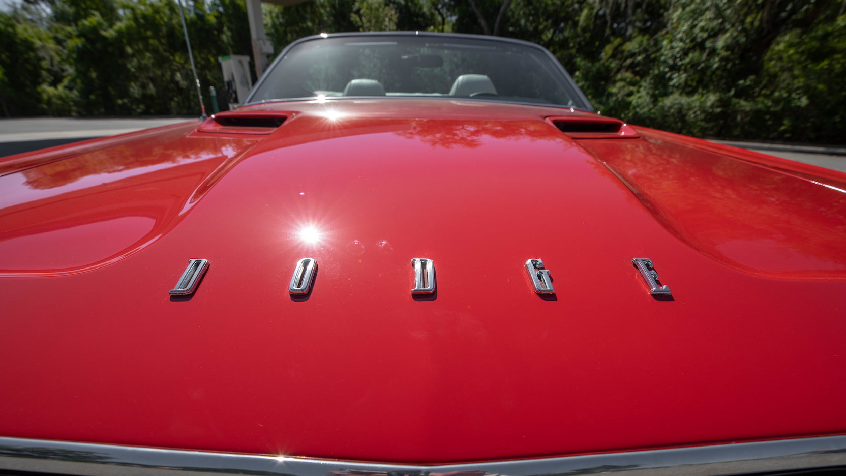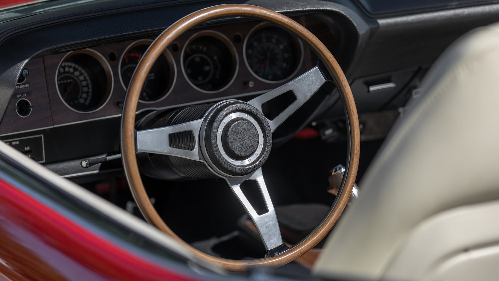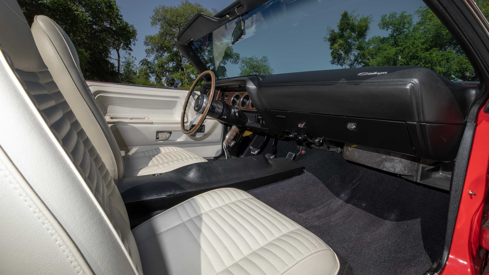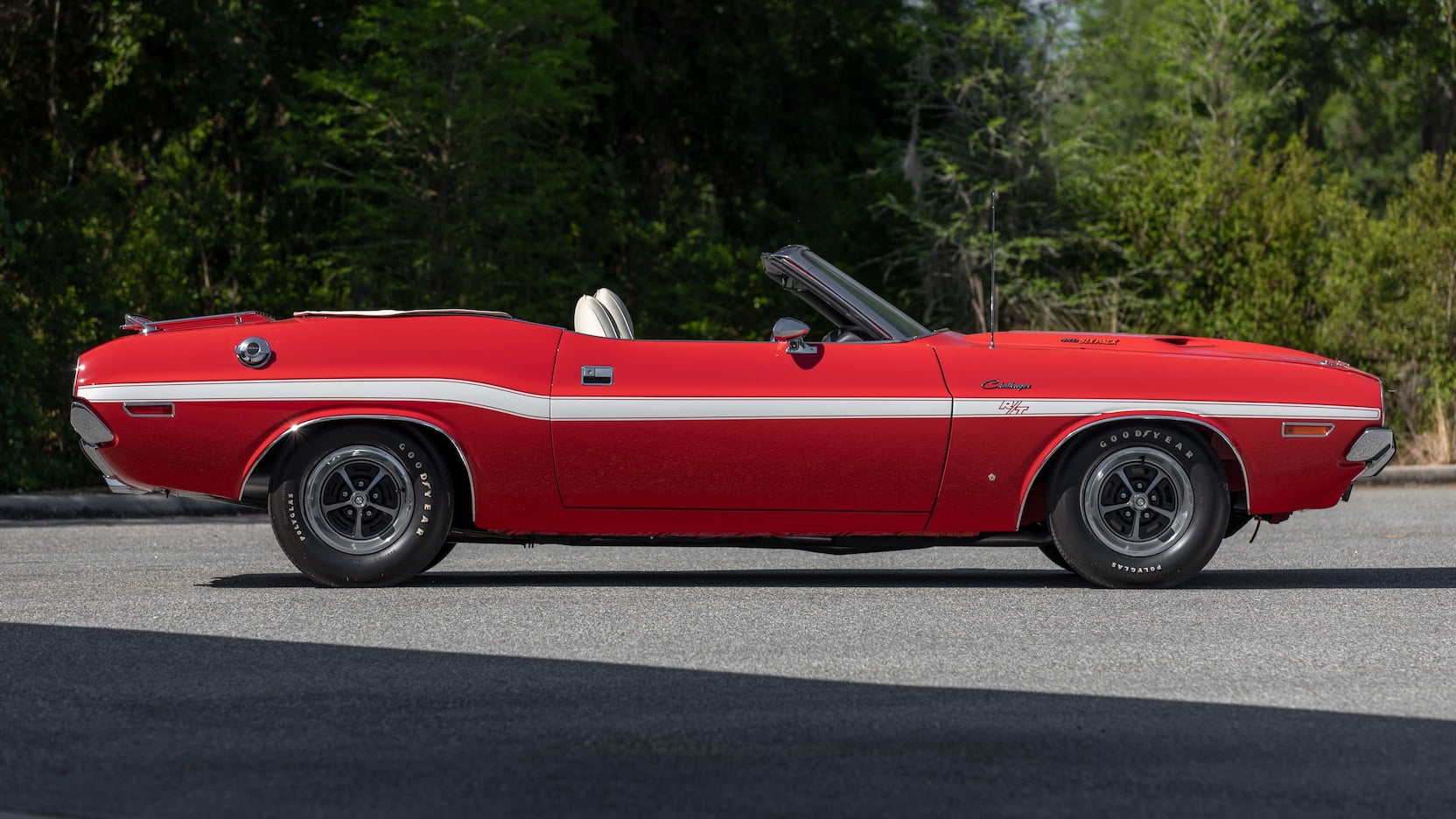 The car is decked out in Bright Red (FE5) paint with white R/T stripes, a white convertible top, and a white and black interior with vinyl bucket seats, a woodgrain console, Pistol Grip shifter, and the Rallye dash. Outside, you’ll spot hood pins, chrome mirrors, a luggage rack, and Styled Road wheels wrapped in Goodyear Polyglas tires.