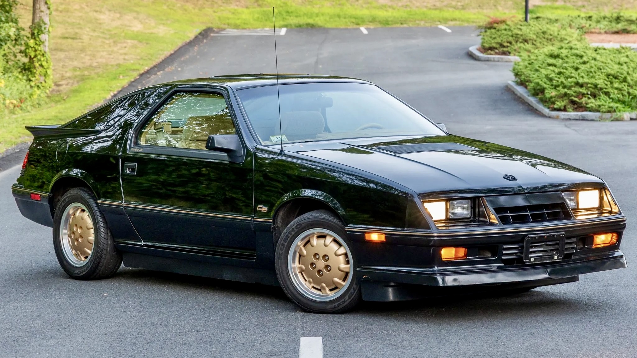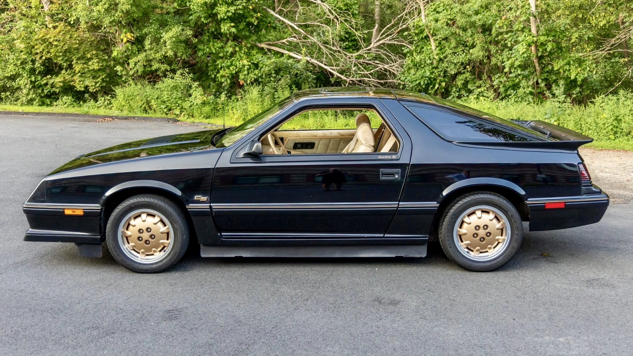 The Daytona was Dodge’s answer to cars like the Ford Mustang and Chevrolet Camaro, but with a more high-tech, turbocharged twist. This one is finished in black with gold striping and trim accents that scream 1980s performance. Highlights include a removable sunroof panel, a rear spoiler, a rear window wiper, body-color trim, CS fender badging, and a single exhaust tip. It sits on bronze-finished 15-inch alloy wheels wrapped in 225/50 Kumho Ecsta AST tires, keeping the stance period-correct.