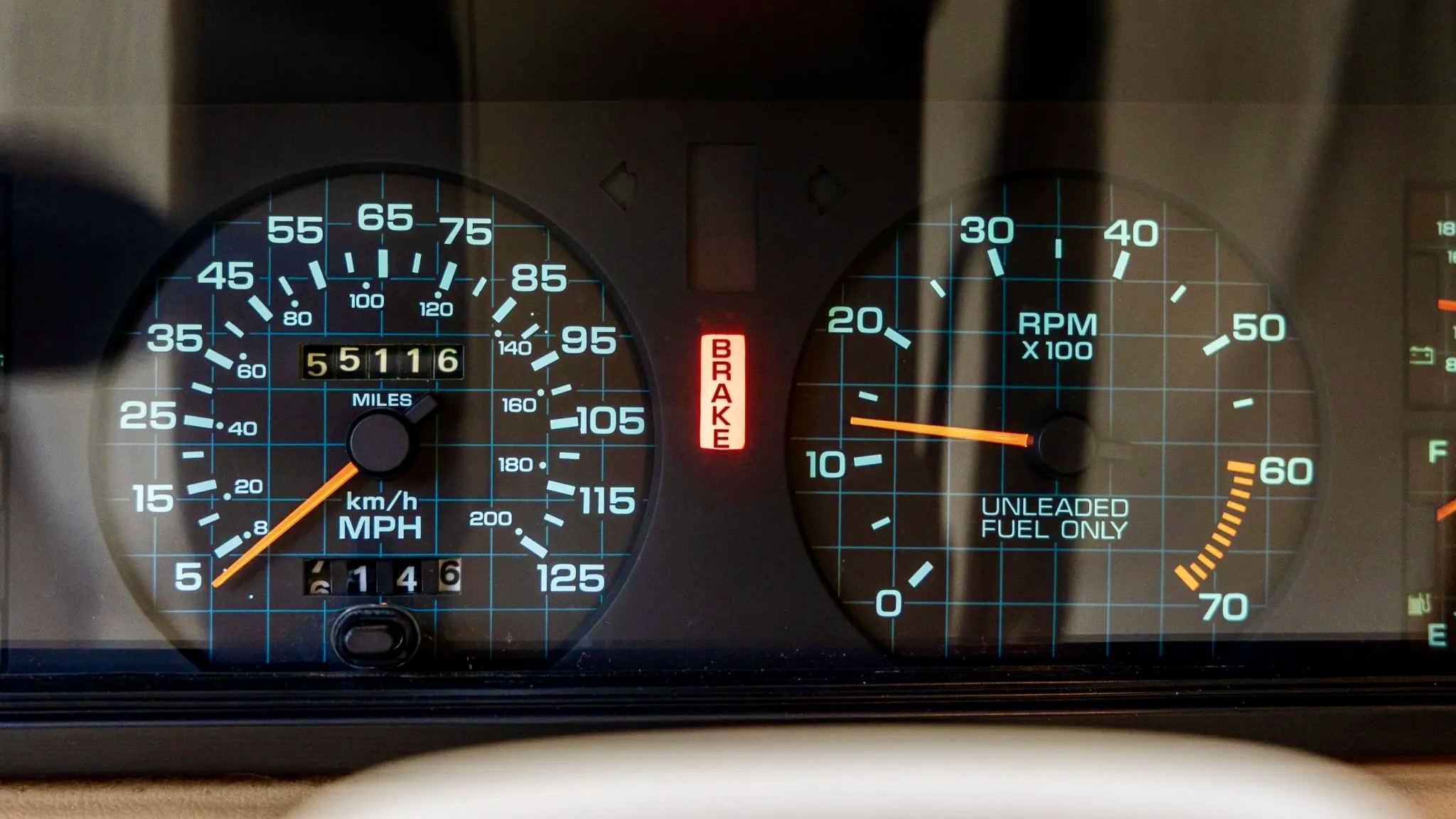 Step inside, and it’s straight back to 1986. The beige cloth bucket seats feature patterned inserts, with matching rear folding seats and door panels. The driver faces a leather-wrapped steering wheel with a 125-mph speedometer, a tach with a 6,000-rpm redline, and auxiliary gauges for oil pressure, coolant temperature, voltage, and fuel level. A factory-installed boost gauge is mounted in the center stack, reminding you that this isn’t just another economy coupe.