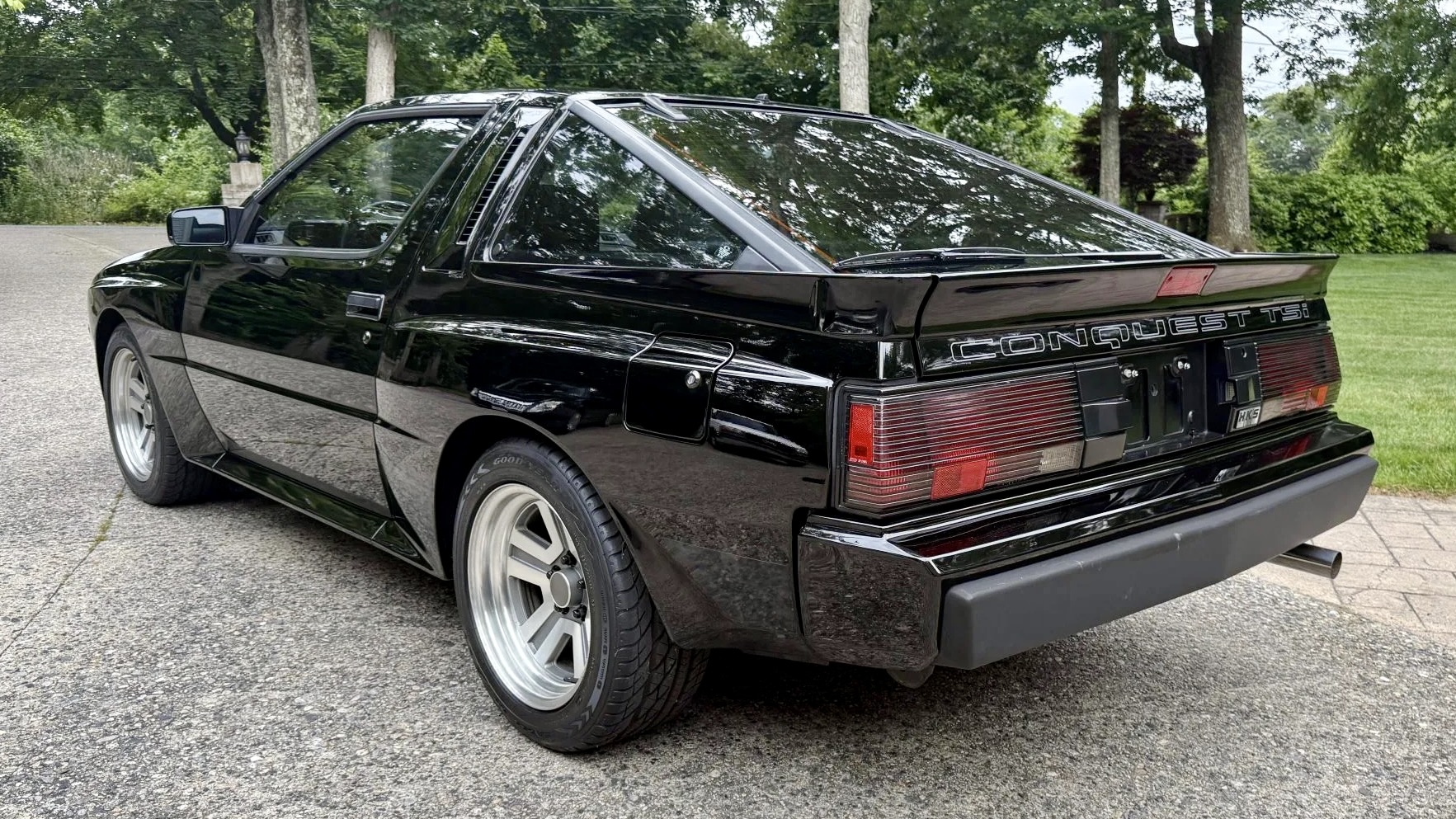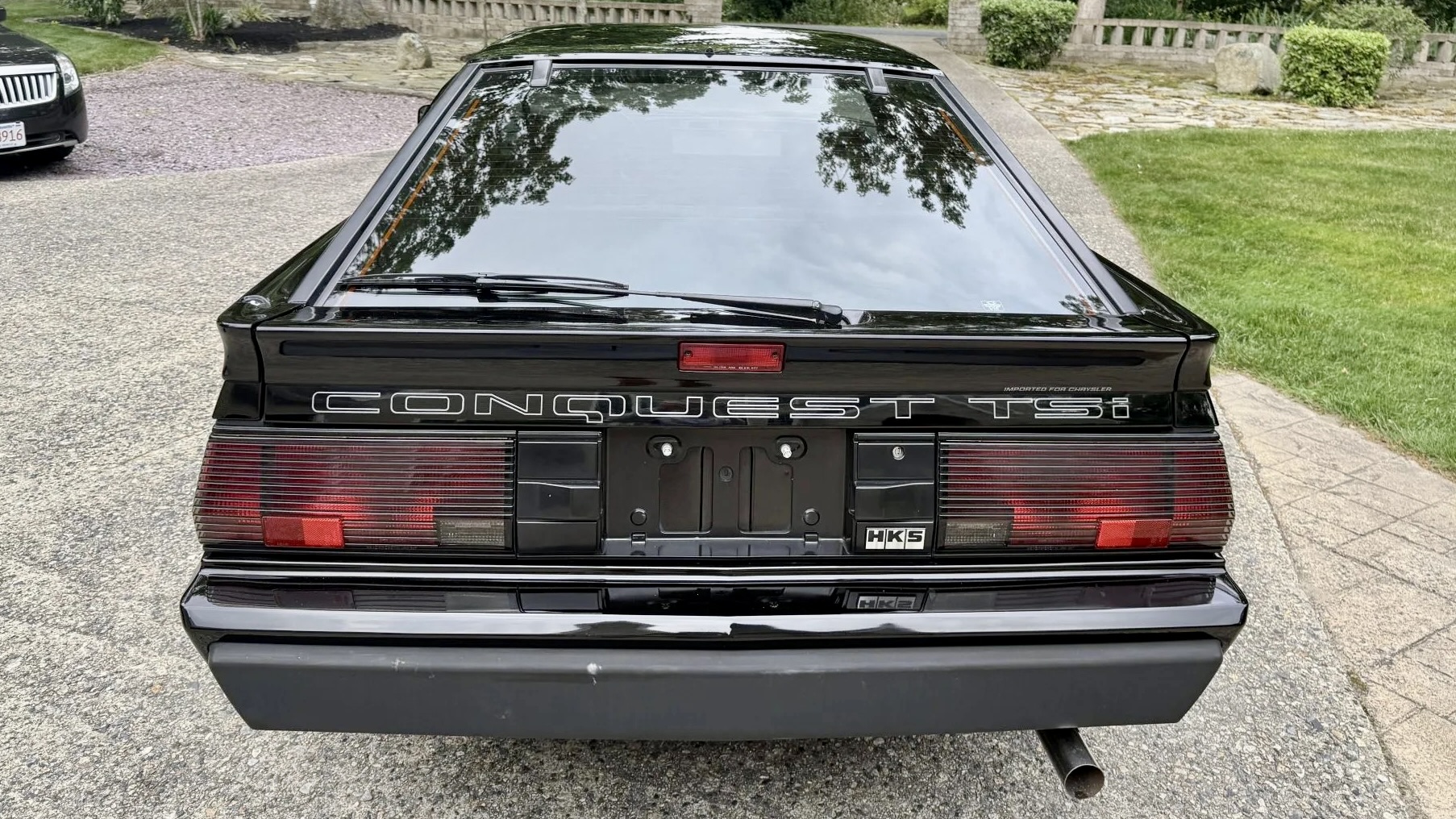 Finished in factory PX1 Black, this widebody Conquest TSi stands out with its flared fenders, pop-up headlights, integrated fog lights, and a factory rear spoiler. A subtle HKS exhaust setup out back hints at the performance potential under the hood, while the original 16-inch alloy wheels are wrapped in Goodyear rubber and sit in front of four-wheel disc brakes.