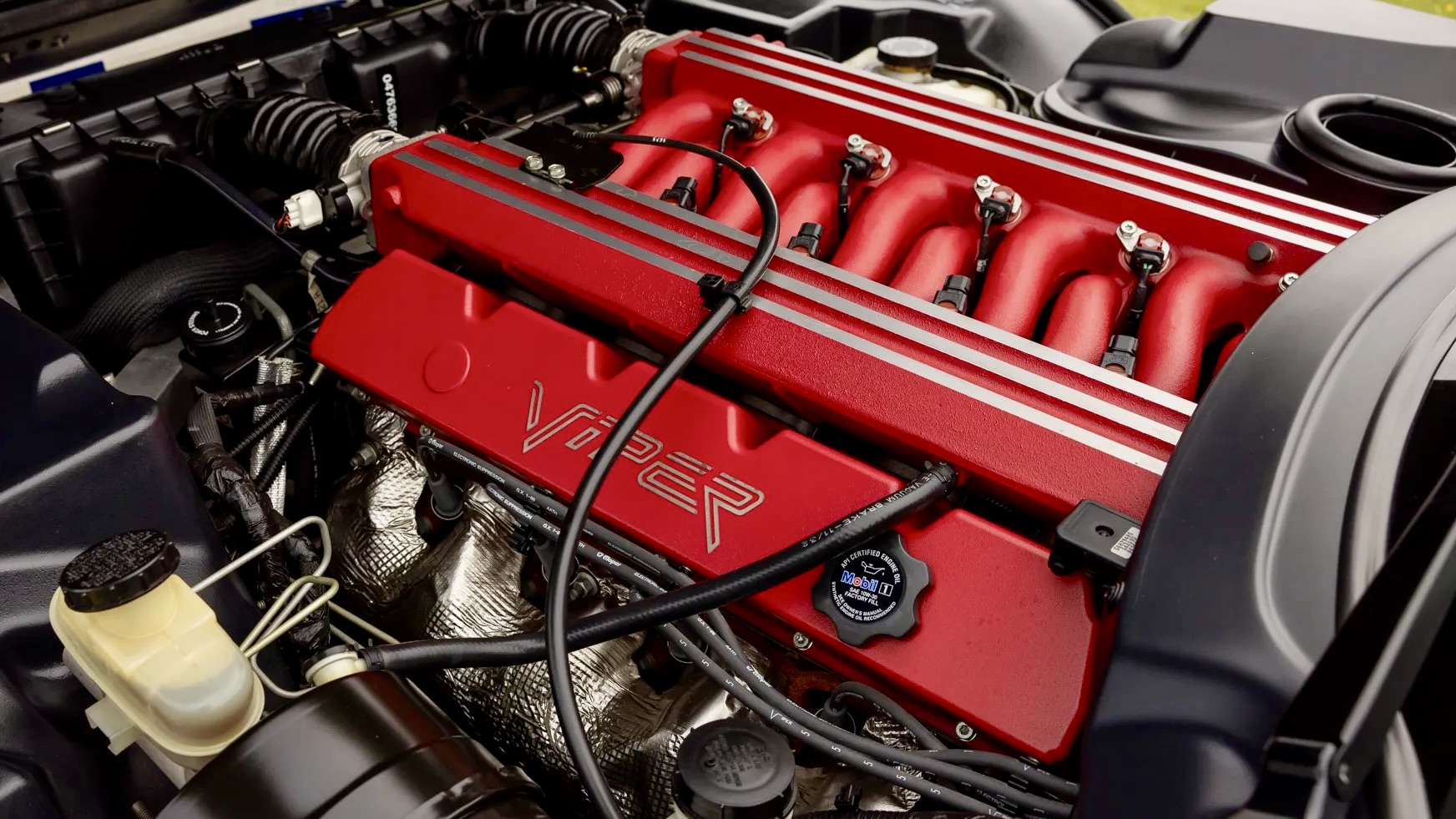 At the heart of the Viper GTS lies the legendary 8.0-liter (488 cubic-inch) VIPER V10 engine, capable of producing 450 horsepower and 490 lb-ft of torque. With its aluminum block and cylinder heads, this powerplant was paired with a 6-speed manual transmission and a limited-slip differential, sending power to the rear wheels. This combination makes for an exhilarating driving experience that combines speed, power, and precision. The car sits on Michelin Pilot SX tires mounted on 17-inch polished alloy wheels, delivering optimal grip and performance.