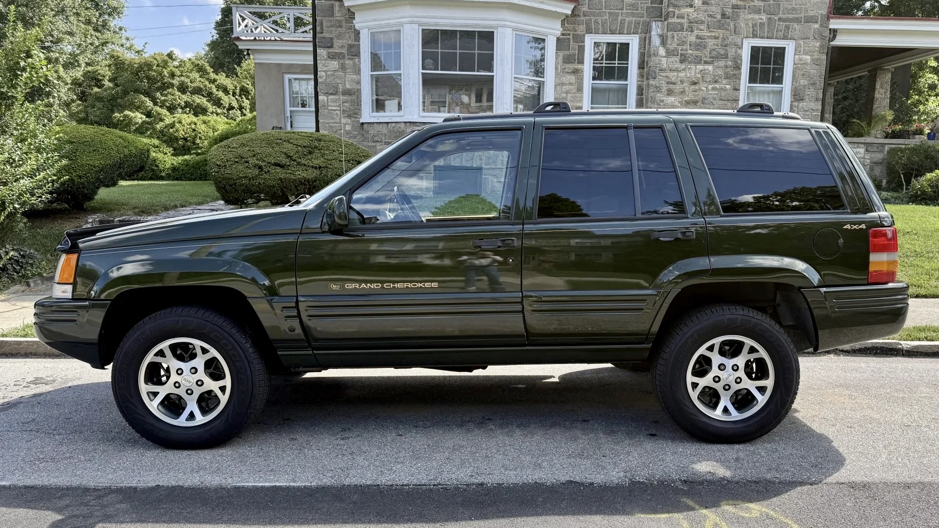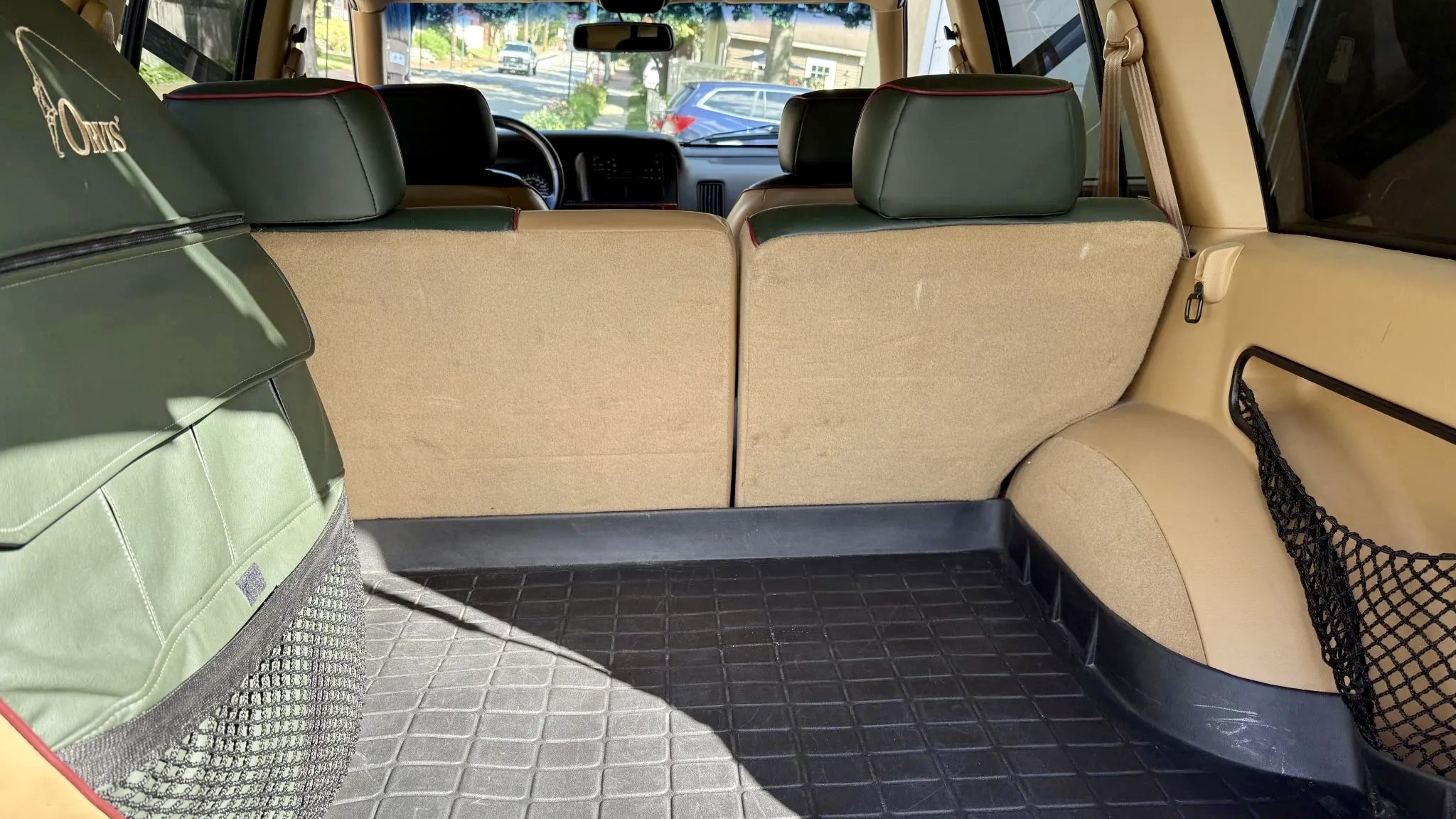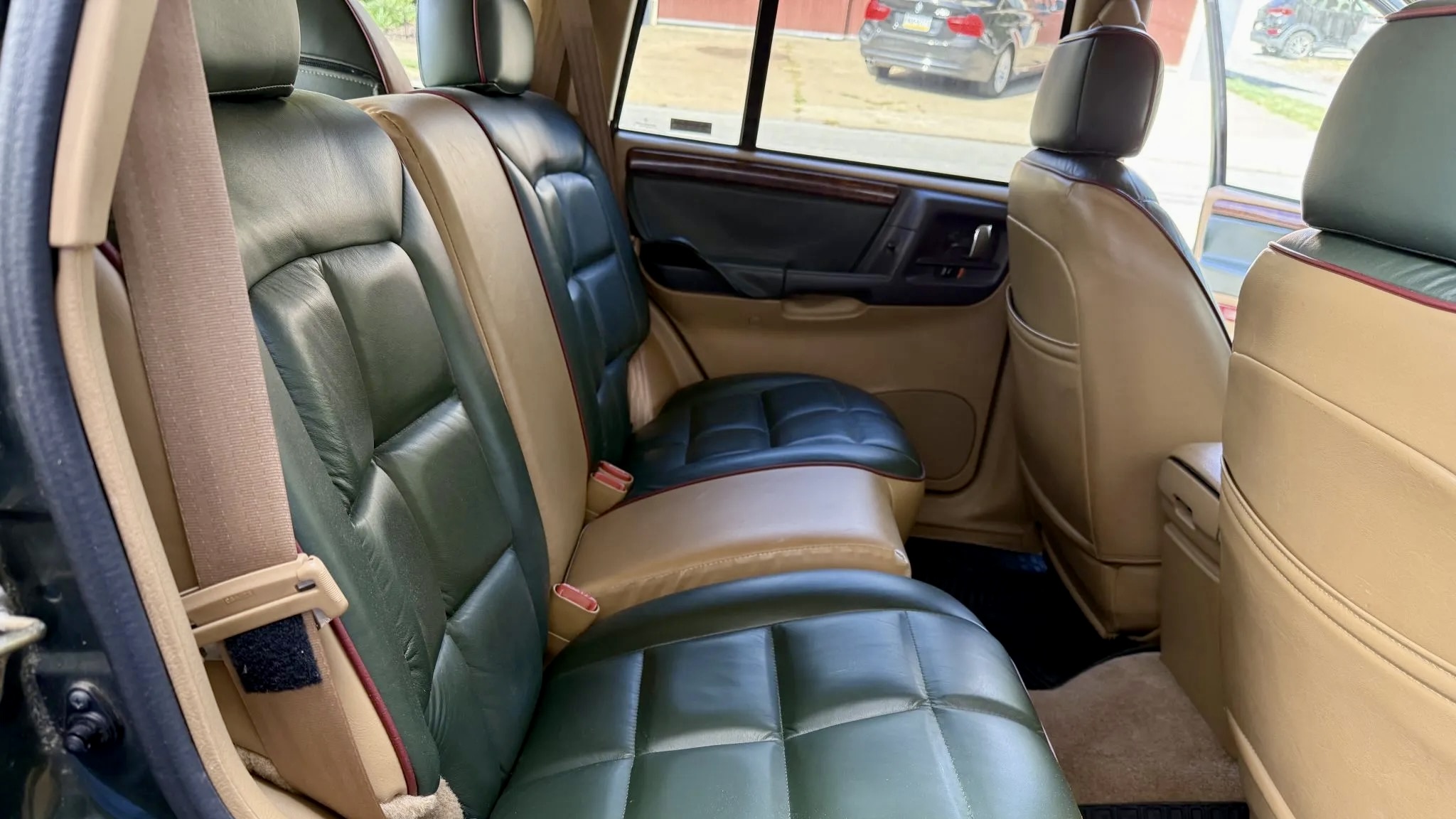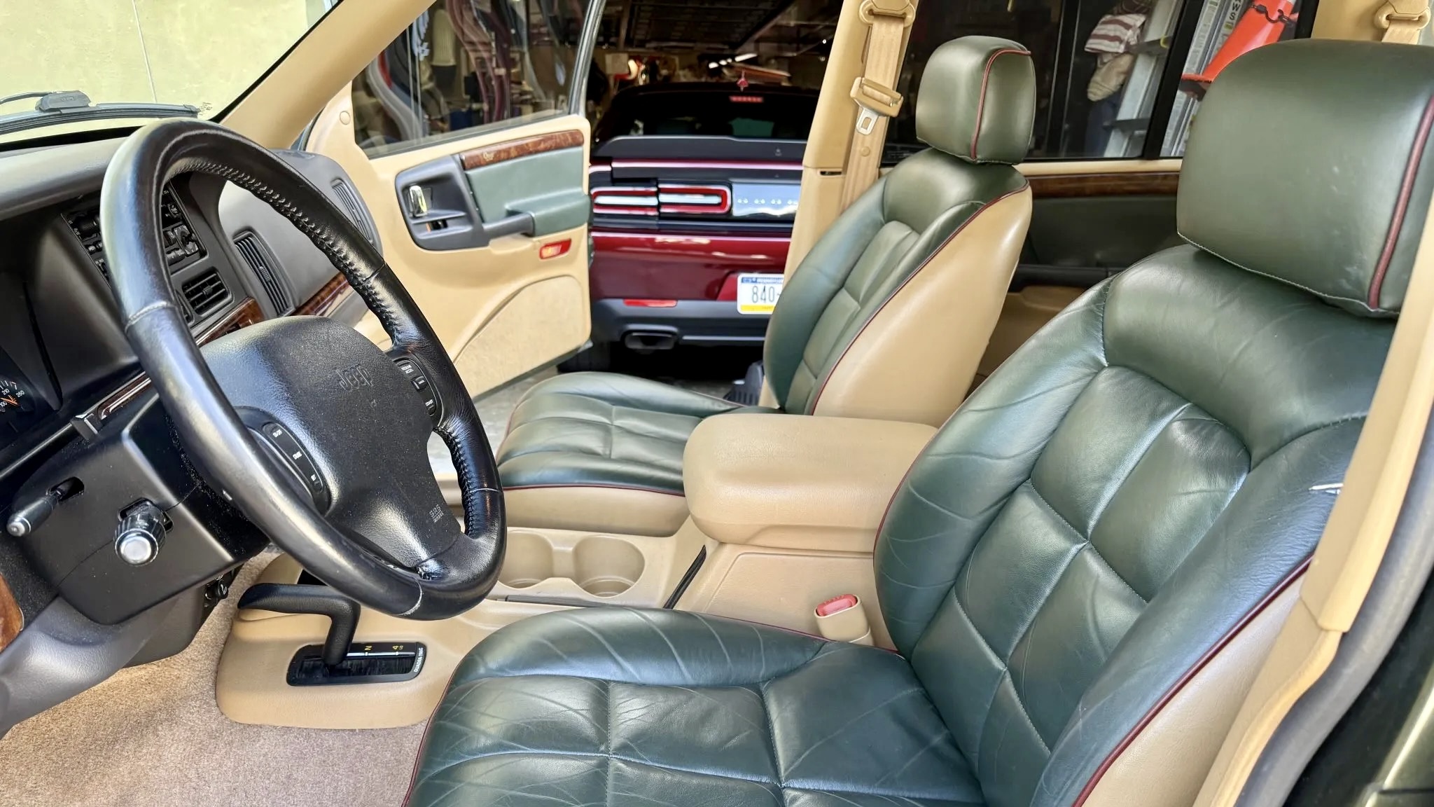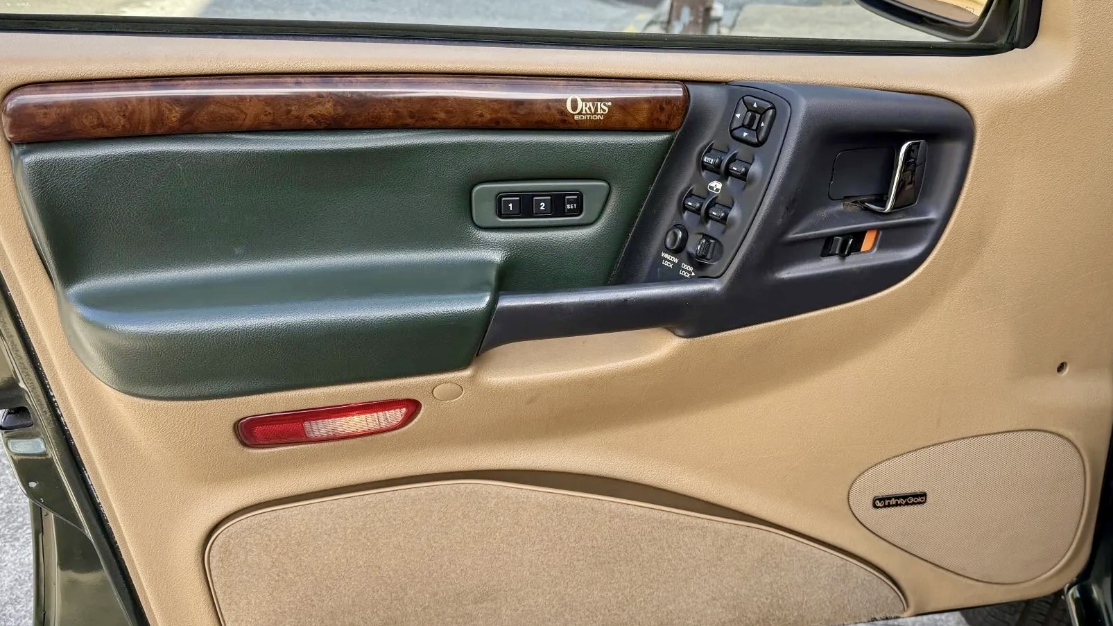 Inside, the cabin captures the best of 1990s Jeep luxury. The Orvis Edition came loaded with two-tone green and Camel leather seats, embossed Orvis logos, and special trim throughout. This example features heated, power-adjustable front seats, an Infinity Gold premium sound system with CD and cassette capability, automatic climate control, and a power sunroof. Despite some loosened trim on the right rear door, the overall interior remains impressively well-kept for its age.