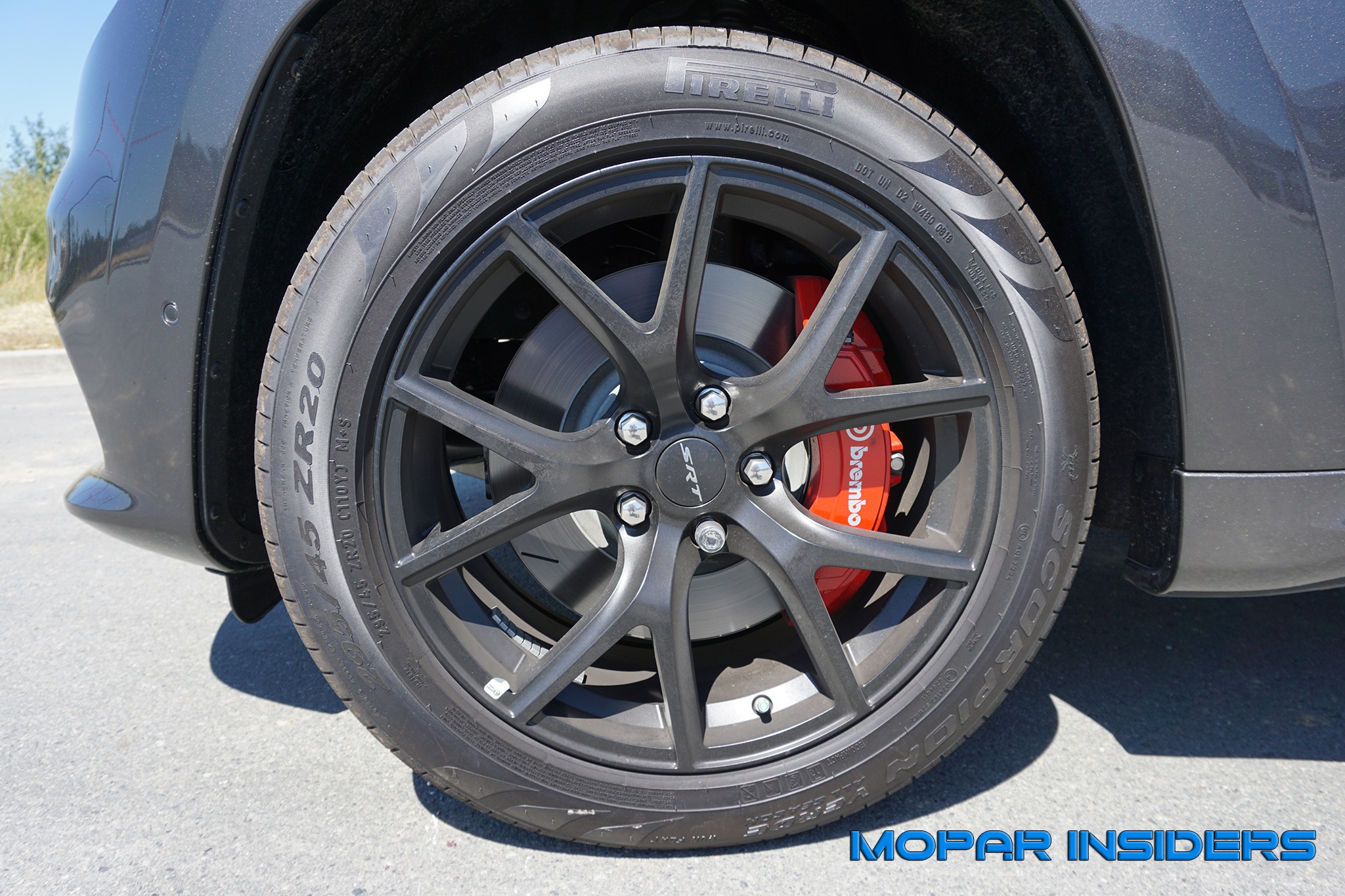 I recently reviewed the Grand Cherokee SRTs cousin the 2018 Dodge Durango SRT and I instantly noticed a few differences driving the Grand Cherokee. Compared to the Durango the Grand Cherokee has a 5.1 inch shorter wheelbase, is 11.4 inches shorter overall and weighs 406lbs less. While on paper the performance numbers are very close between the Grand Cherokee SRT and the Durango SRT, in the real world the Grand Cherokee feels just a little bit more nimble and a little bit quicker. On the road in auto mode the ride is smooth and the Jeep corners near flat, Sport and Track modes each up the steering effort, throttle sensitivity, suspension damping and transmission shift speed respectively. In track mode the Grand Cherokee SRT really comes alive, downshifting in corners and holding gears right in the powerband for corner exit. While I couldn’t try out launch control, a little bit of brake torquing and flooring the gas resulted in violently quick launches with almost no wheelspin. The Grand Cherokee SRT will get to 60 MPH in 4.3 seconds and run the quarter in 12.8 on its way to a top speed of 160MPH. 6 piston Brembos up front with 4 piston Brembos in the rear bring the Grand Cherokee SRT to a halt quickly with no drama, pedal feel is also excellent.
