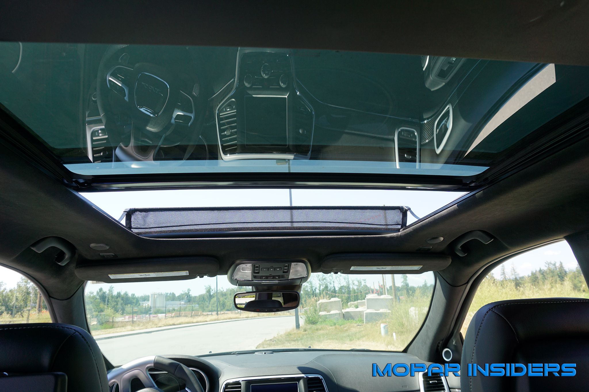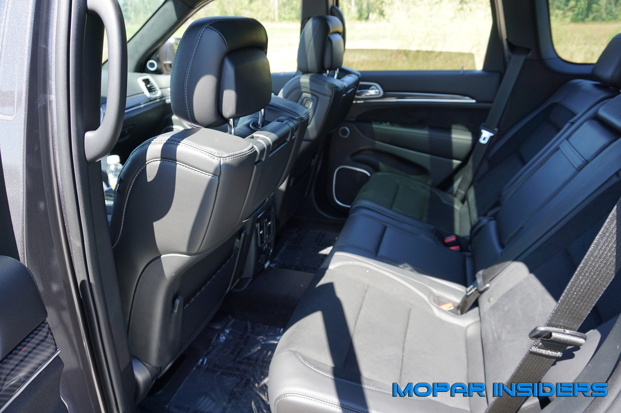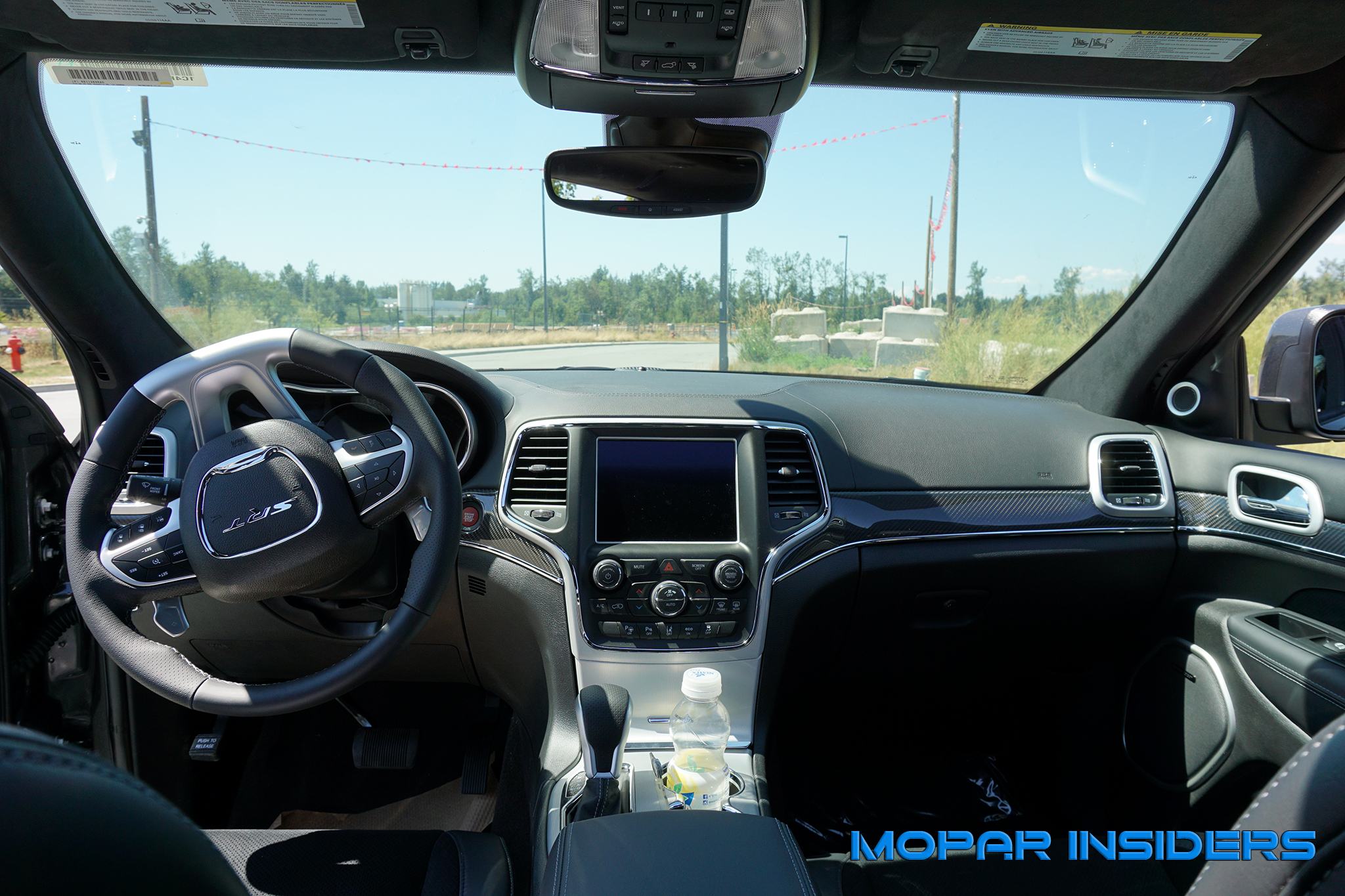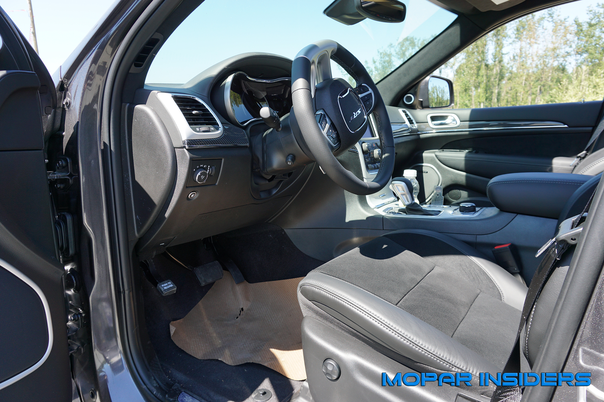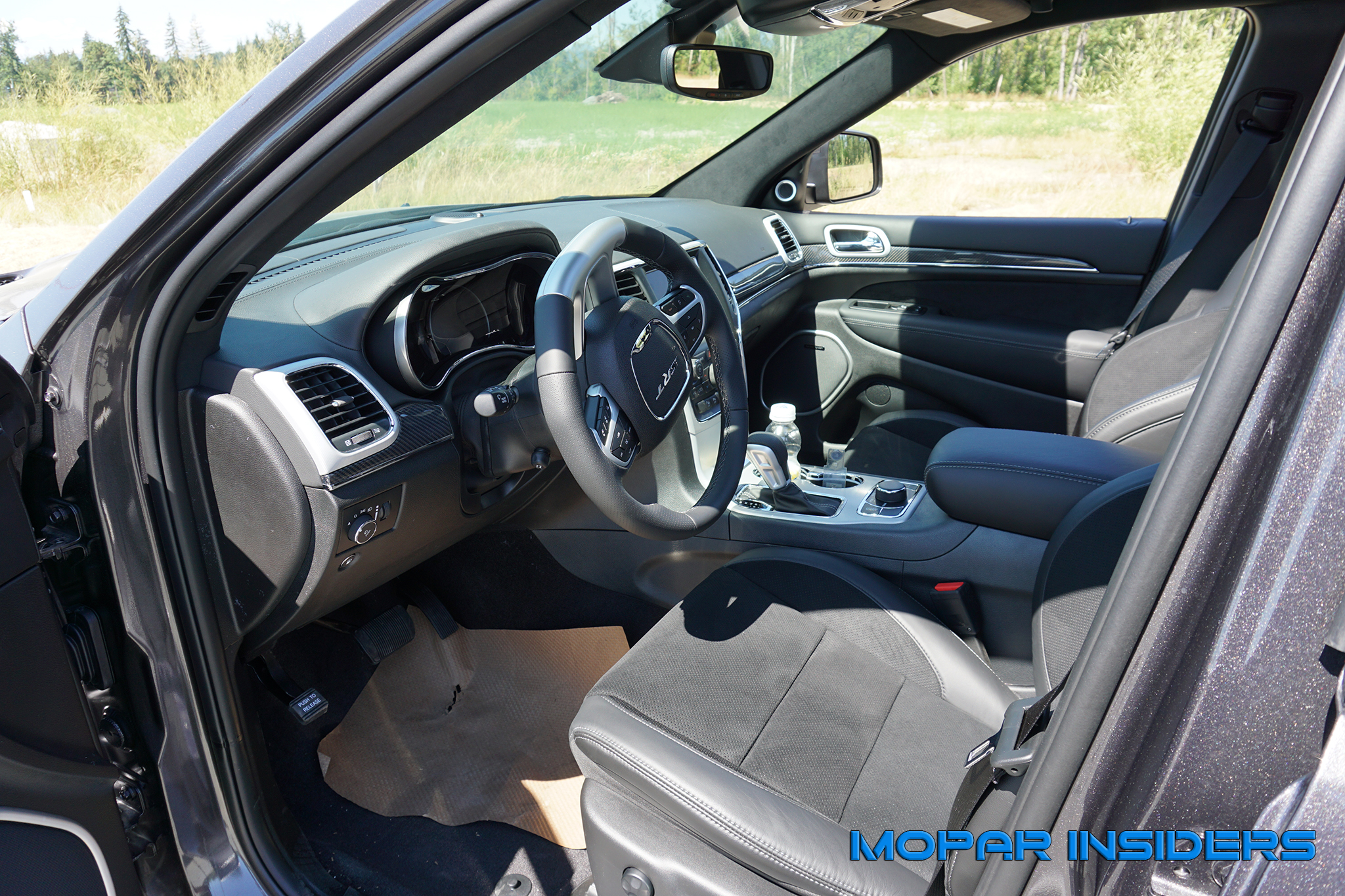 Jeep did an incredibly good job with the interior, all materials are of very high quality and I’m a big fan of the black alcantara headliner and a-pillars. Gloss carbon fiber and silver trim is abundant, setting off the all black interior. The SRT gets a unique flat bottomed steering wheel with a nice thick leather wrapped rim. The steering wheel also has nice hand grips and perforated leather sections. A panoramic sunroof makes the interior feel airy, while back seat passengers get a reclining seatback and tv monitors with audio/video and HDMI inputs if so equipped. I’m just over 6 feet tall and found it easy to get comfortable in all seating positions. Seats are leather with alcantara seating surfaces, heated and cooled in front and heated in the rear. As with the Challenger 392 Shaker I reviewed, I found the cooled seats work much better with alcantara than standard leather. Apple carplay and Android Auto is now standard with the new UConnect 4C infotainment system which features crisper graphics and a faster processor than the older UConnect units.