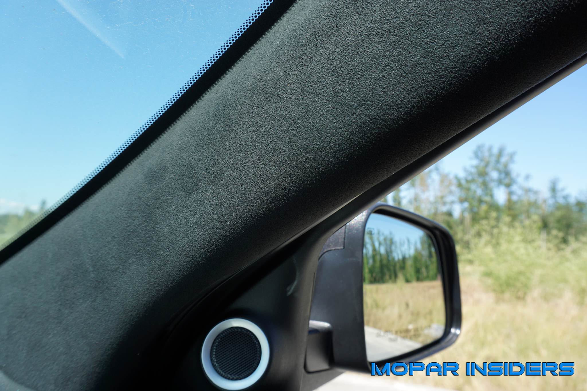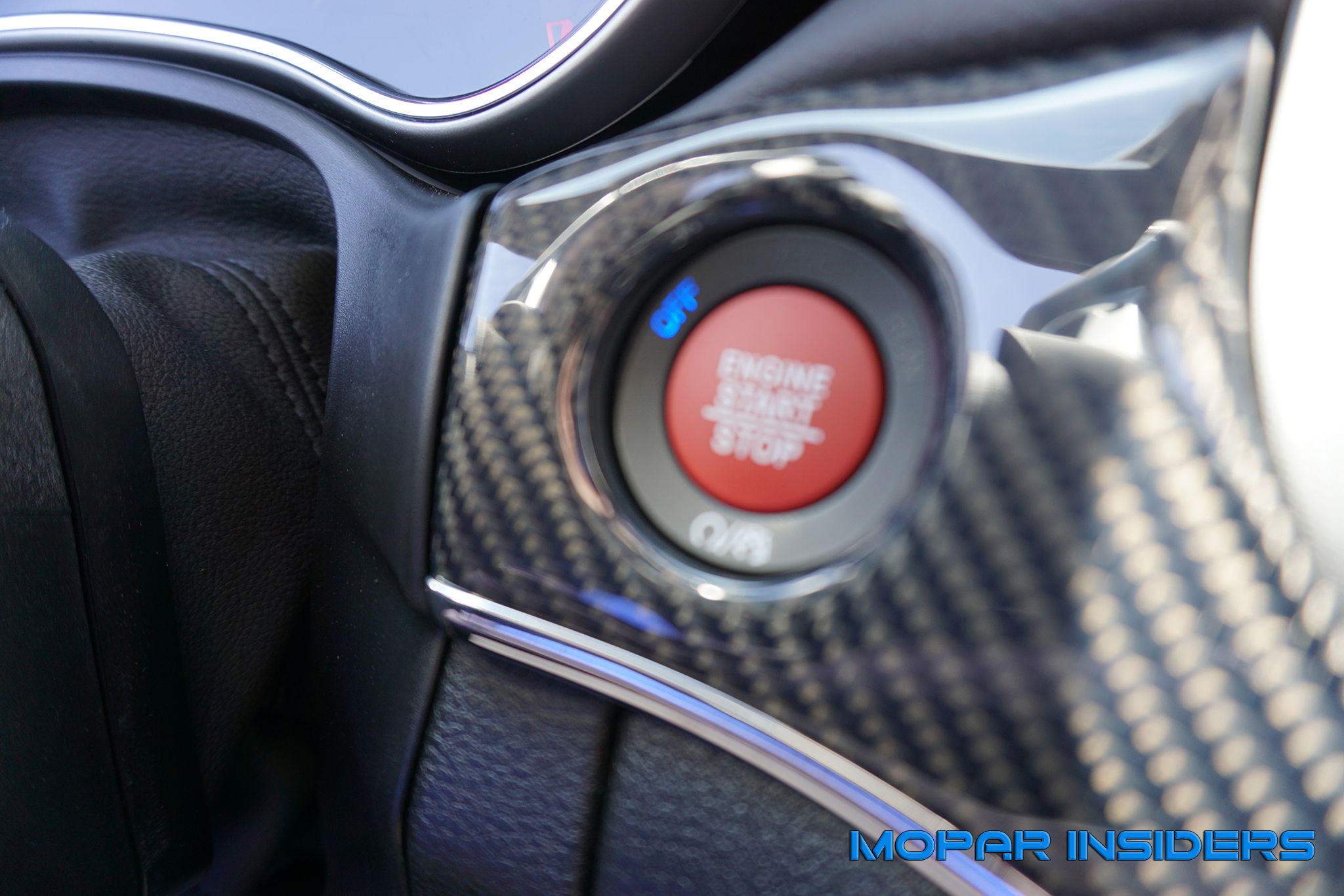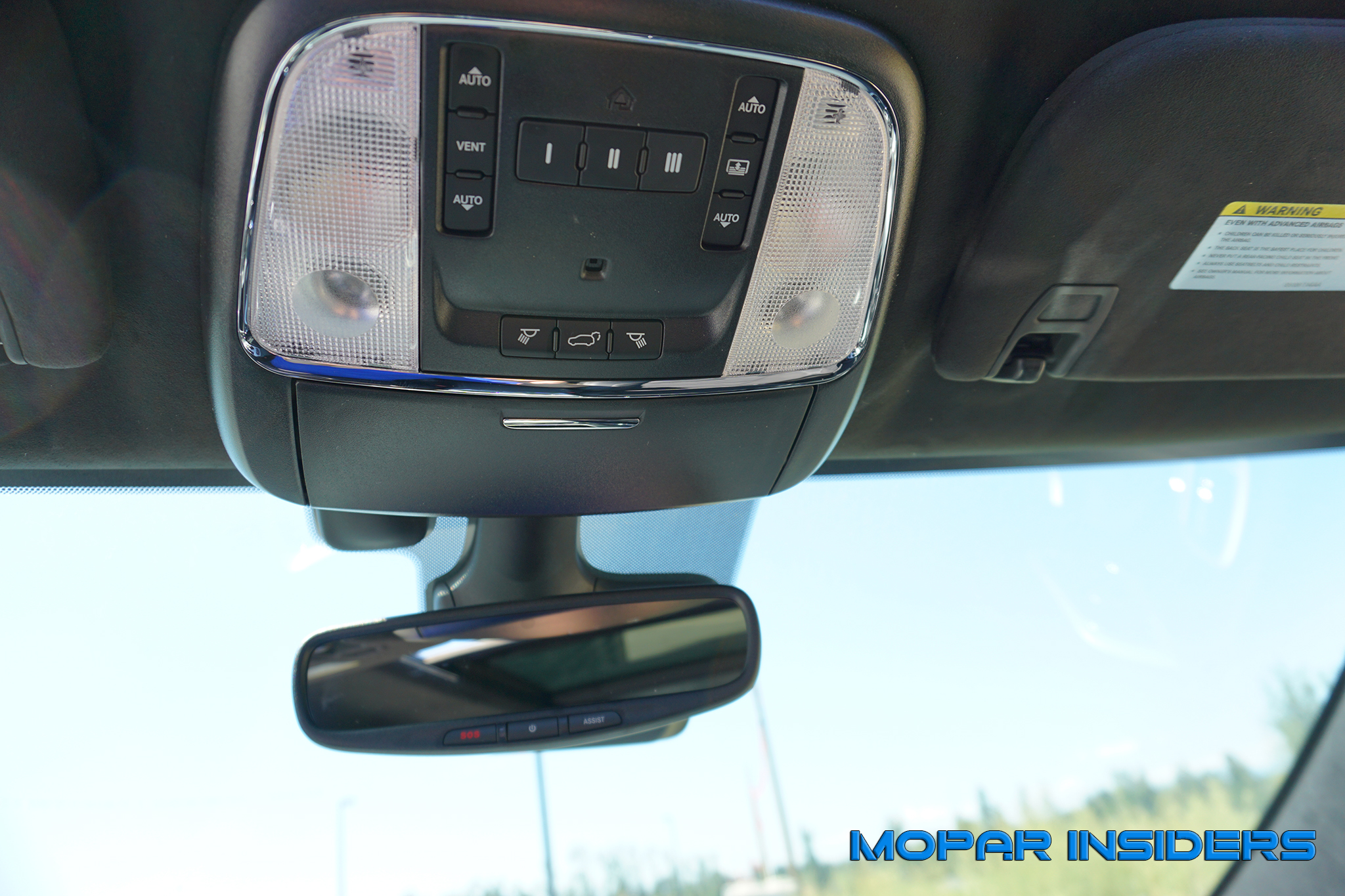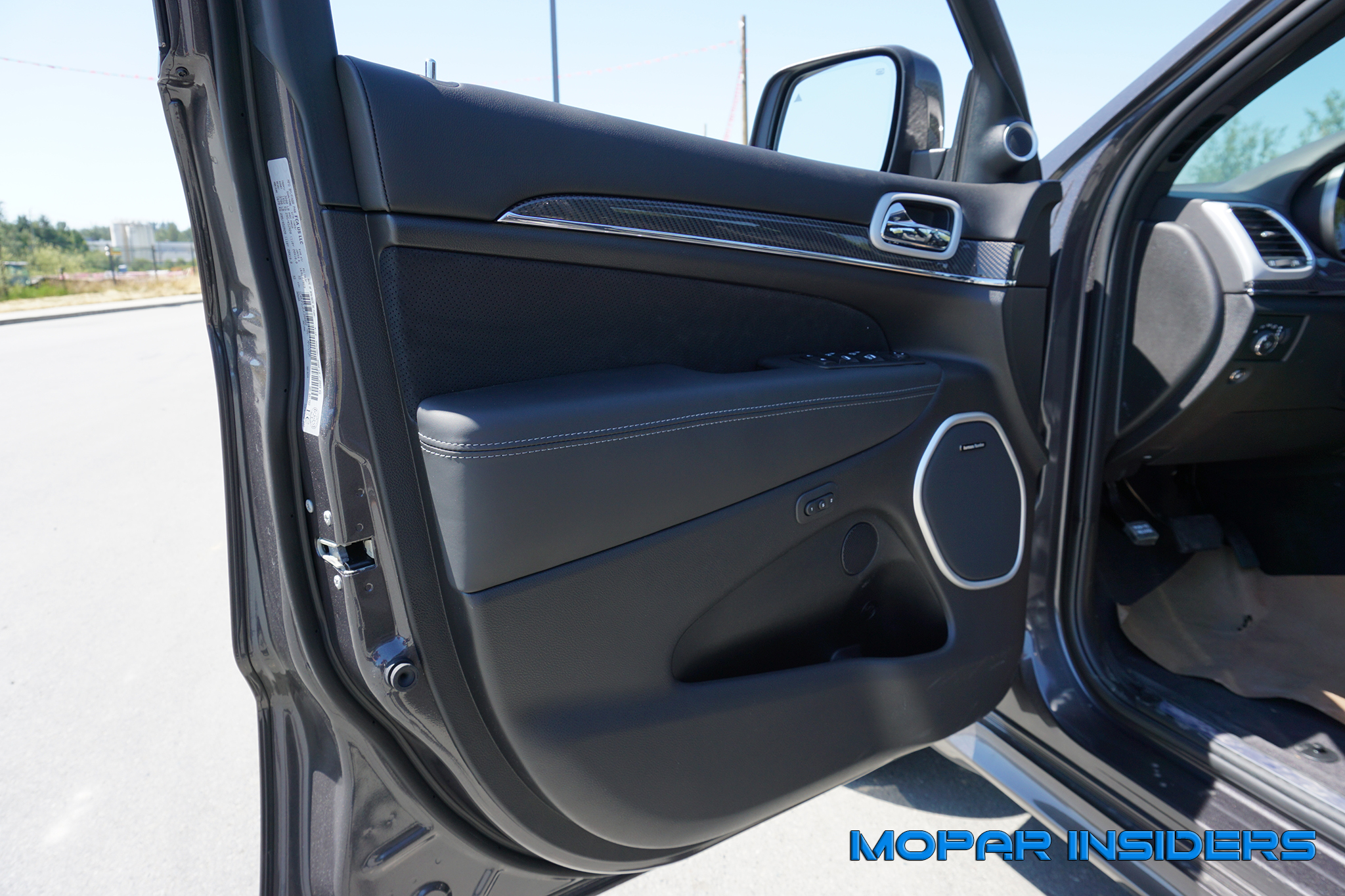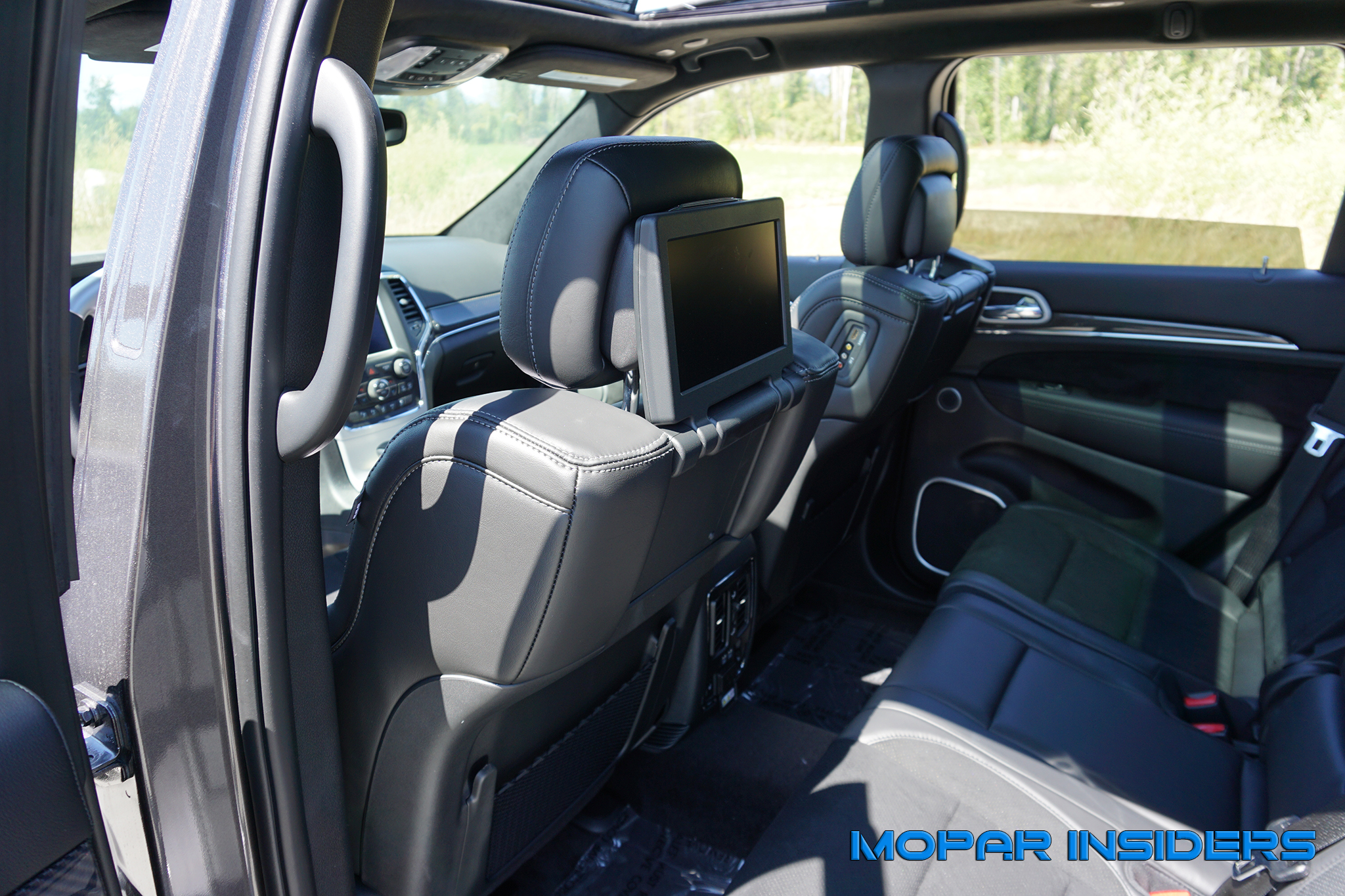 Jeep did an incredibly good job with the interior, all materials are of very high quality and I’m a big fan of the black alcantara headliner and a-pillars. Gloss carbon fiber and silver trim is abundant, setting off the all black interior. The SRT gets a unique flat bottomed steering wheel with a nice thick leather wrapped rim. The steering wheel also has nice hand grips and perforated leather sections. A panoramic sunroof makes the interior feel airy, while back seat passengers get a reclining seatback and tv monitors with audio/video and HDMI inputs if so equipped. I’m just over 6 feet tall and found it easy to get comfortable in all seating positions. Seats are leather with alcantara seating surfaces, heated and cooled in front and heated in the rear. As with the Challenger 392 Shaker I reviewed, I found the cooled seats work much better with alcantara than standard leather. Apple carplay and Android Auto is now standard with the new UConnect 4C infotainment system which features crisper graphics and a faster processor than the older UConnect units.