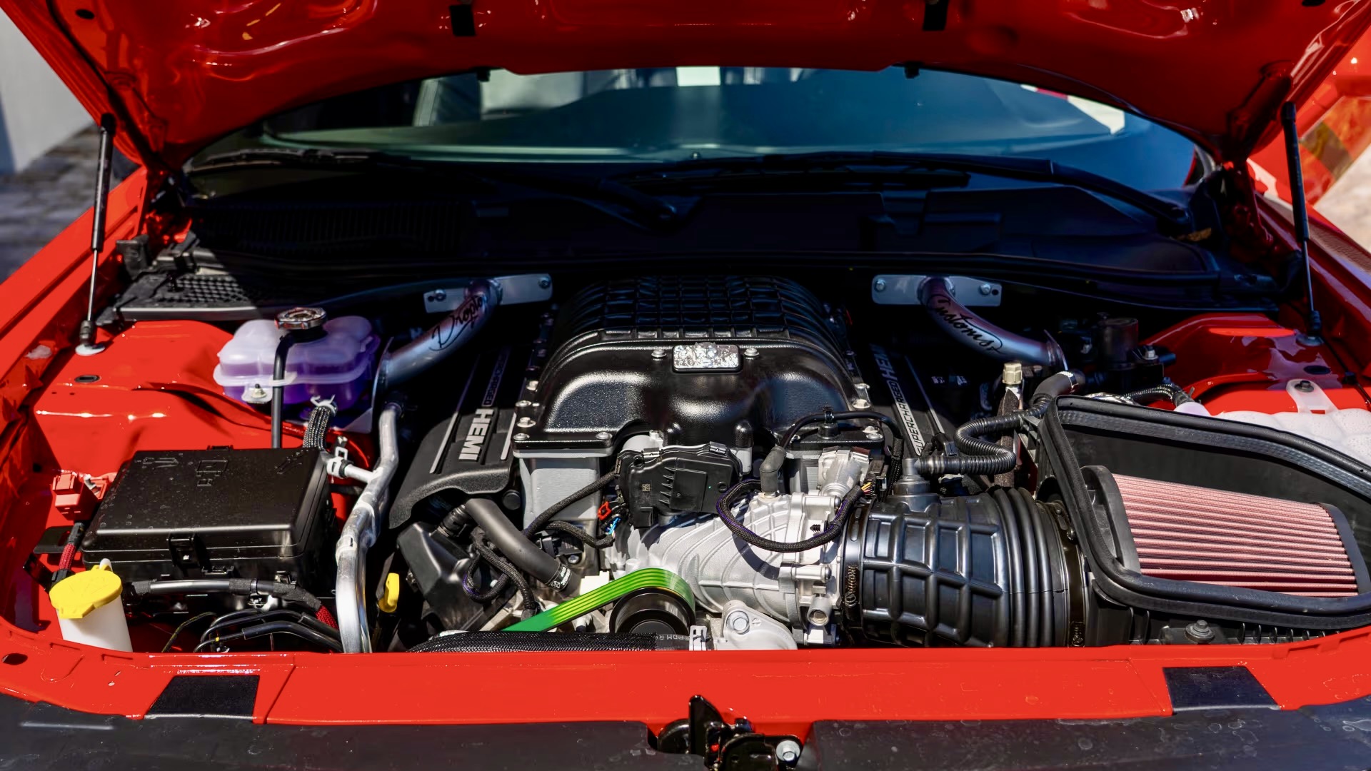 Under the factory Air-Grabber hood sits Dodge’s most powerful engine ever: the supercharged 6.2-liter HEMI® C-170 V8, pumping out 1,025 horsepower and 945 lb-ft of torque on E85 fuel. Even on pump gas (E10), it still delivers 900 horsepower. It features a 3.0-liter IHI supercharger, a 105mm throttle body, and a trick dual-fuel system that adjusts power based on how much ethanol is in the tank. Power goes to the rear wheels through an 8-speed TorqueFlite automatic transmission, backed by a transbrake, a 3.09 rear end, and 43-spline half shafts.