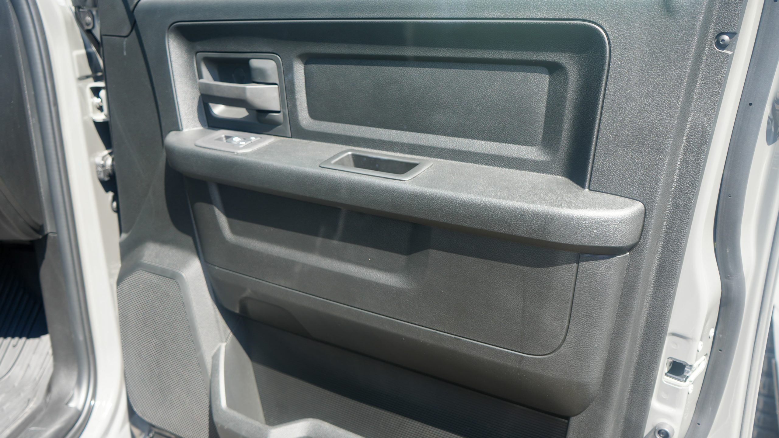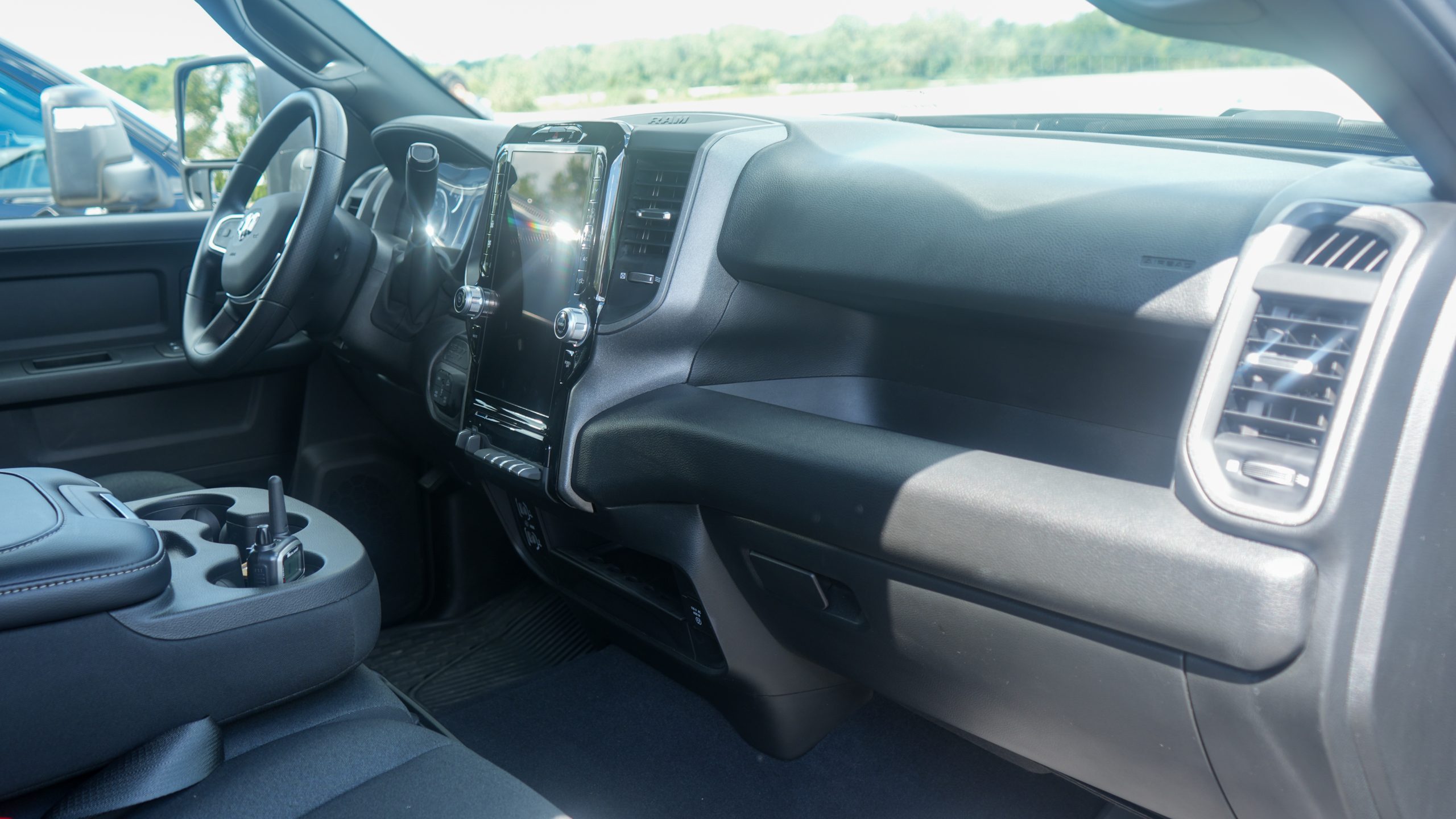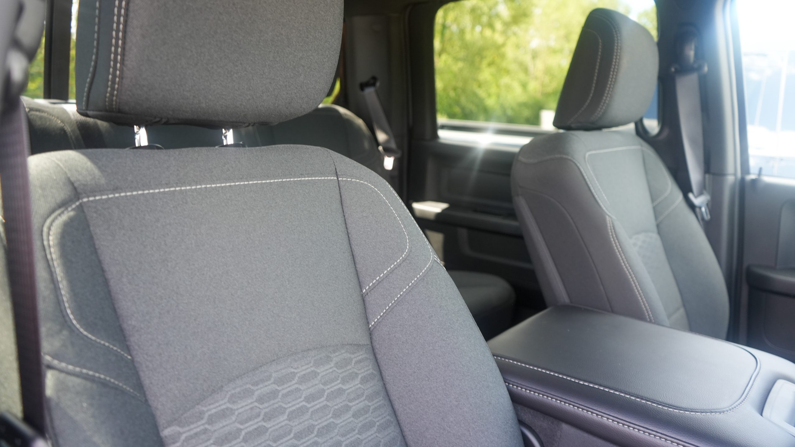 Step inside, and it’s clear this truck was built for utility. Cloth bench seating is standard, and I was glad to see Ram stick with the 6-passenger configuration—something that’s increasingly rare in modern pickups. That center seat folds down into a console with cupholders and a handy storage compartment, giving you the best of both worlds: seating for six when you need it, and extra comfort when you don’t.