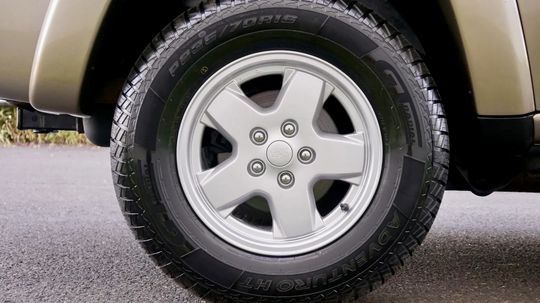 Exterior highlights include a sunroof, fog lights, power-adjustable mirrors, a swing-out tailgate with a flip-up rear window, and a receiver hitch. Fresh 235/70R16 GT Radial Adventuro HT tires are mounted on factory 16-inch alloy wheels, giving it the stock, period-correct look.