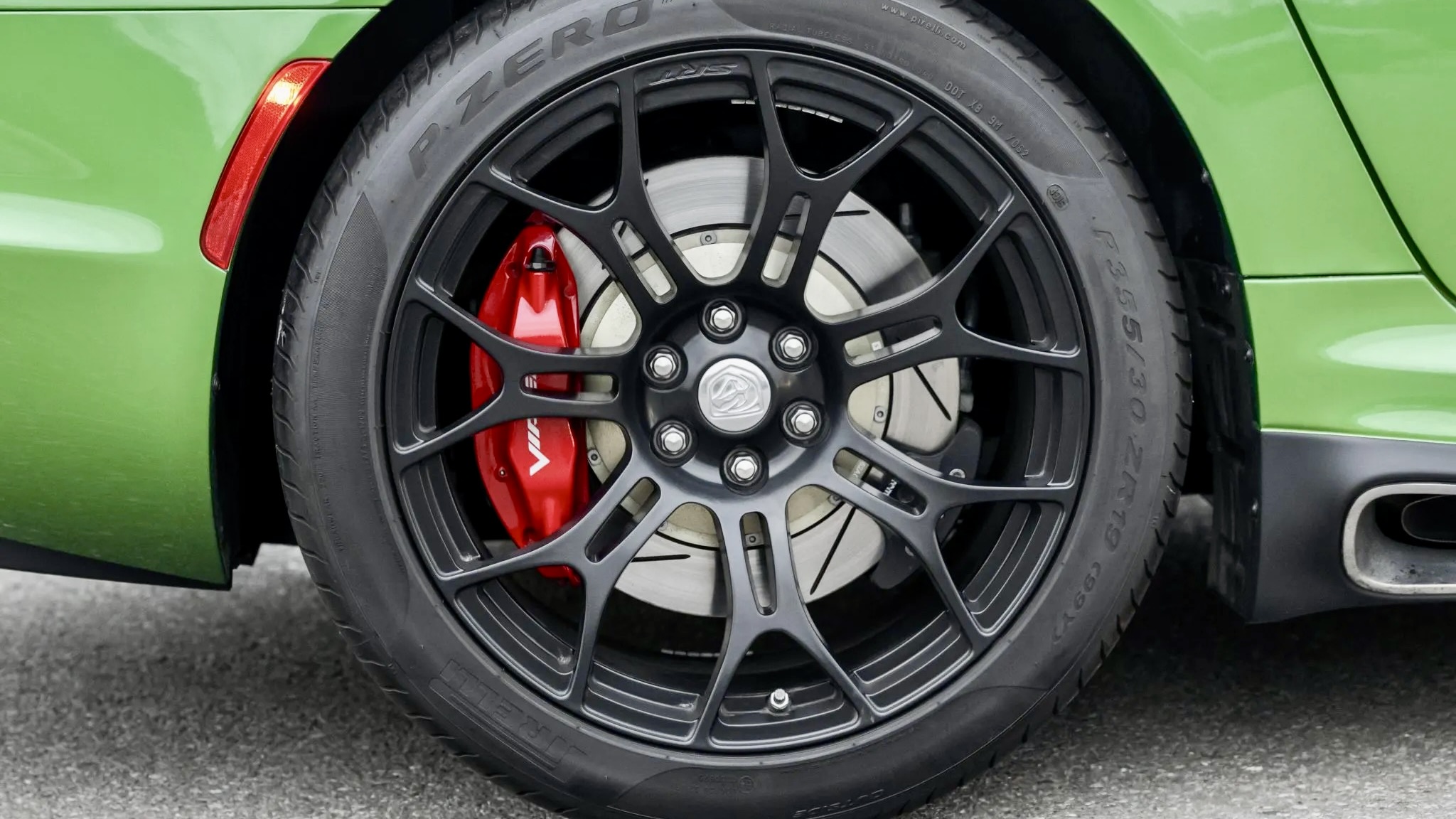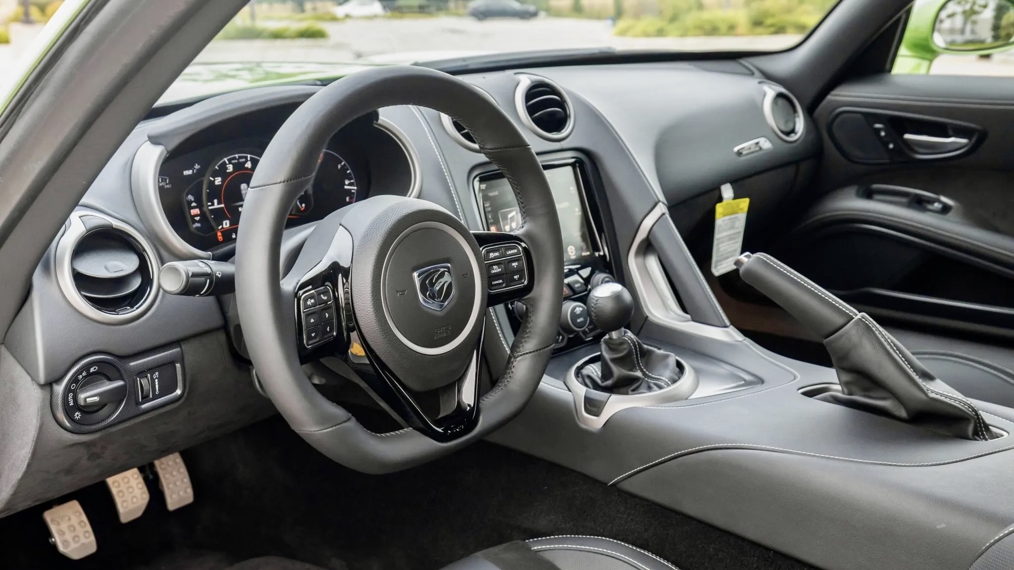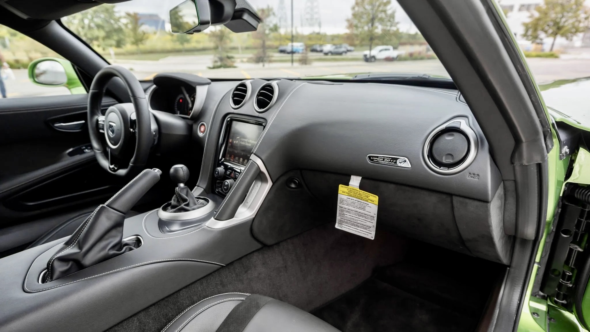 Finished in eye-catching Snakeskin Green, this GTC Coupe stands out even among Vipers. It was optioned with the Advanced Aerodynamic Package, adding a carbon-fiber front splitter and rear spoiler for improved downforce and a track-ready stance. The hood scoop, HID headlights, and side-exit exhaust outlets reinforce the car’s aggressive personality. It rolls on 18-inch front and 19-inch rear Sidewinder II hyper-black wheels wrapped in Pirelli P Zero rubber, with Brembo brakes at each corner ensuring stopping power matches its speed.