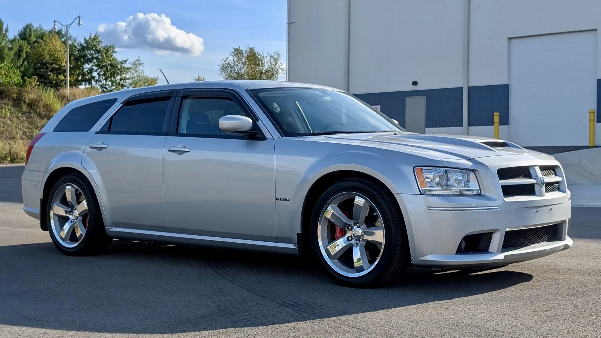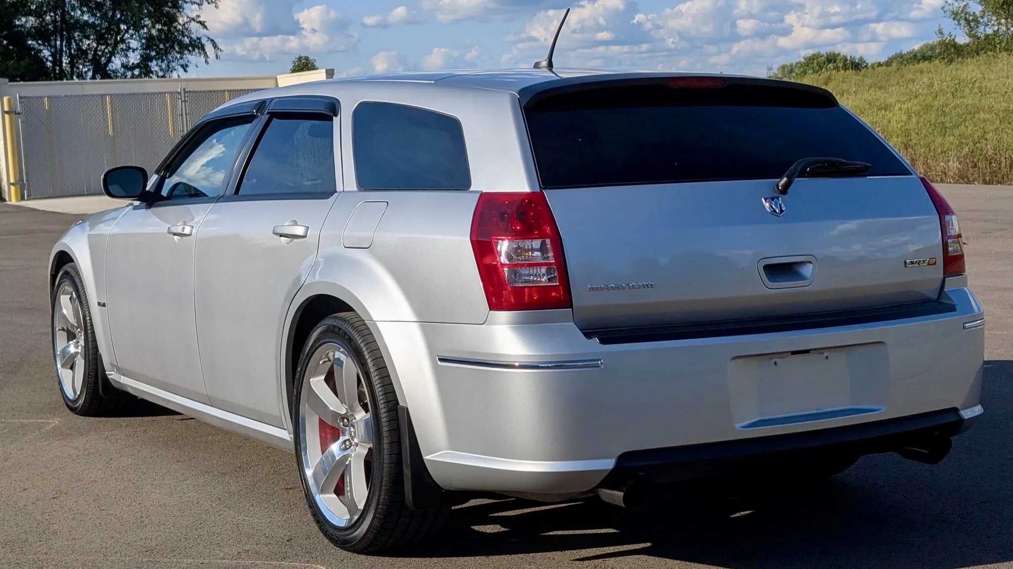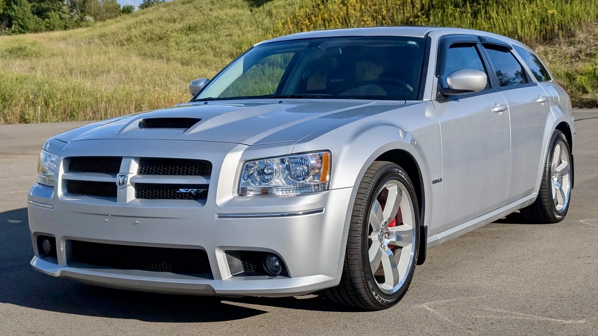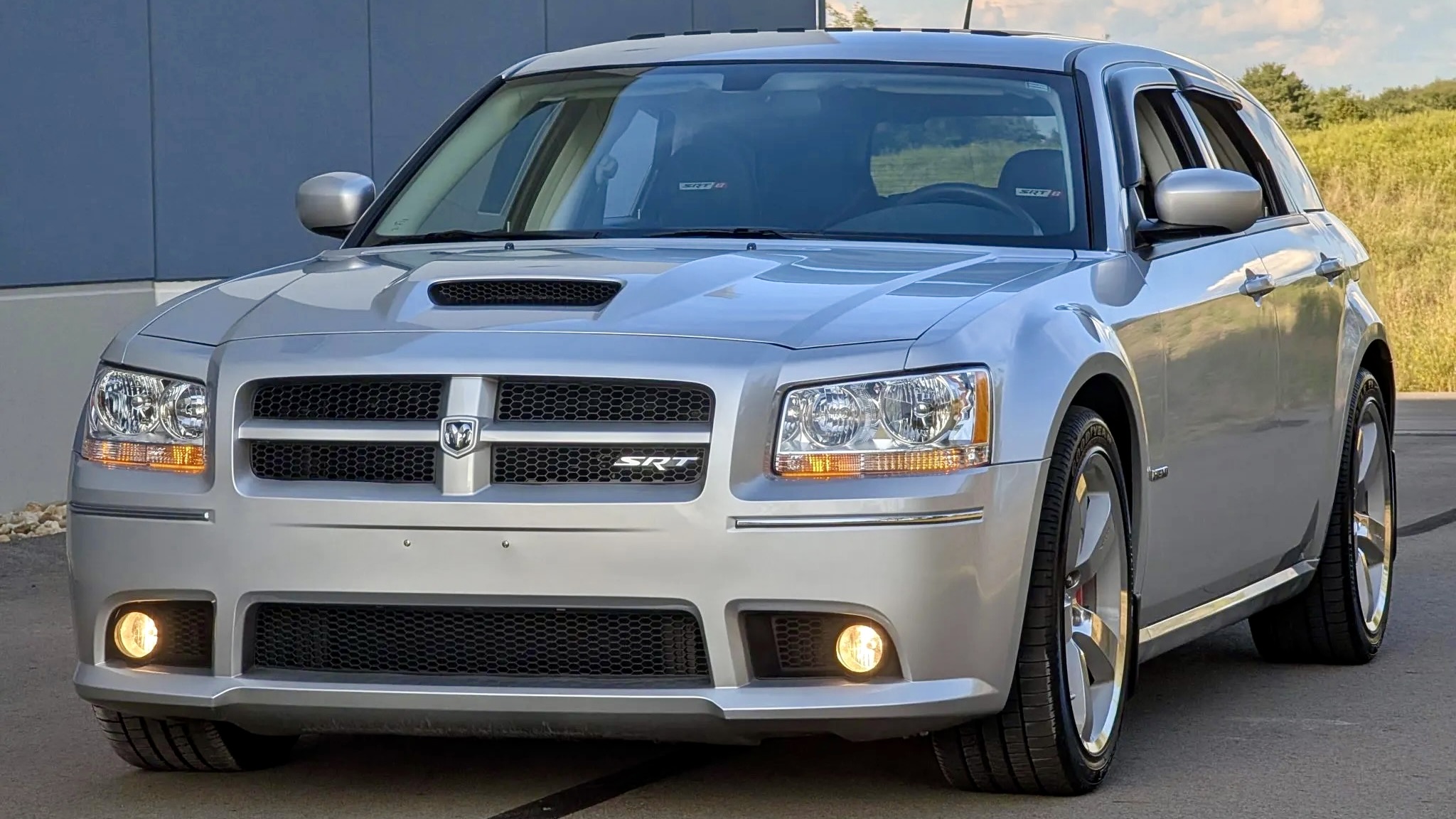 This 2008 Dodge Magnum SRT8 isn’t your run-of-the-mill family hauler. Finished in Bright Silver Metallic (PS2) with SRT-specific bodywork, it projects menace with a hood scoop, aggressive fascia, and roof spoiler. Subtle details like a blacked-out grille, fog lights, dual exhaust outlets, and even side-window rain guards add both flair and functionality. The listing notes a small chip under the front valance, but otherwise, the body presents beautifully—just as you’d expect from a car with only 9,600 miles on the clock.