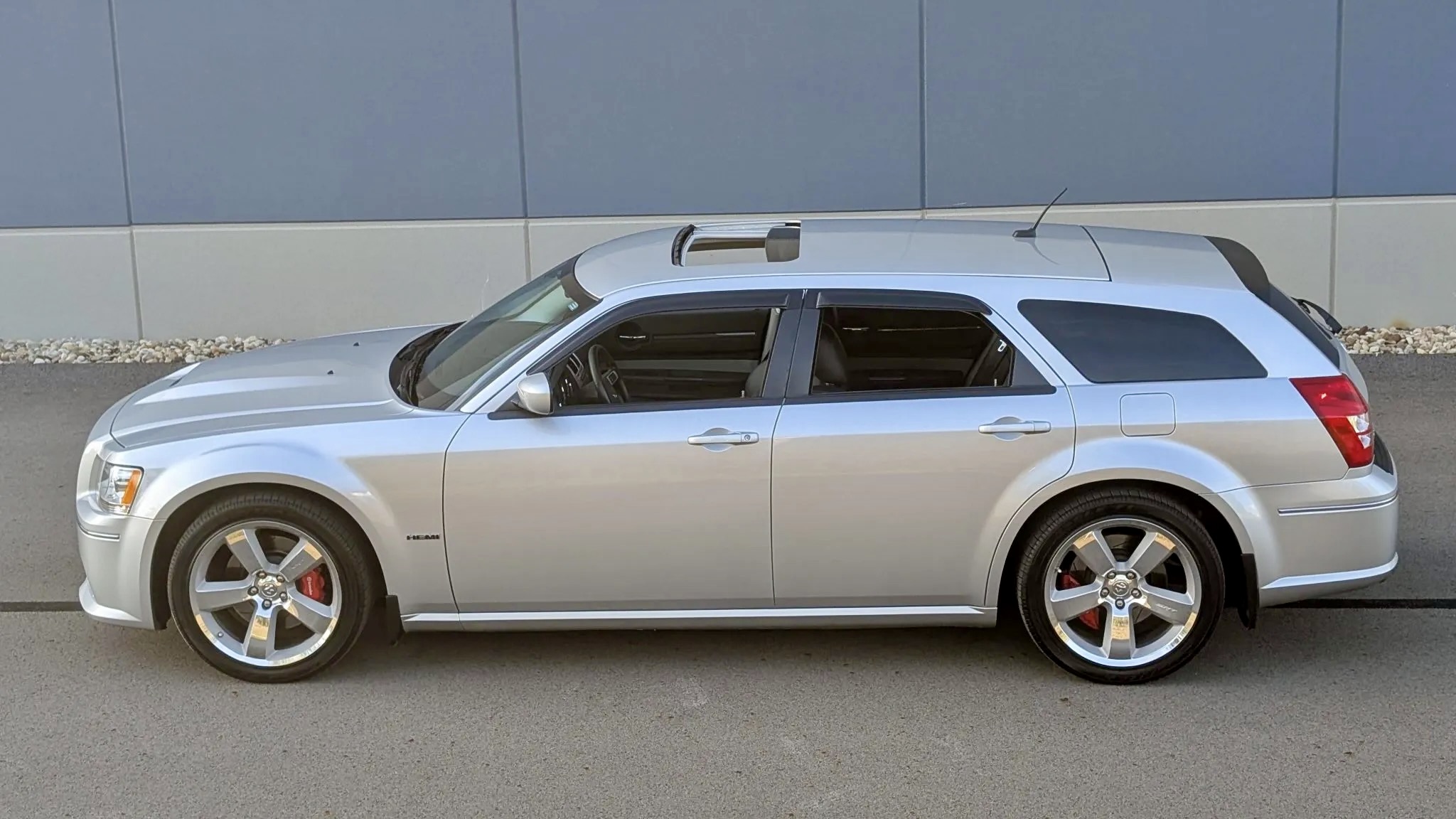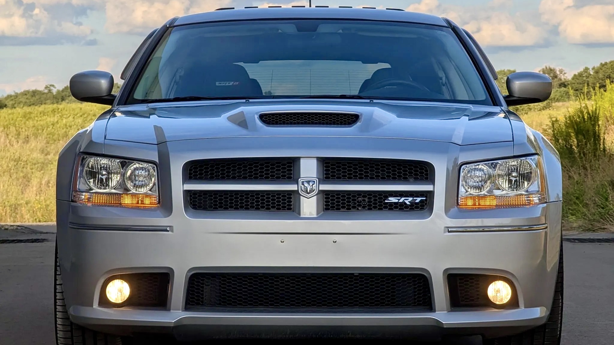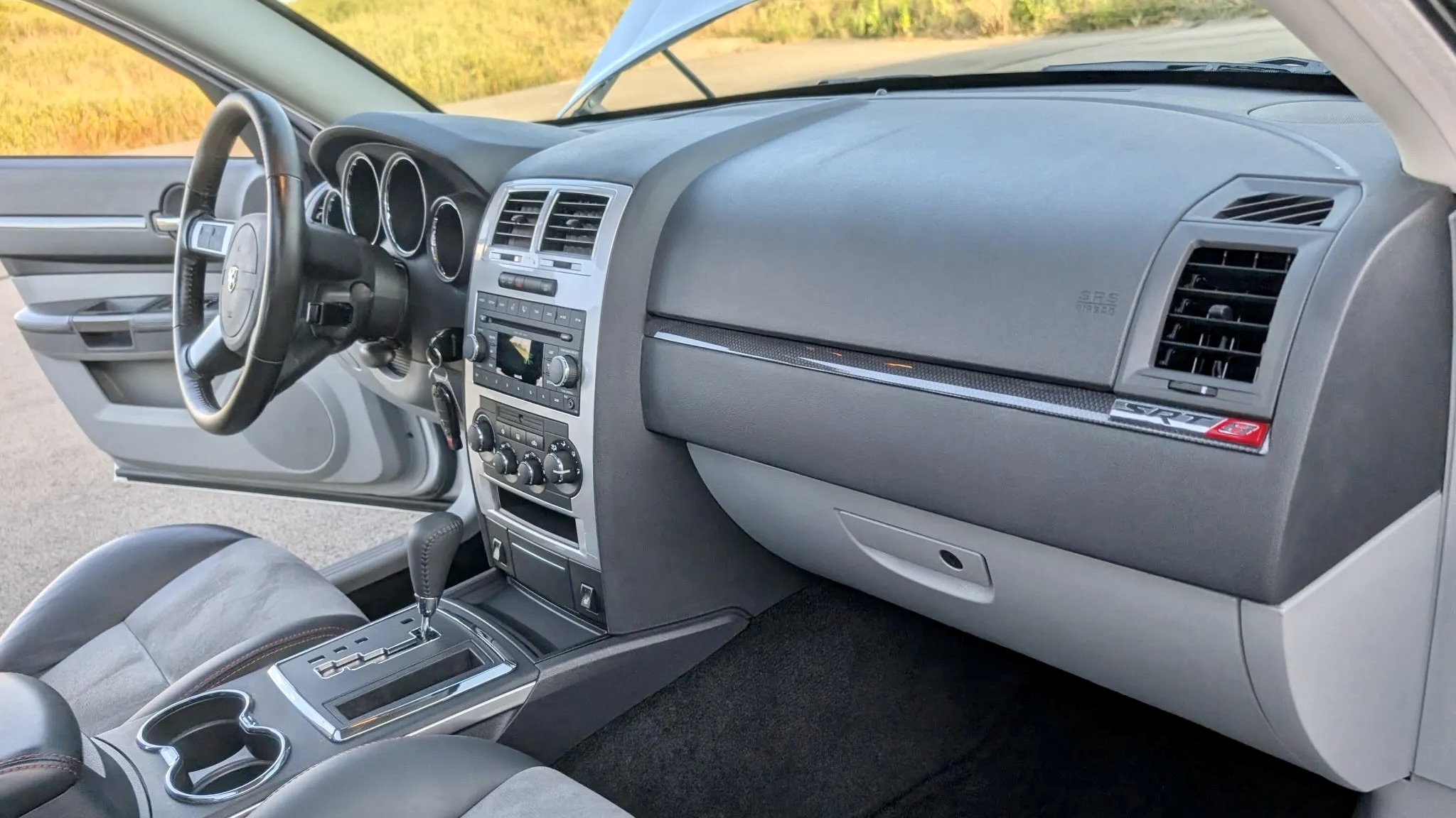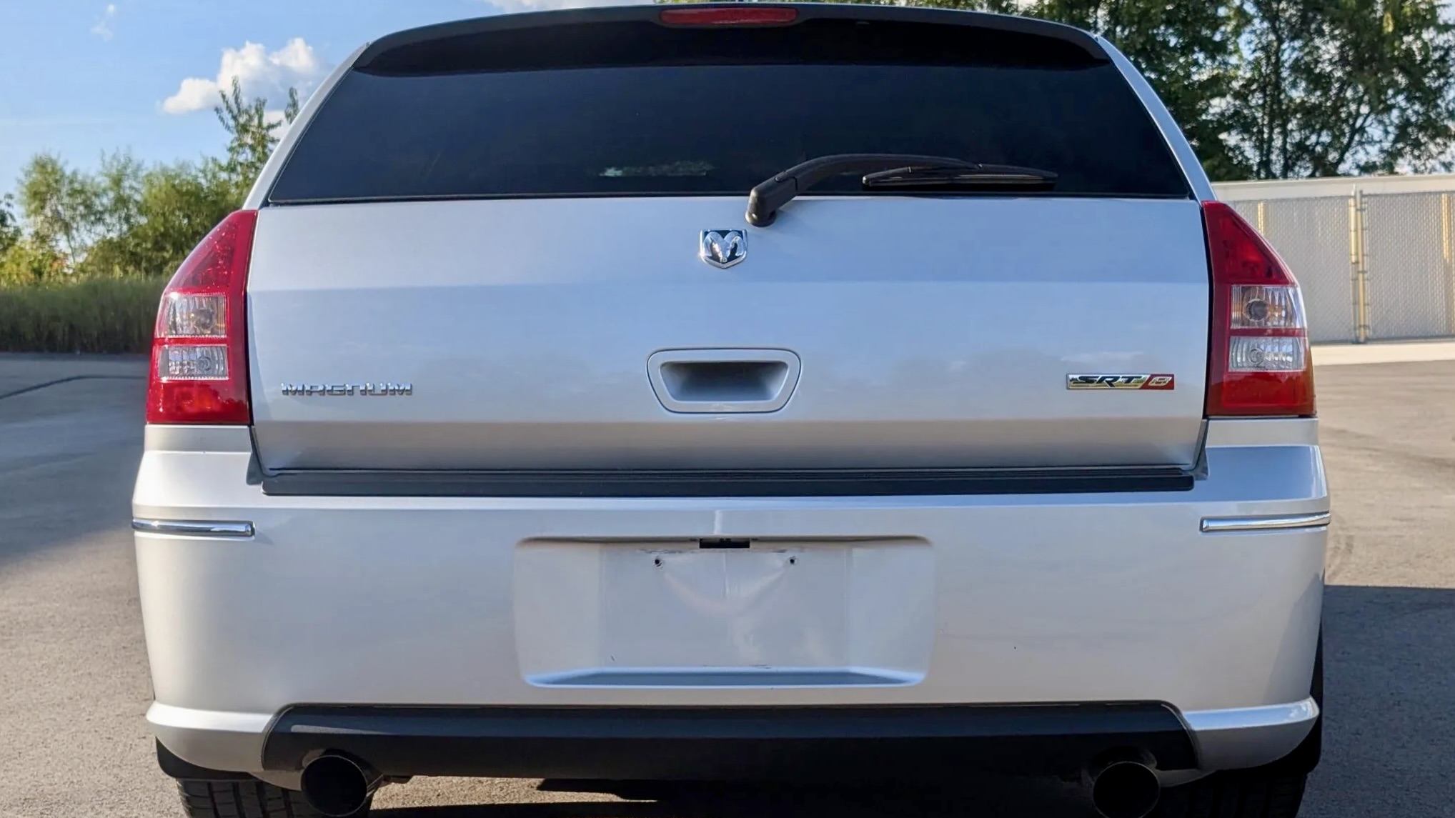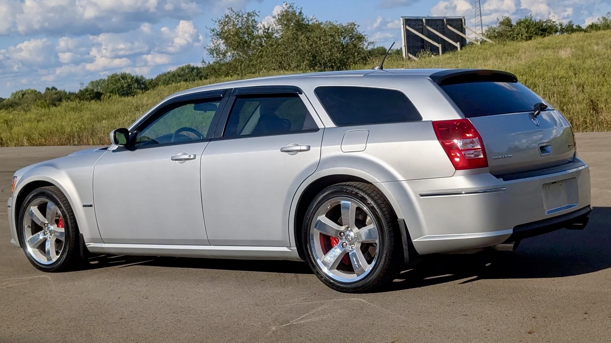 This 2008 Dodge Magnum SRT8 isn’t your run-of-the-mill family hauler. Finished in Bright Silver Metallic (PS2) with SRT-specific bodywork, it projects menace with a hood scoop, aggressive fascia, and roof spoiler. Subtle details like a blacked-out grille, fog lights, dual exhaust outlets, and even side-window rain guards add both flair and functionality. The listing notes a small chip under the front valance, but otherwise, the body presents beautifully—just as you’d expect from a car with only 9,600 miles on the clock.