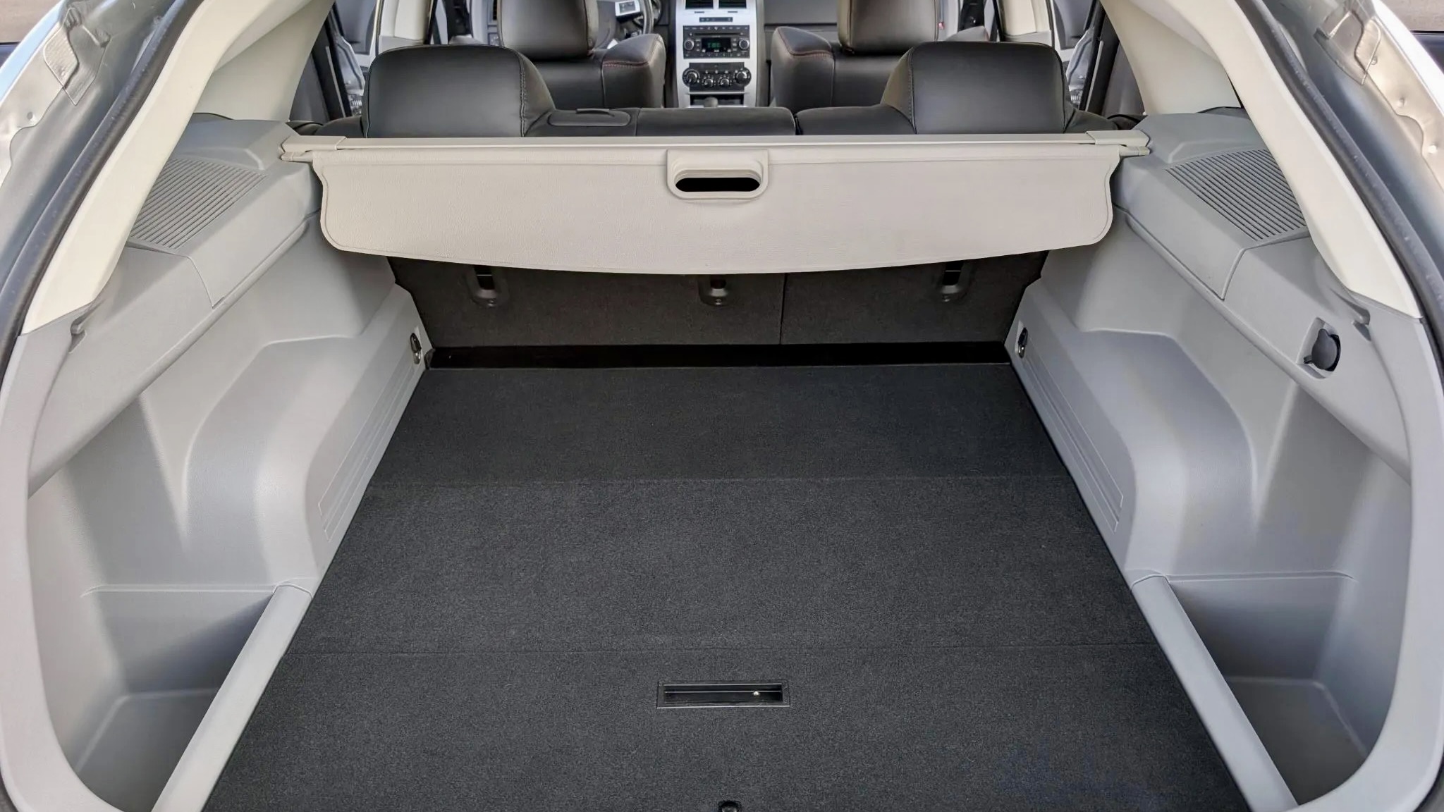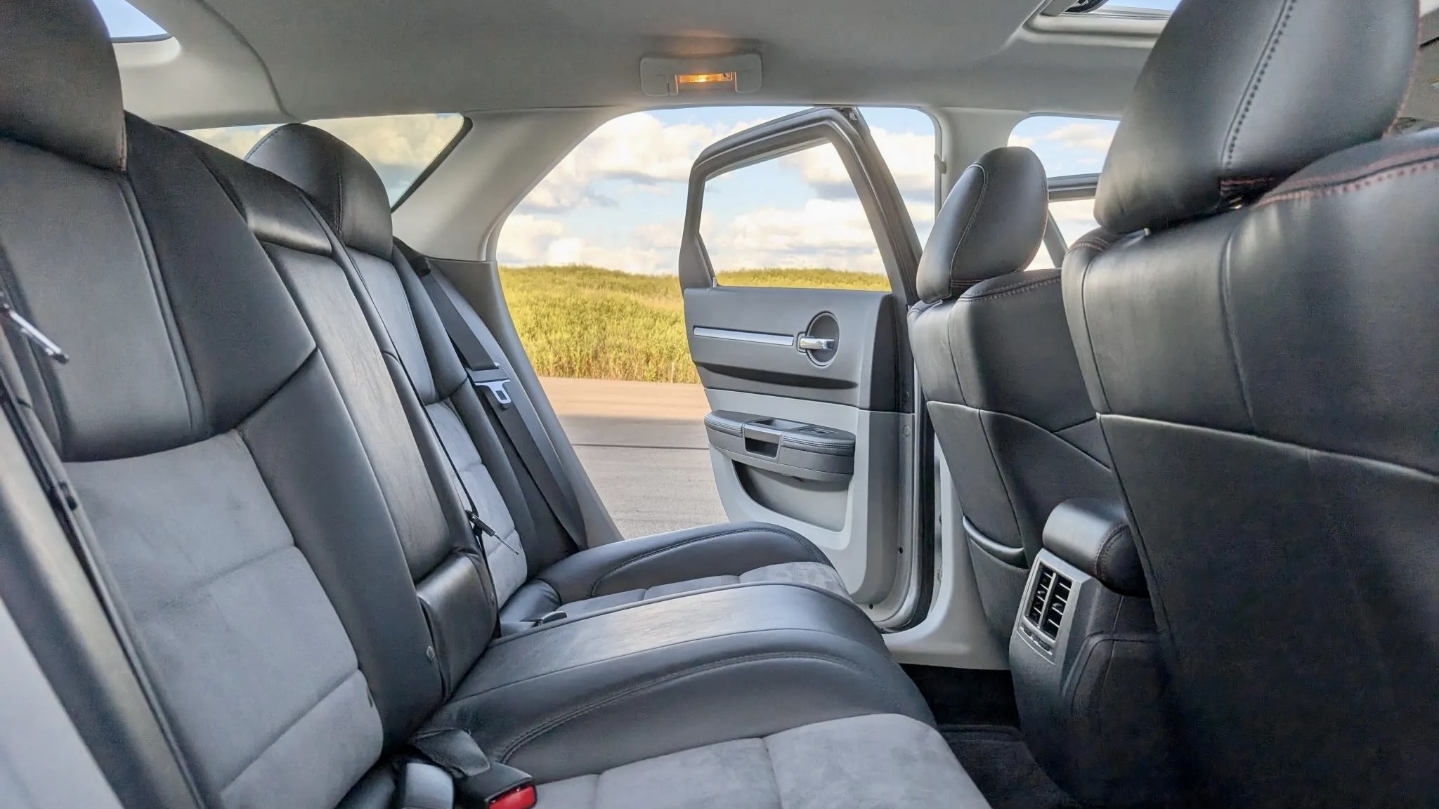 Inside, Dodge gave the Magnum SRT8 a cabin that leaned more toward muscle car than family wagon. The heated, power-adjustable front buckets are upholstered in Dark Slate Gray leather with Light Slate Gray microsuede inserts, red stitching, and embroidered SRT logos on the headrests. A four-spoke leather-wrapped steering wheel frames a 180-mph speedometer and an 8,000-rpm tachometer, emphasizing performance credentials. Meanwhile, modern conveniences like dual-zone climate control, cruise control, power windows, and keyless entry keep the family-friendly side intact.