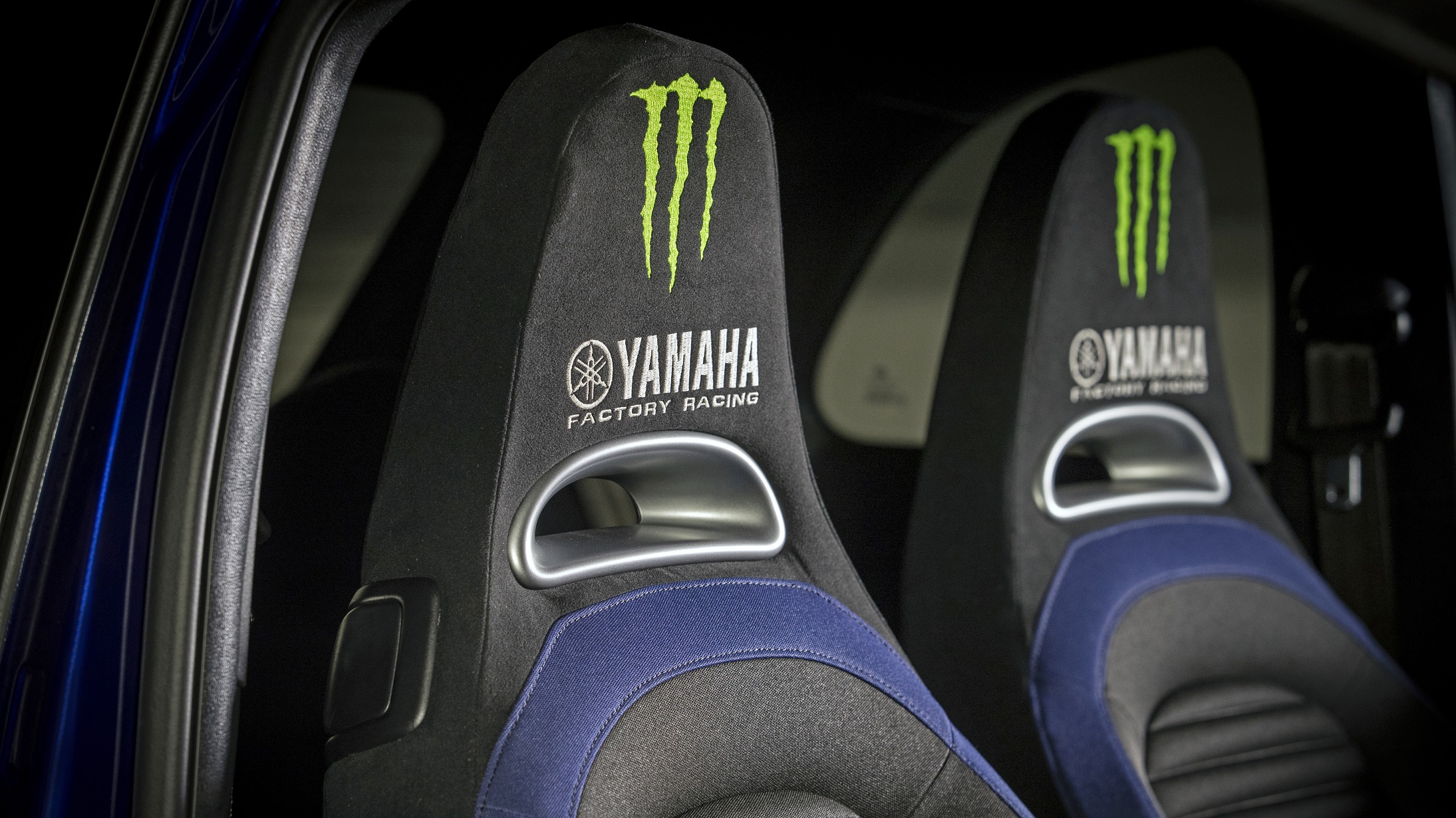 Inside, the model features the special new Abarth sports seats with blue finishes and the “Monster Energy Yamaha MotoGP” logo on the head restraints. The blue lining stands out from the black dashboard. Thus mirroring the dual-color livery, while the numbered plate is placed on the central tunnel.