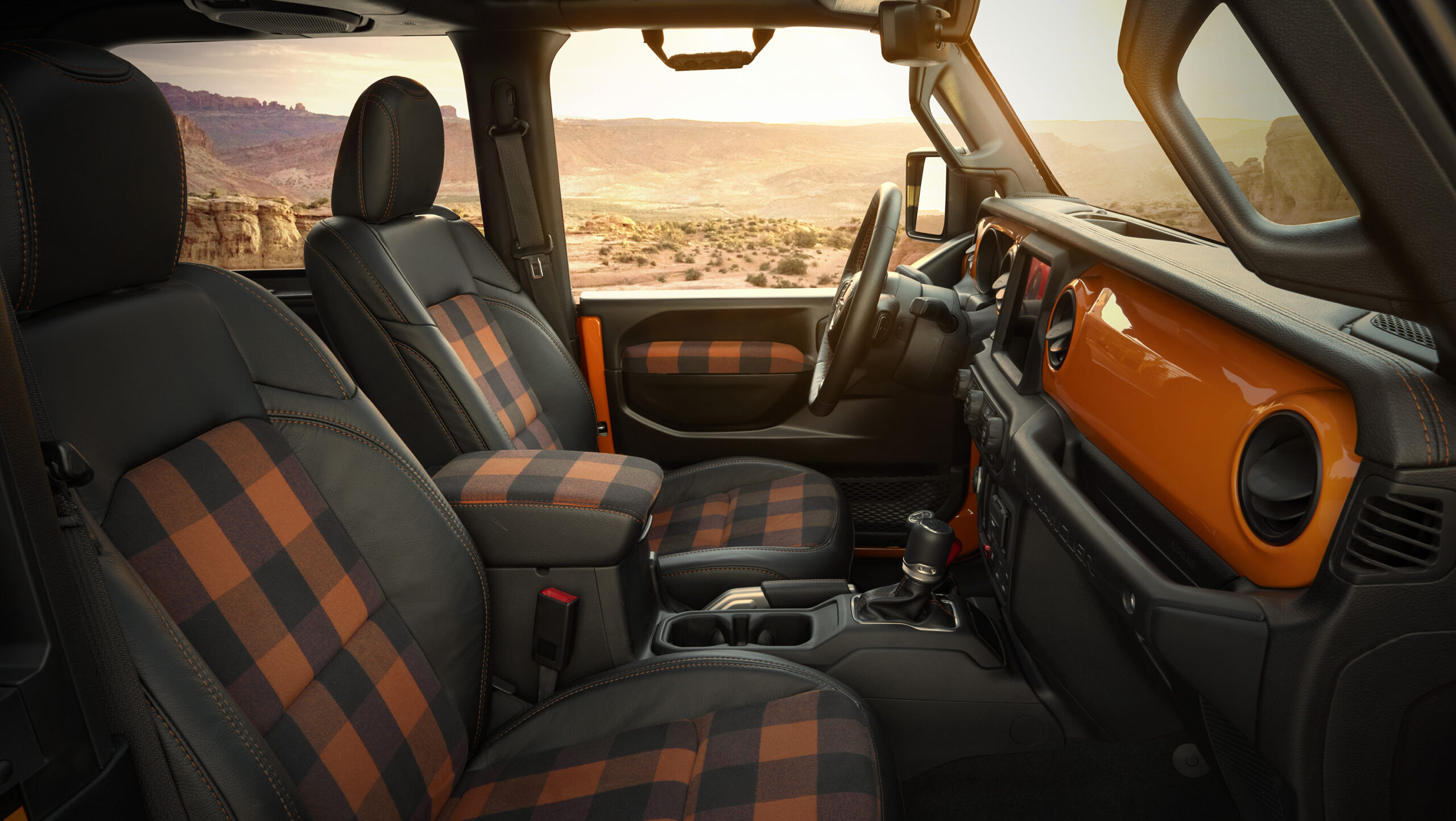 Starting with a two-door Wrangler (JL), the Jeep Wrangler Orange Peelz Concept pays tribute to the long-standing, open-air, fun and freedom lifestyle that makes the Jeep Wrangler a global icon. Mopar designers vastly enhanced the Wrangler’s open-air heritage by removing the side and rear windows and installing the new Jeep Wrangler Half-Doors from Mopar, which you can now purchase when buying a new Wrangler as part of the Dual-Door option. There is also a new custom removable one-piece Freedom Top glass sunroof also featured on the Orange Peelz Concept.