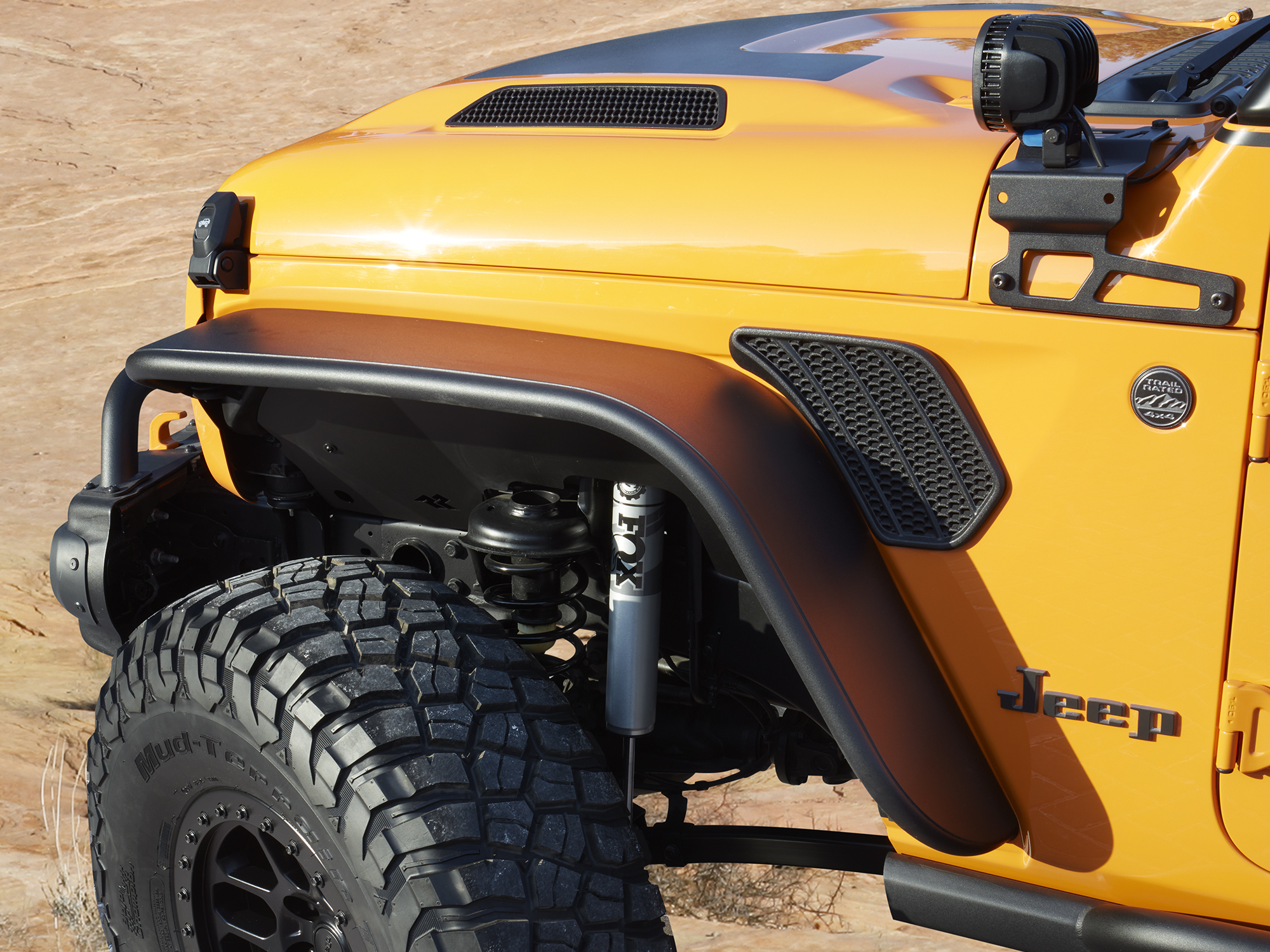 Of course, Mopar also reached deep into their Jeep Performance Parts (JPP) parts bin and equipped the Orange Peelz Concept thanks to a JPP 2-inch lift kit with FOX® shocks that increases ground clearance. Just below the conceptual steel “high-top” fender flares are a set of 17-inch JPP Beadlock-capable aluminum wheels riding on 37-inch BFGoodrich Mud-Terrain T/A KM3 tires with Mopar valve-stem caps carrying the Jeep logo.