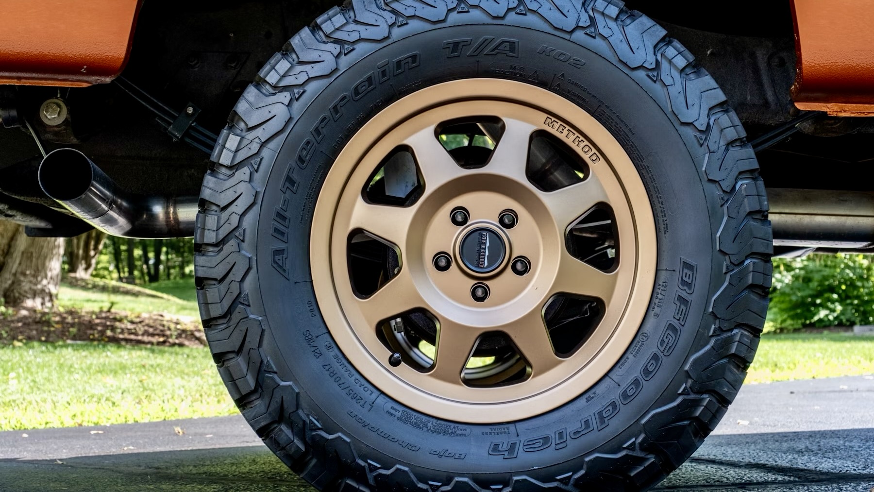On the outside, a professionally applied custom orange metallic paint job makes the SUV pop, complemented by bronze Method Race Wheels MR701 wrapped in BFGoodrich All-Terrain T/A KO2 tires. The original grille and rear bumper have been retained, wearing a light patina that speaks to the truck’s history without detracting from its fresh presentation.