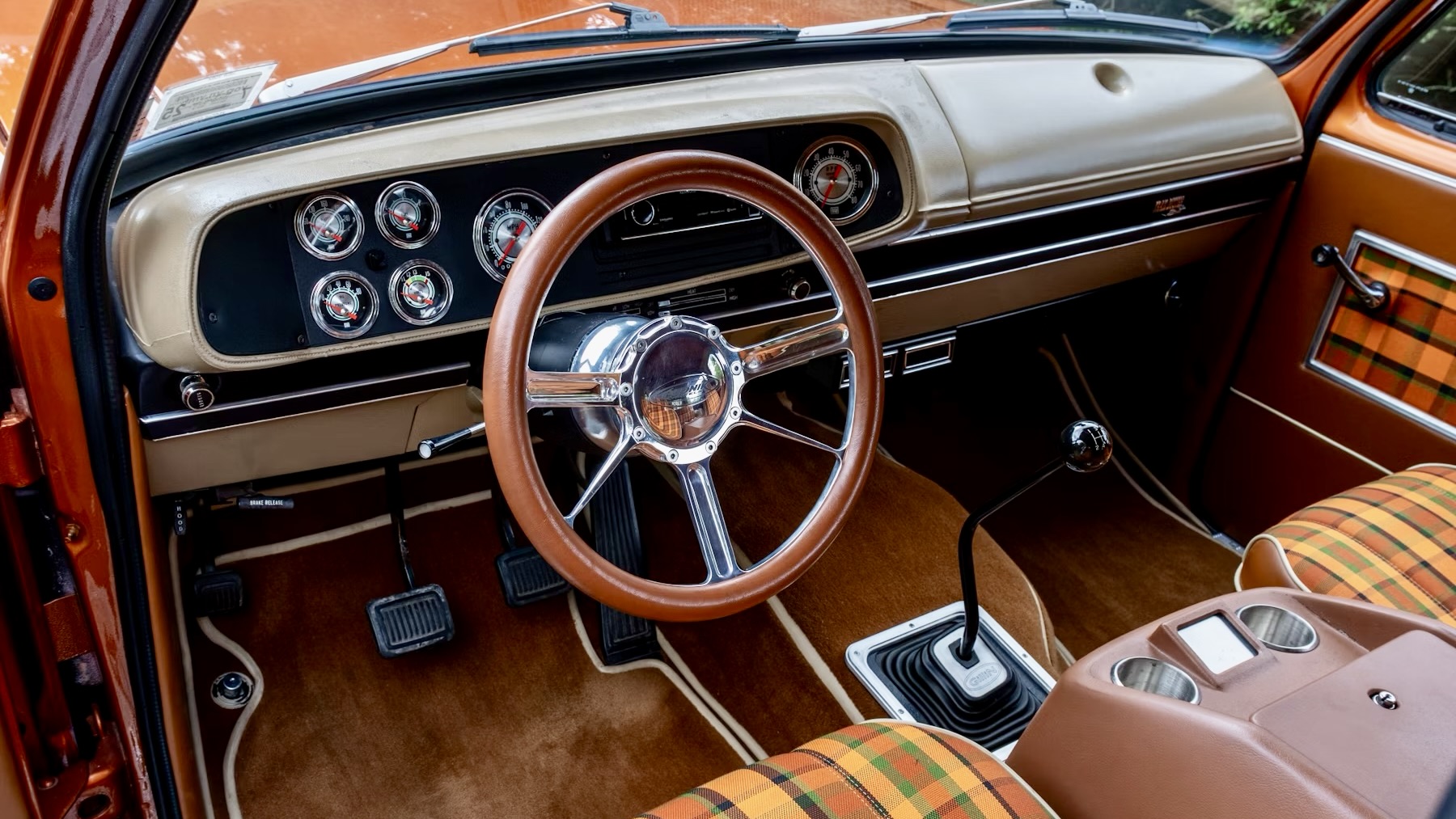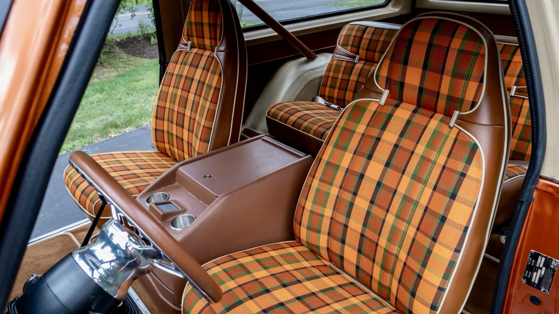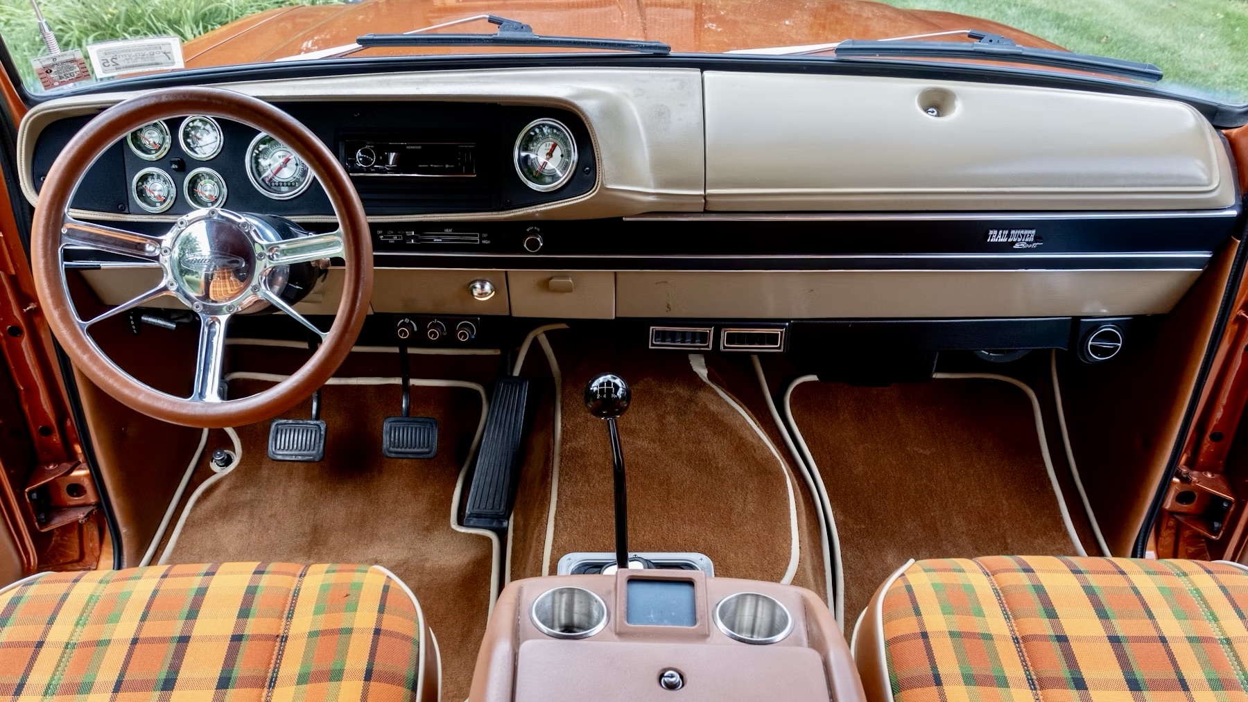 Inside, this Trail Duster Sport is far from bare-bones. The interior features saddle leather upholstery with custom orange plaid inserts, fully custom carpet, headliner, door panels, and sun visors. A leather-wrapped roll hoop, billet leather-wrapped steering wheel, and Stewart Warner gauges add a custom touch. A Kenwood stereo system and custom center console bring modern convenience to the vintage Mopar interior.