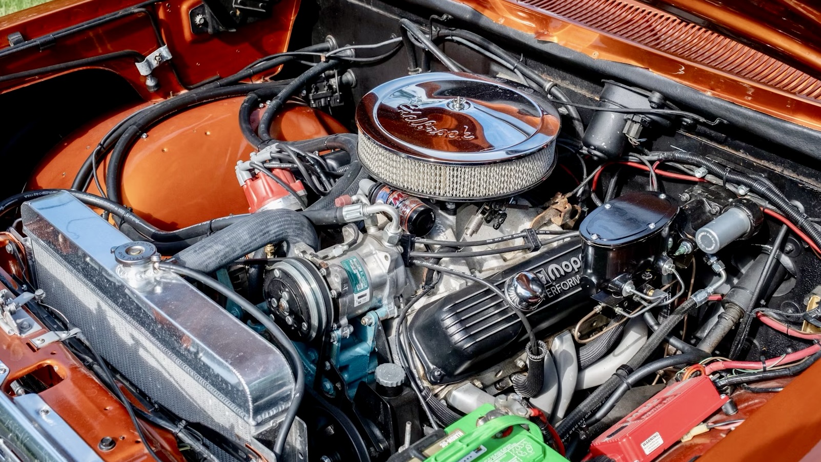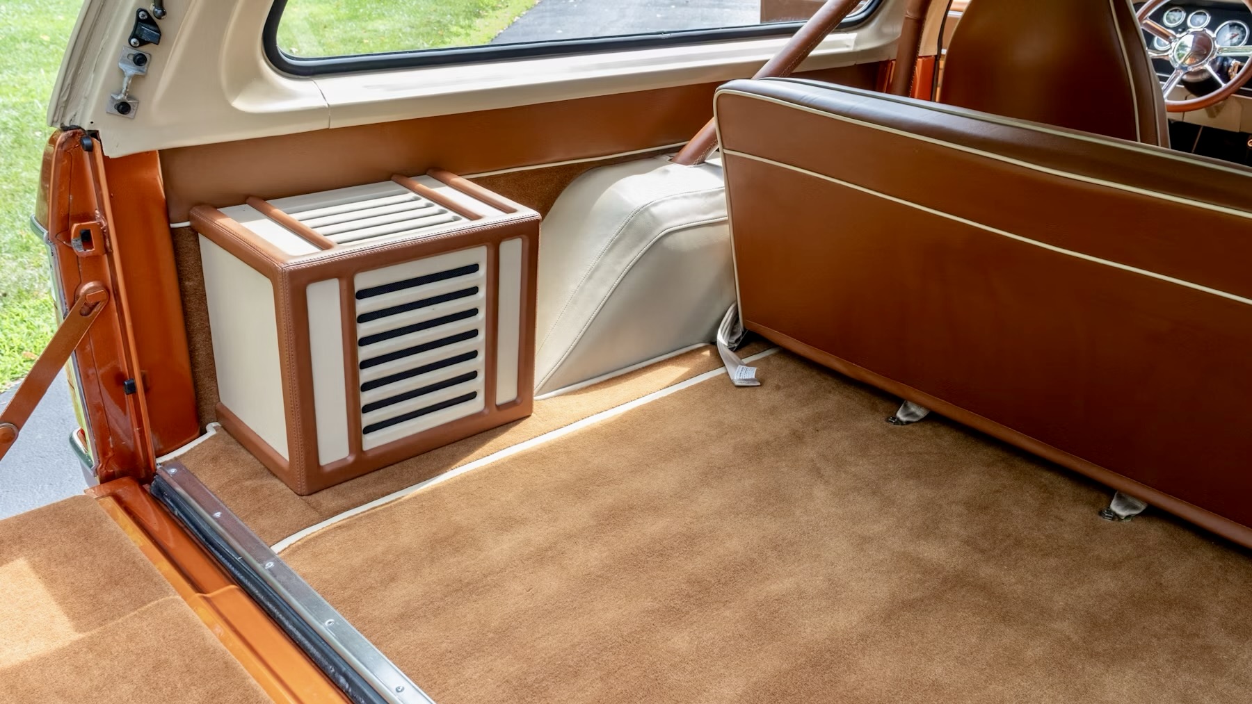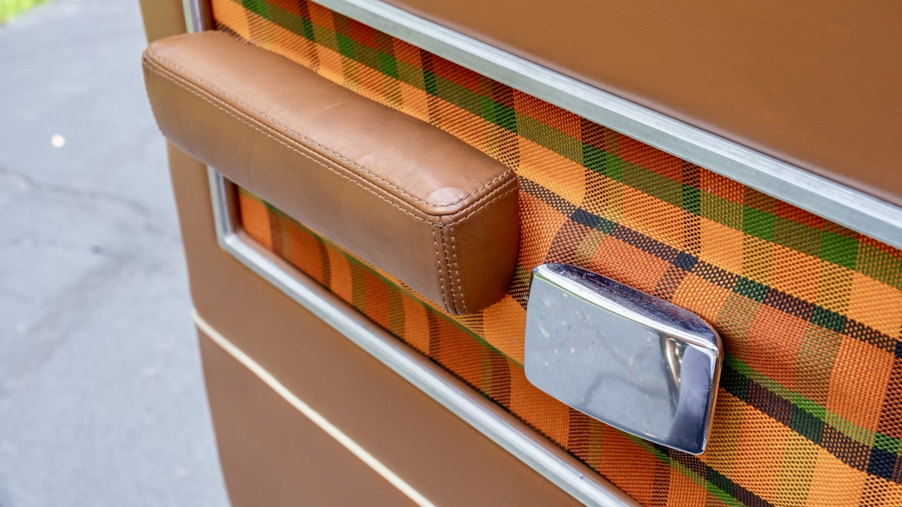 Inside, this Trail Duster Sport is far from bare-bones. The interior features saddle leather upholstery with custom orange plaid inserts, fully custom carpet, headliner, door panels, and sun visors. A leather-wrapped roll hoop, billet leather-wrapped steering wheel, and Stewart Warner gauges add a custom touch. A Kenwood stereo system and custom center console bring modern convenience to the vintage Mopar interior.