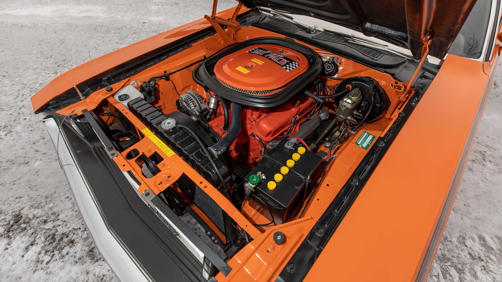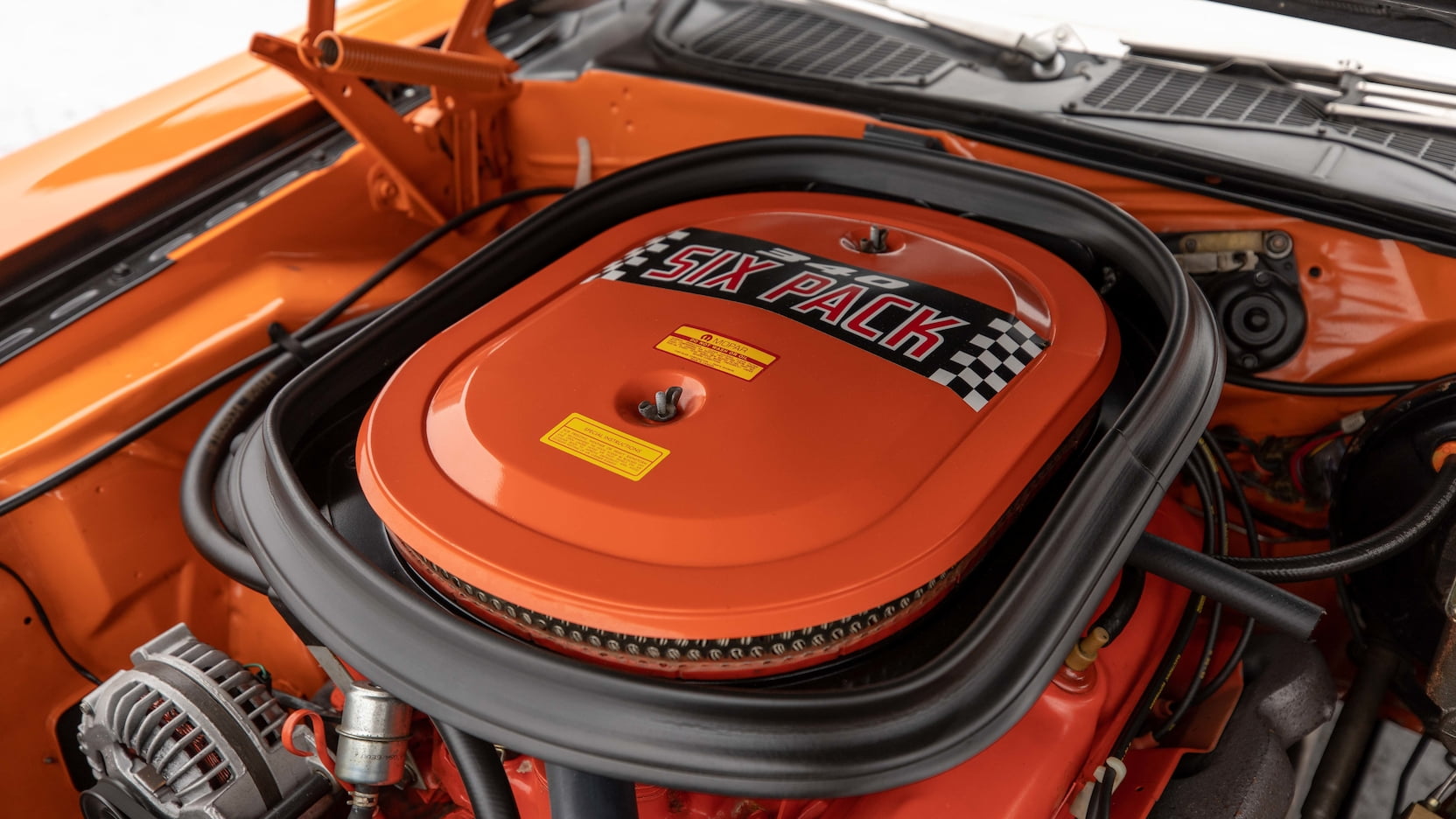 Under the hood was a small-block 340 cubic-inch V8 producing a conservatively rated 290 horsepower. The 340 featured an Edelbrock aluminum six-pack intake manifold painted bright orange to match the engine color. It also featured Holley 2300 series carburetors which were used with vacuum-operated secondaries. The center carburetor was the only carburetor with a metering block and accelerator pump while the two outboard carburetors were used for idling and opened when they were called for. A large air cleaner that sealed to the hood rested over the top of all three carburetors, thus explaining the 340 SIX PACK name for the engine.