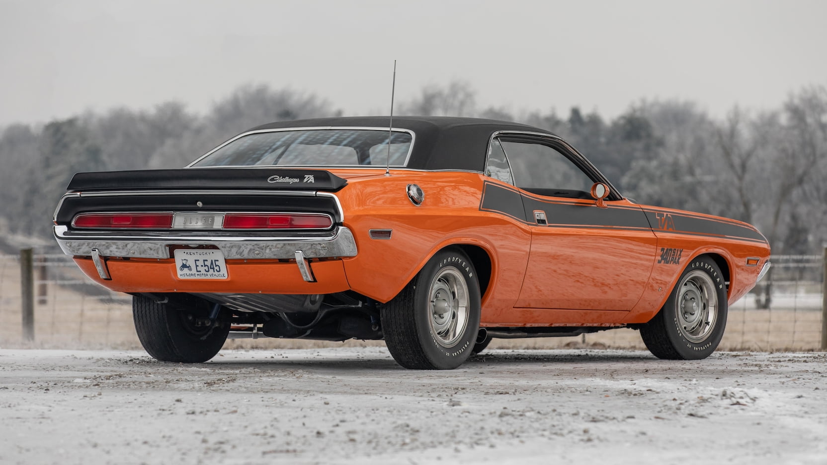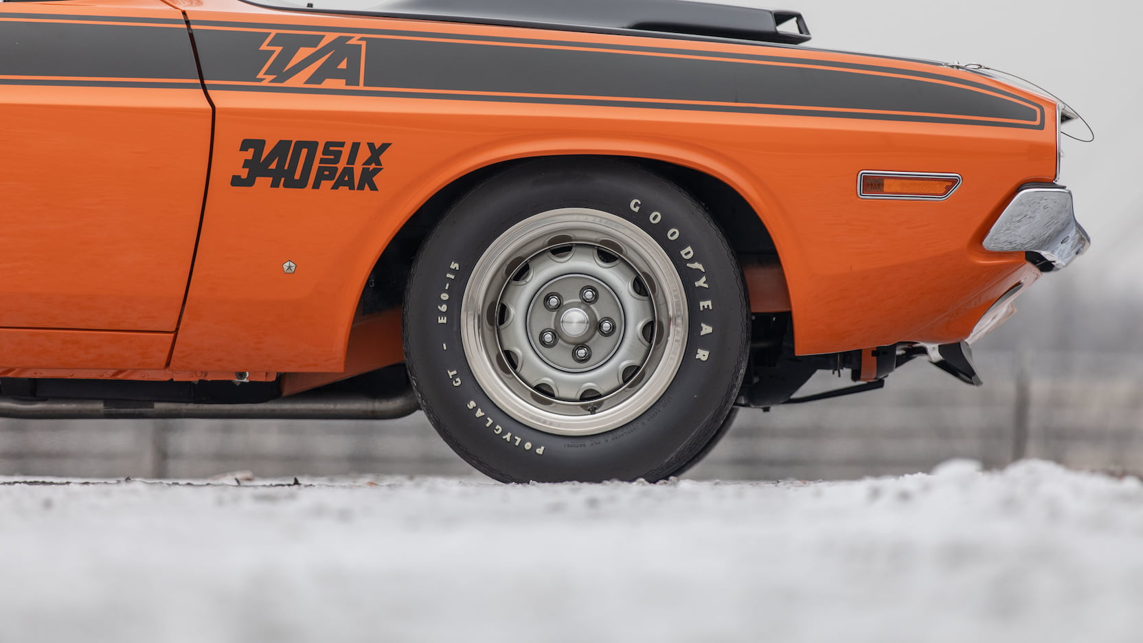 The Challenger T/A featured a functional fiberglass hood with hood pins, “ducktail” rear spoiler, trumpet-style side exiting exhaust, staggered bias-ply Goodyear Polygas GT tires with raised white lettering (it was the first American car to featured staggered tires), 15-inch Rallye wheels, distinctive graphics, and an Organsol Black-painted hood. The Challenger T/A also featured different fenders lips than the standard Challenger. The lip at the top of the wheel well was rolled in on the T/A model. All Challenger T/A would also feature their radio antennas mounted on the rear passenger-side quarter panel (the last Chrysler product to do so). These features made the Challenger T/A look like nothing else on the road.