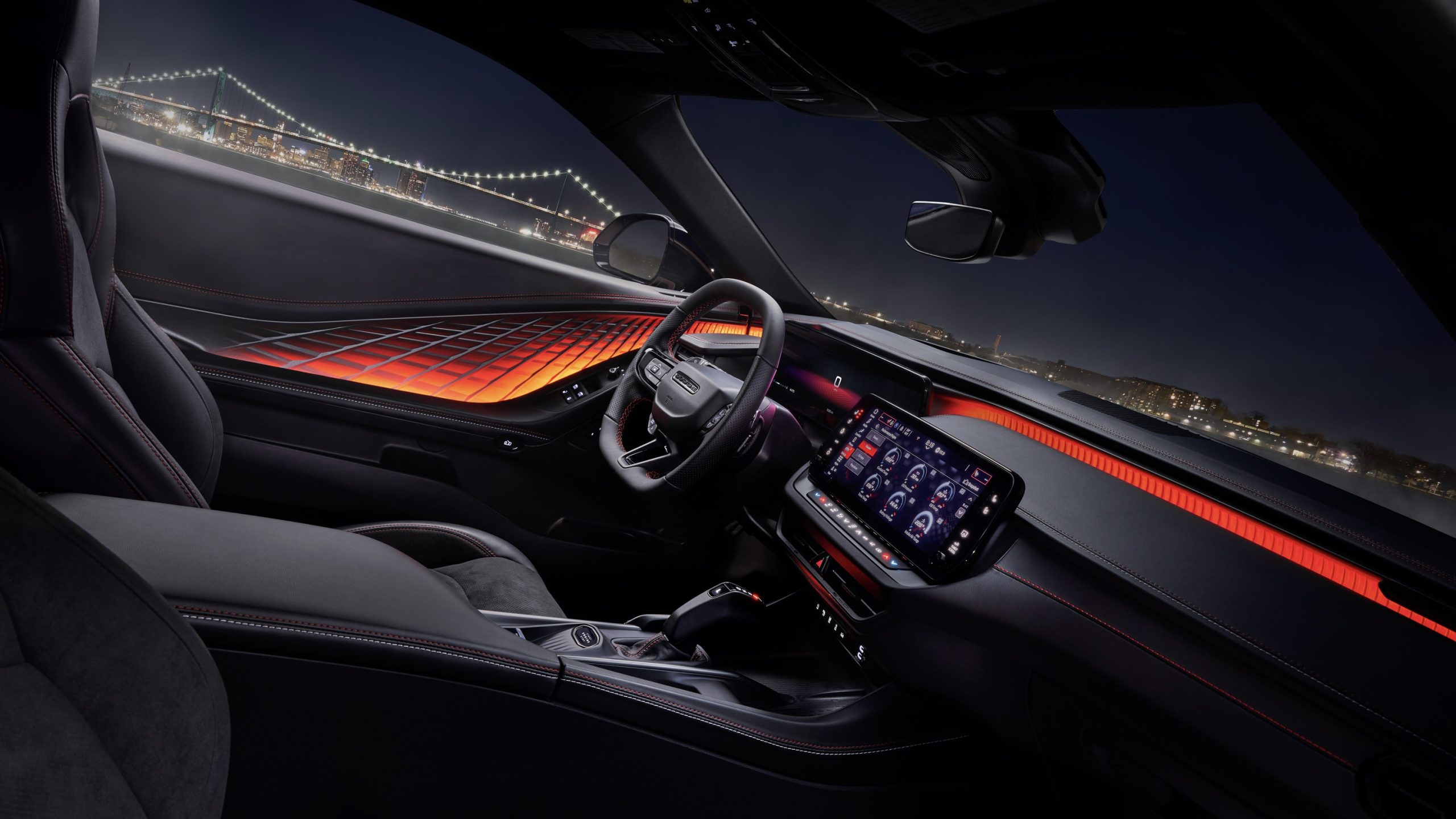 Inside, the Charger blends retro-inspired details with modern tech. The instrument panel takes cues from the 1968 Charger, while the tech suite is thoroughly next-gen. A standard 10.25-inch digital gauge cluster can be upgraded to a massive 16-inch unit, and the 12.3-inch Uconnect 5 touchscreen is loaded with features. The Scat Pack includes Performance Pages, giving drivers real-time data on g-forces, acceleration times, and more. Attitude Adjustment ambient lighting offers 64 colors and dynamic effects that react to drive mode changes, ignition cycles, and even door openings.