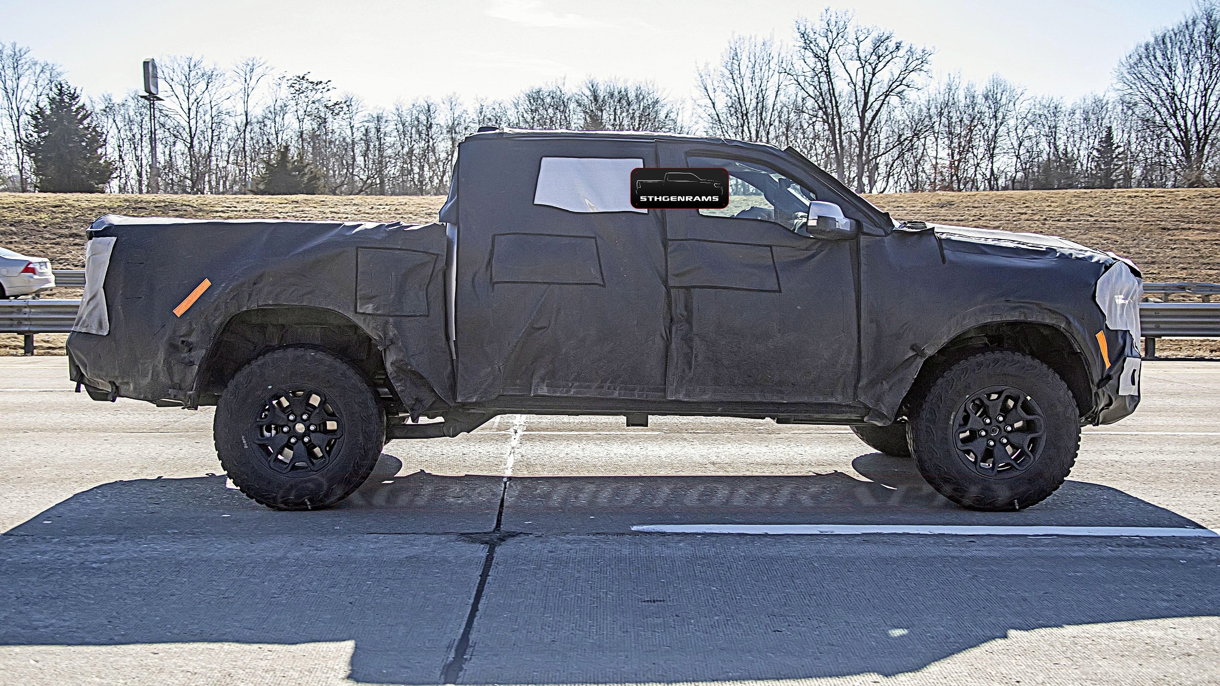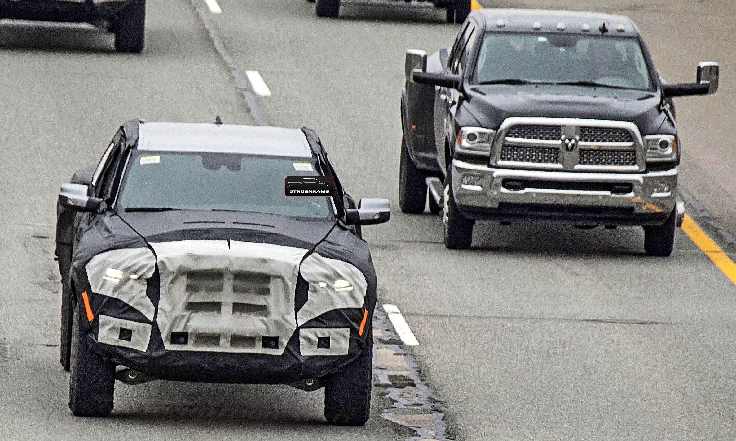 Also from the higher overhead angle, we get to see just how much wider the 2021 Ram 1500 Rebel TRX truly, when compared to a late model Ram 3500 dually model that is running alongside it. It reminds us of the additional width added of our friend Charles’ Hellcat-powered 2019 Ram 1500 Rebel with the Fiberworx widebody kit, but of course, the production version will have many more details added to it.