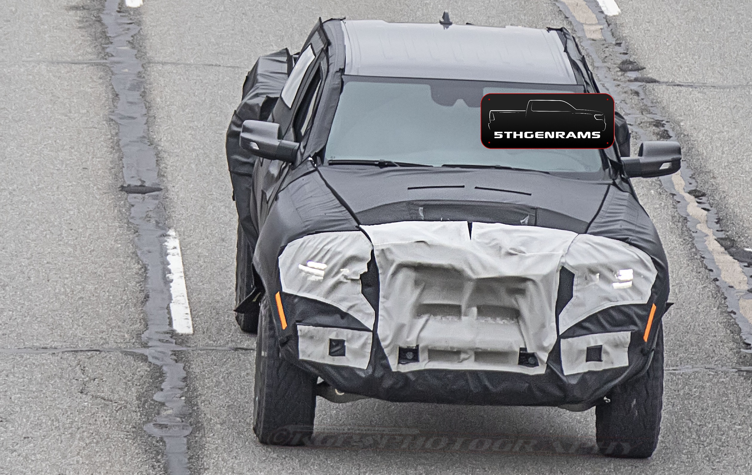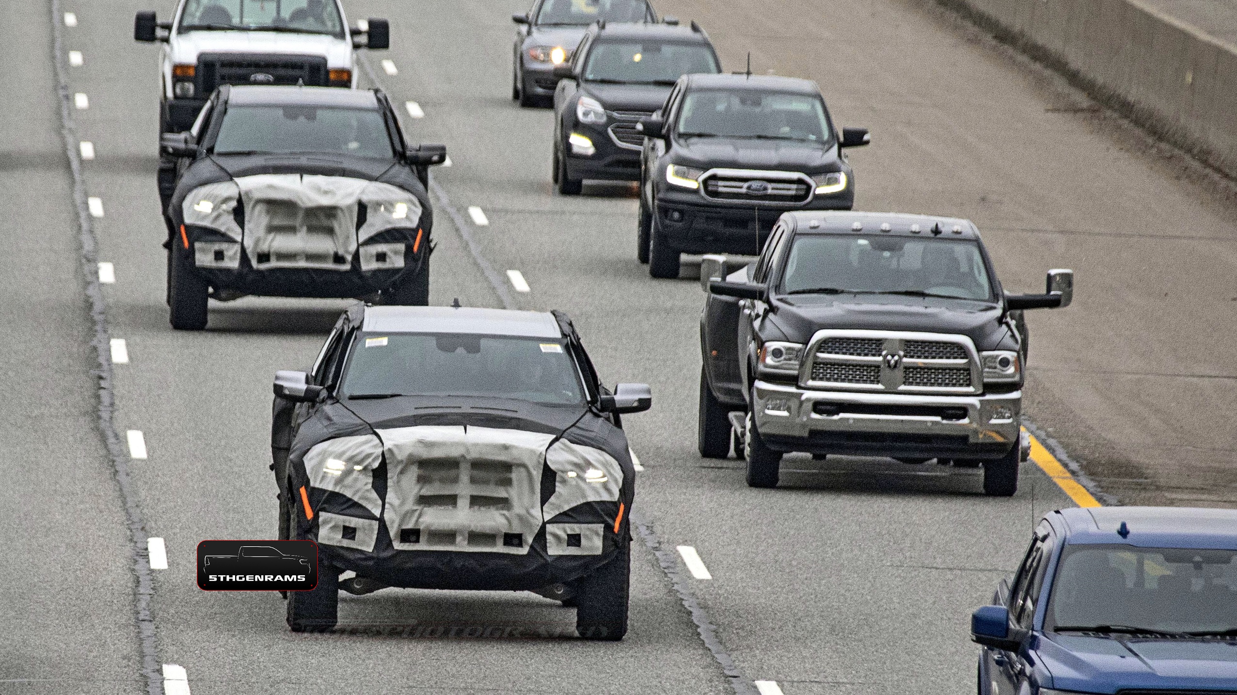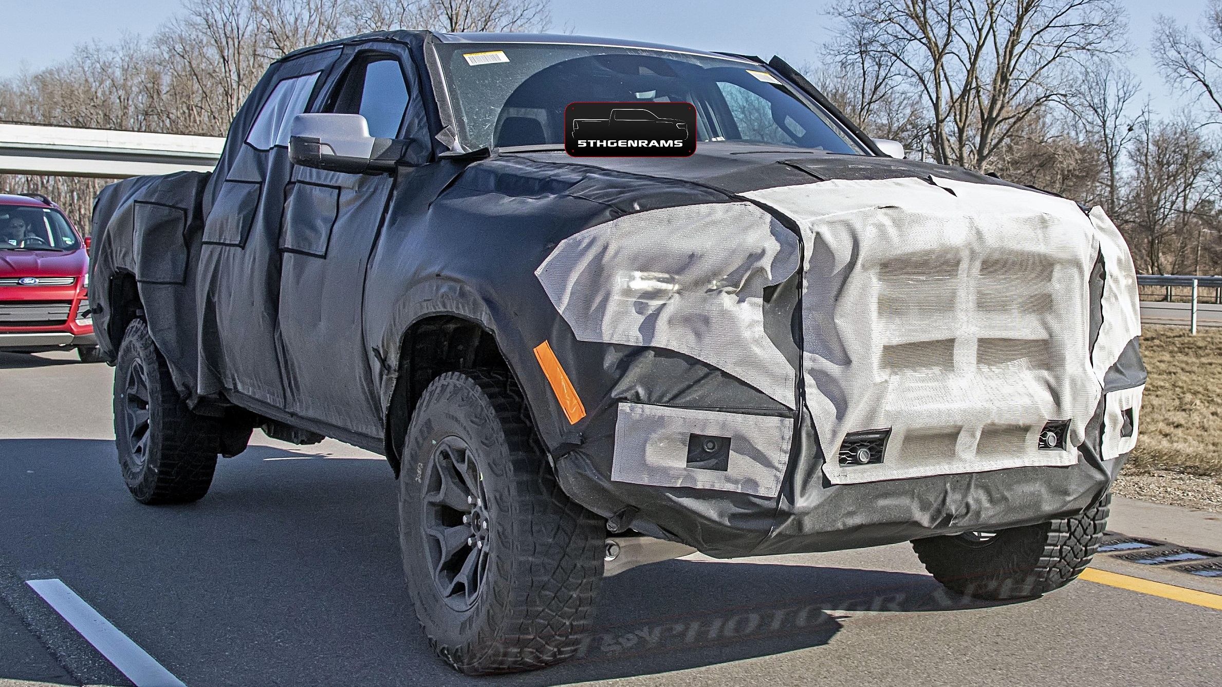 One of our spy photographers happened to catch a couple of 2021 Ram 1500 Rebel TRX prototypes on the highway, in Metro Detroit. This time we are seeing some new angles of the 707 horsepower off-roader that we haven’t seen before. Including this bird’s eyeshot of the new hood design. Unlike the concept and “Drive for Design” contest poster, the production model will have a bigger induction intake in the hood with heat extractors more towards the windshield – which we previewed in our recent sketch.