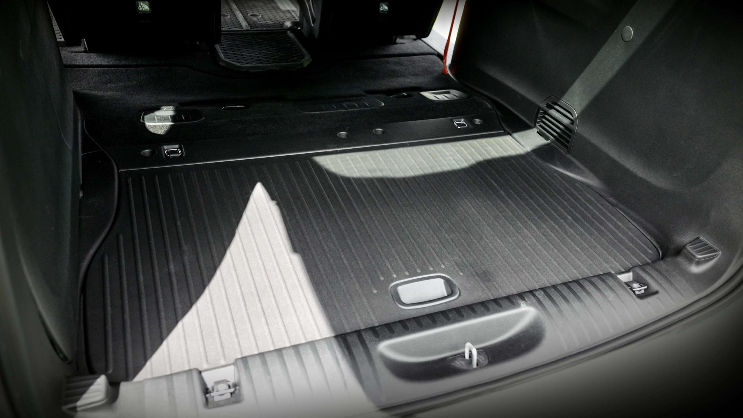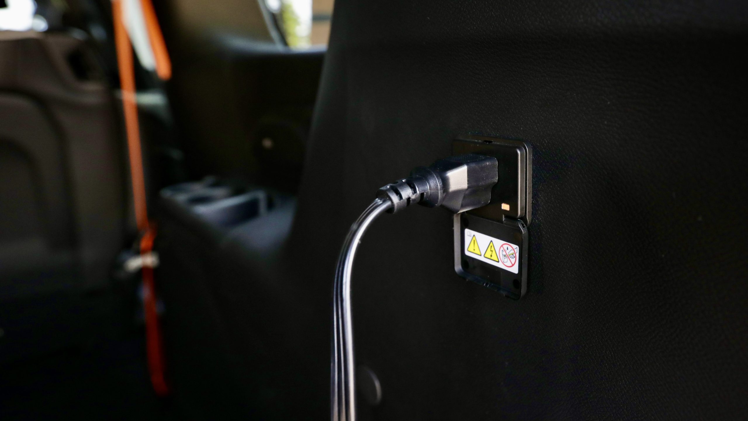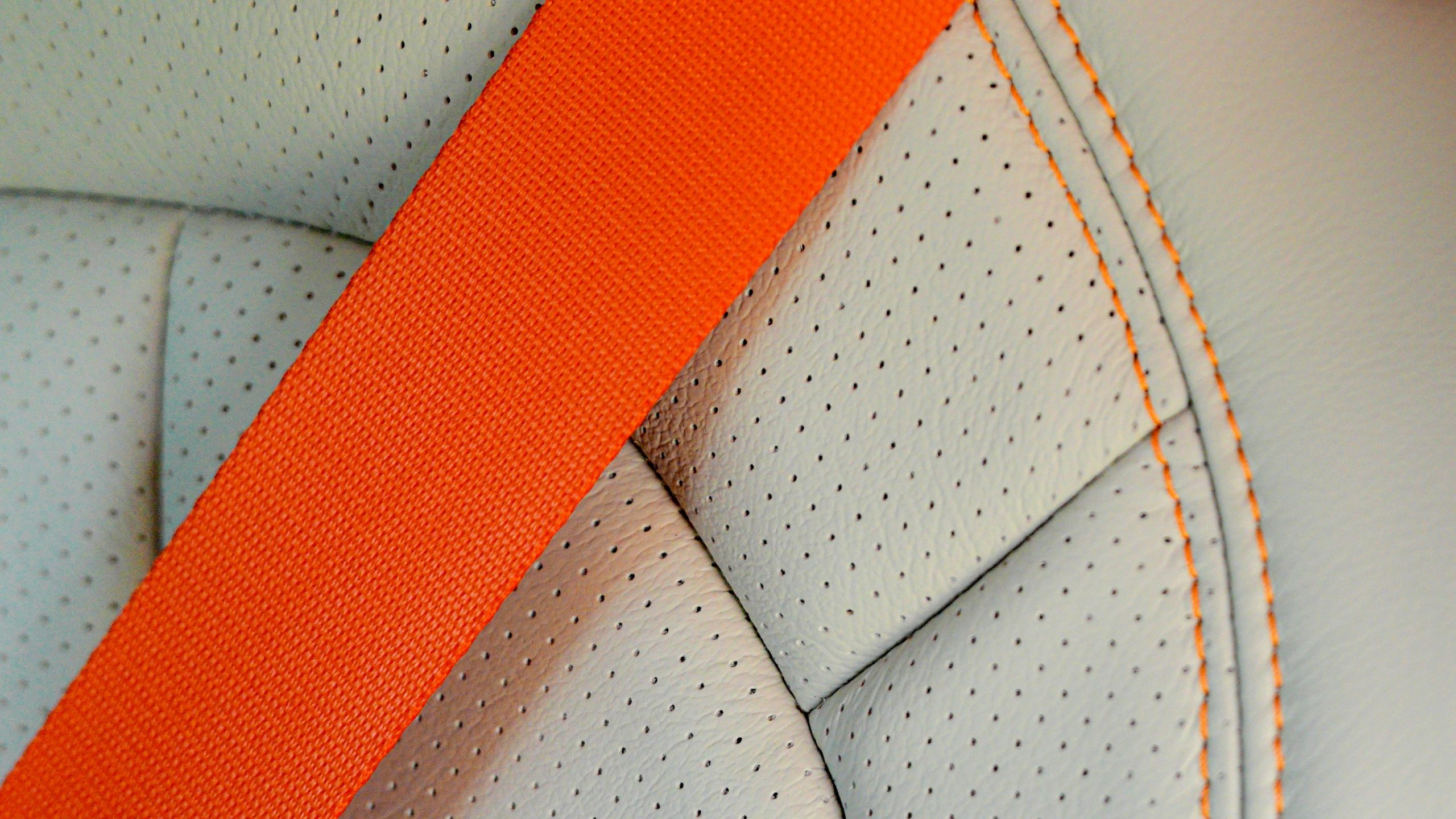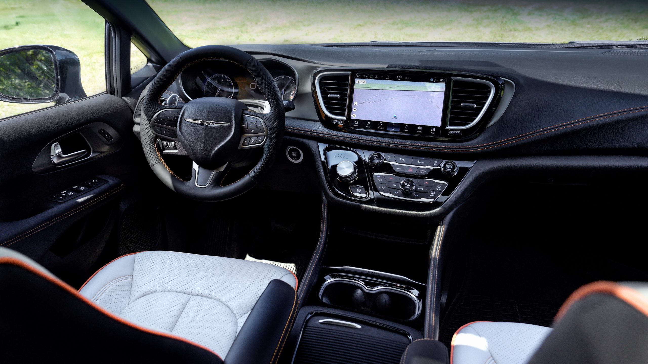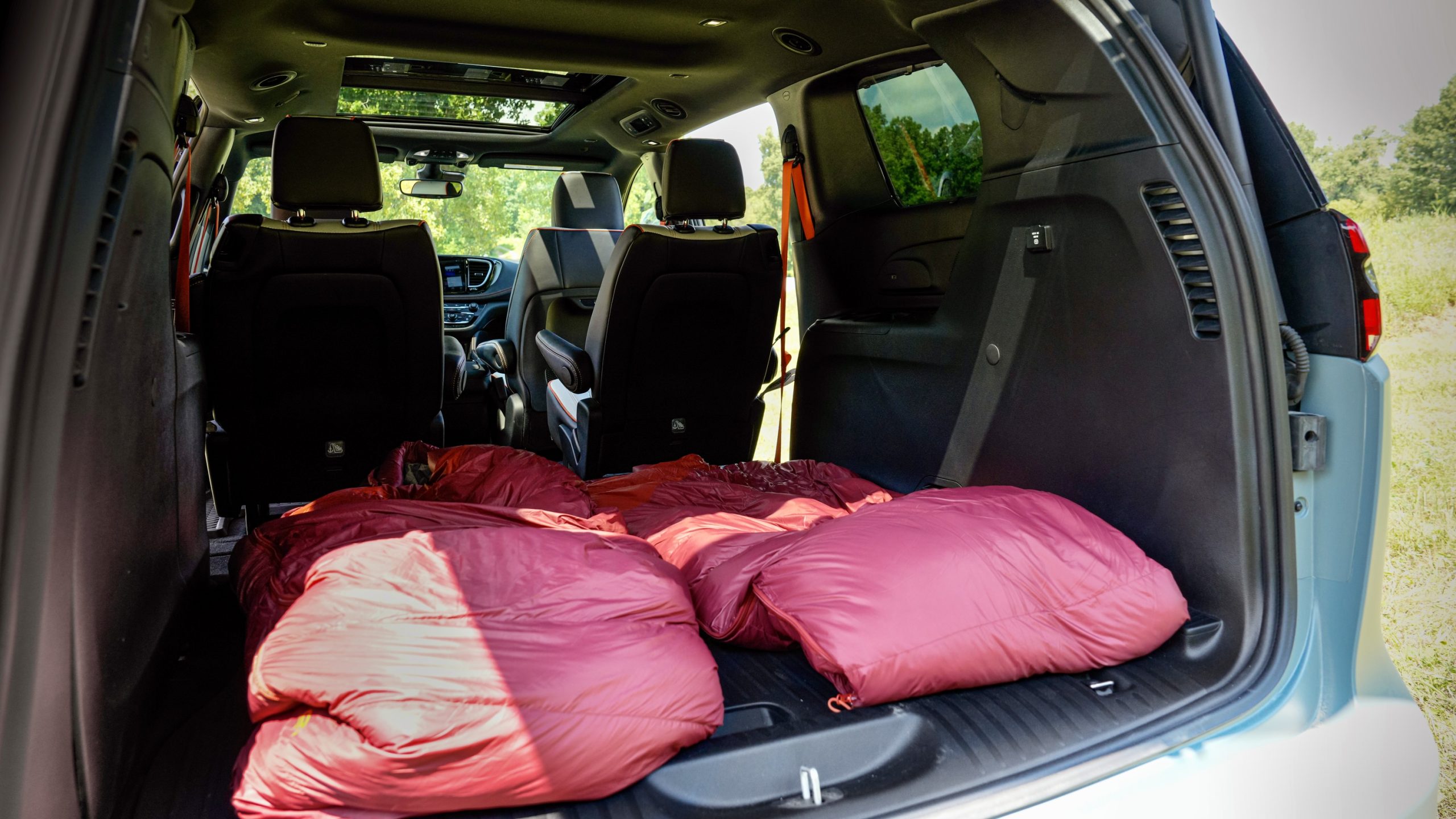 Inside, Chrysler ditched the third-row seats for a flat cargo floor—perfect for tossing in gear or stretching out to sleep. There’s also a 115-volt power outlet in the back, tie-downs for securing cargo, and a set of Mopar-branded stackable totes. The interior gets custom touches too, like Katzkin leather seating, orange seat belts, a sport steering wheel, and a unique gray-and-titanium trim theme.