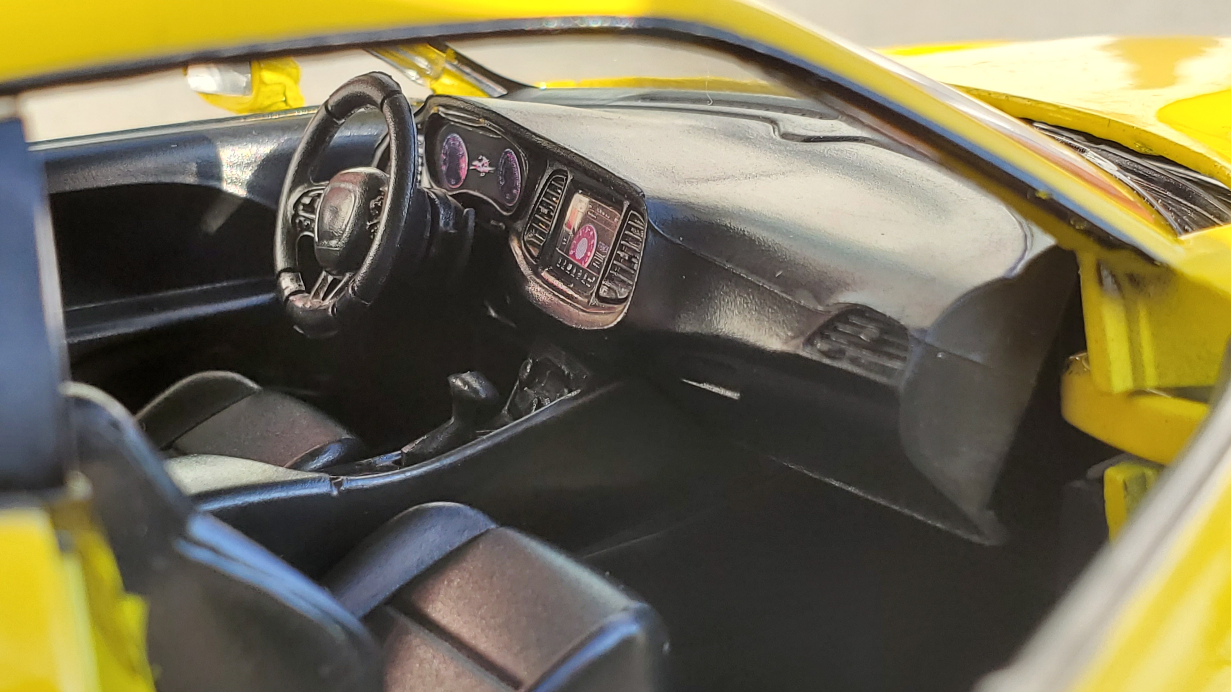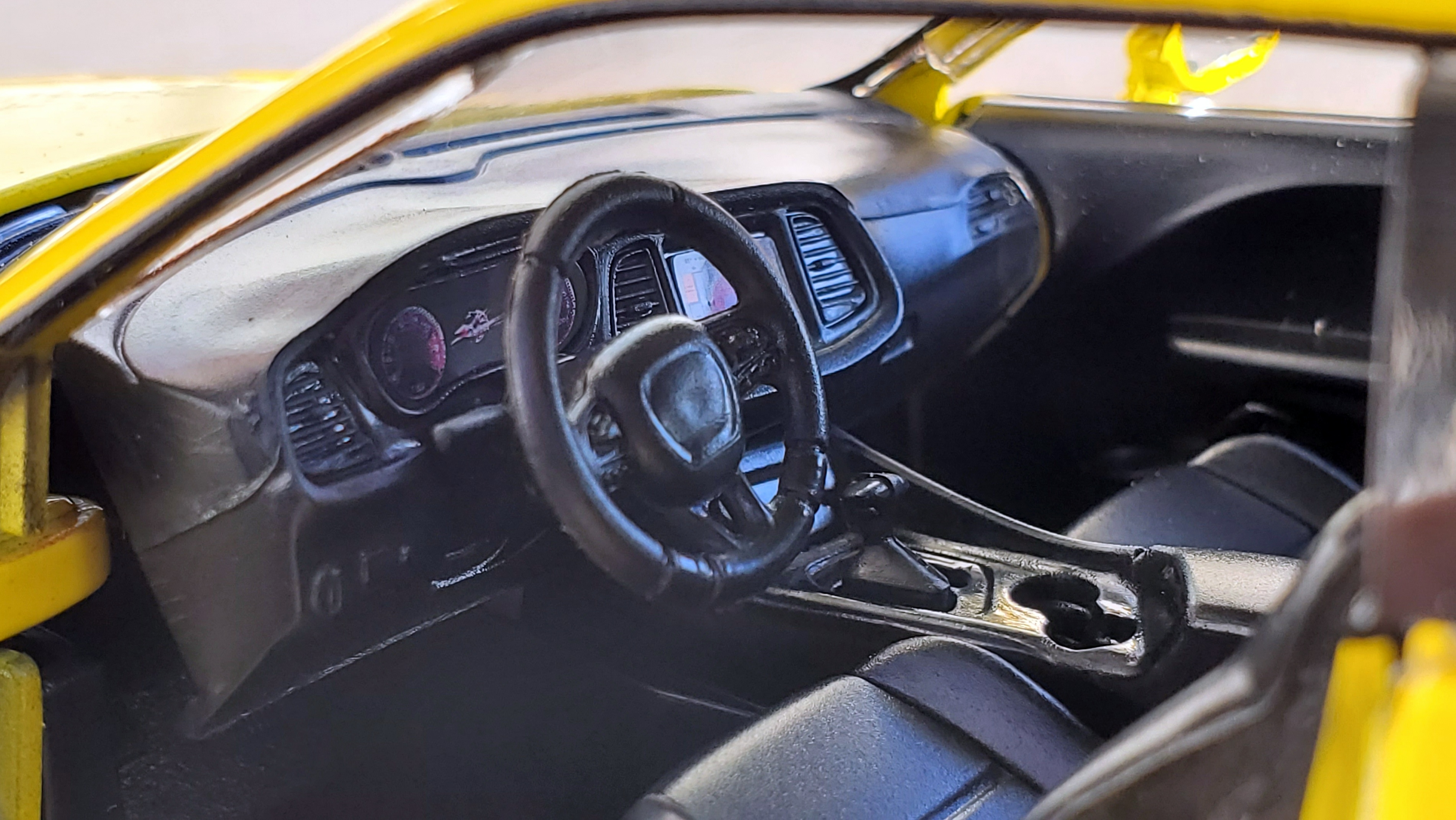While the hood and trunk do not open, the side doors open pretty far out. Inside the plastic interior has quite a bit of detail for the tiny cheap diecast. The Uconnect system has a decal, making it look like the SRT Performance Pages are up, while another decal is placed where the instrument panel gauges are on the production car. The model even has a lot of detail on the center console, with the Dodge T-shifter and even the cup holders in the right spots.