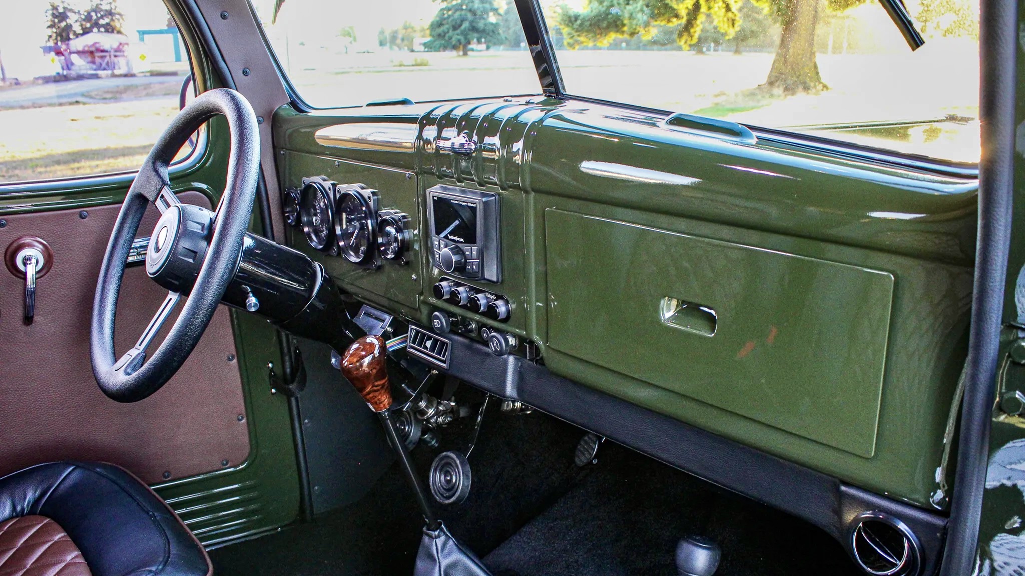 Creature comforts abound: Vintage Air climate control, power windows by Specialty Power Windows, a Rockford Fosgate PMX-3 Bluetooth audio system with a 400-watt Punch amplifier, JL Audio front speakers, Focal K2 rear speakers, and a subwoofer under the rear seat deliver premium sound. Additional touches include armrests, black carpeting, a glovebox with USB power, and a Camden tuning wood shift knob.