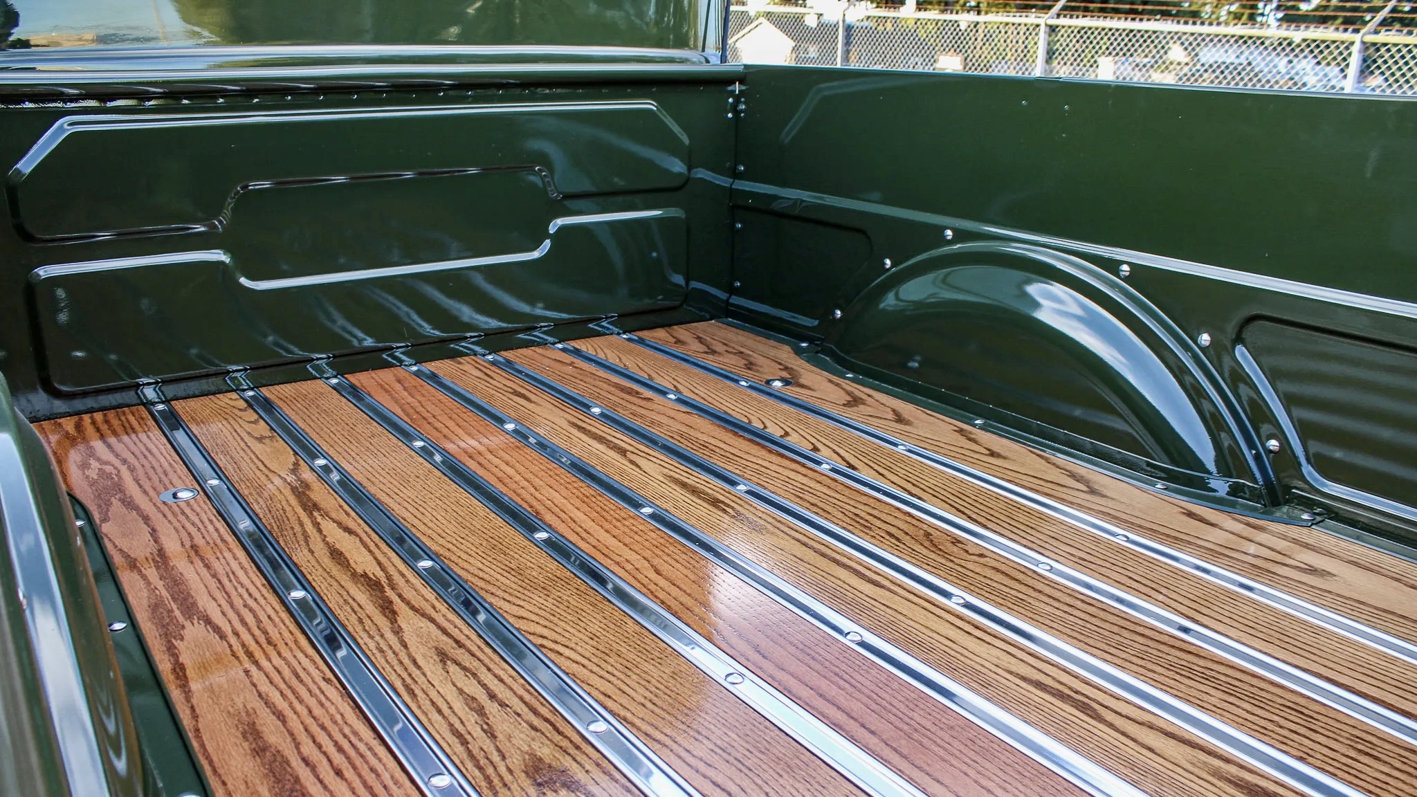 Finished in a classic two-tone scheme of green with black fenders and running boards, the Power Wagon’s body was sandblasted, epoxy-primed, and refinished to show quality. The grille and front bumper were refurbished, while an electric-over-hydraulic winch was cleanly integrated into the front bumper. Additional exterior highlights include turn signals, tow hooks, cowl lights, dual side mirrors, Power Wagon badging, a drop-down tailgate, reverse lights, a trailer-brake controller, and a receiver hitch.