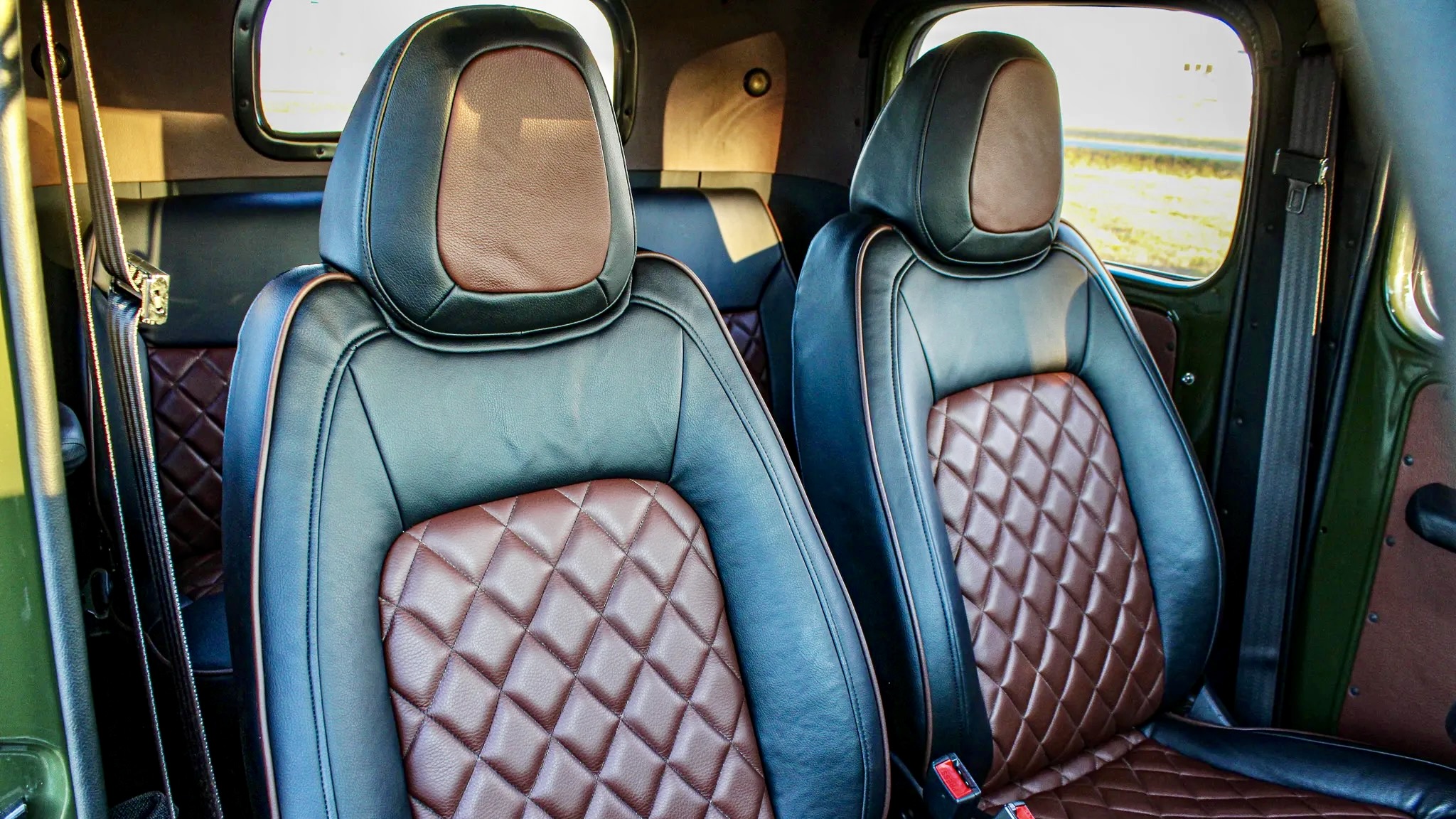 Inside, the Power Wagon takes a luxurious turn. The black and brown diamond-stitched leather upholstery covers both the power-adjustable front bucket seats and the full-width rear bench. The dashboard, painted body color, houses a set of Speedhut gauges including a 120-mph GPS speedometer, 8,000-rpm tachometer, and readouts for boost pressure, voltage, oil pressure, fuel level, coolant temperature, and exhaust-gas temperature. The digital odometer shows about 2,500 miles since the restoration, with roughly 200 of those miles added by the current owner.