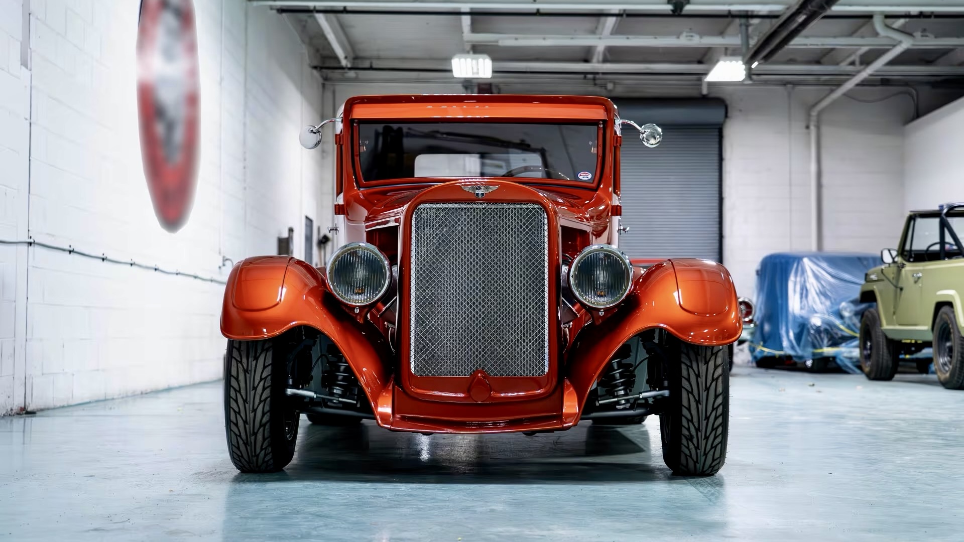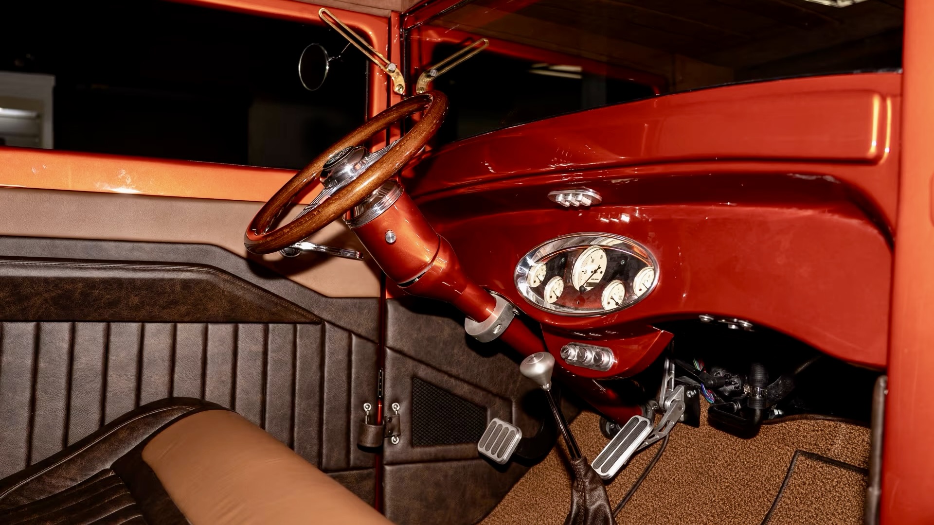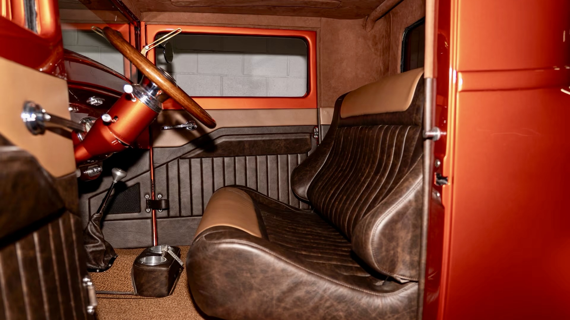 Visually, this thing turns heads from a mile away. It’s finished in a jaw-dropping Flame Orange Metallic paint job, and the body is loaded with cool touches—like a ribbed roof insert borrowed from a 2001 Pontiac Aztek, widened rear fenders, and Ford Vicky-style running boards. The body seams are all welded and leaded, keeping things true to classic hot rod craftsmanship.