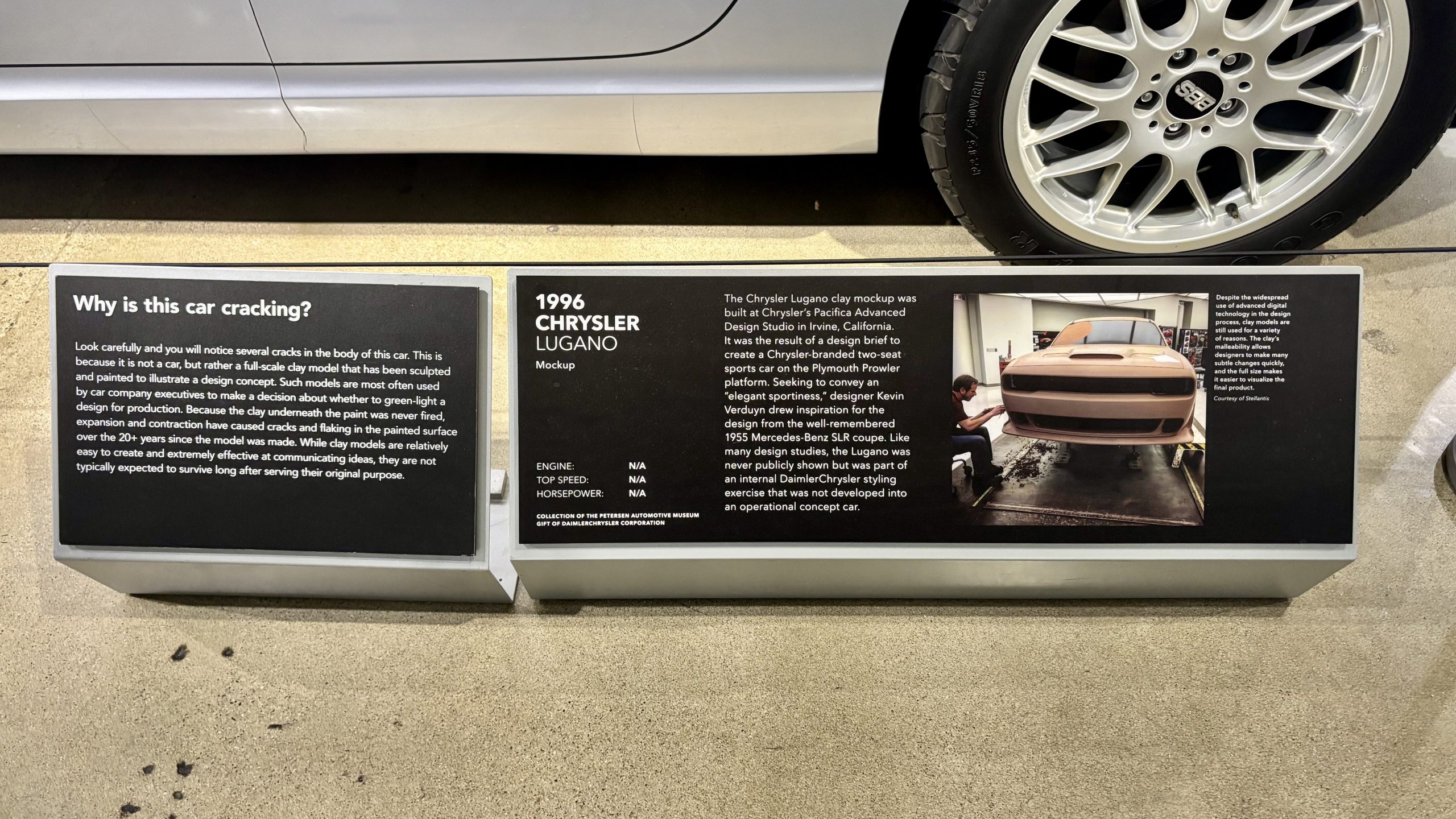 What I didn’t expect was to stumble upon a Chrysler concept car I’d never even heard of: the 1996 Chrysler Lugano. Tucked inside the museum’s Modern Concepts: Future Visions from the Recent Past exhibit, this full-size clay mockup wasn’t just rare — it was never shown to the public until now. And seeing it up close felt like discovering a secret chapter in Chrysler’s design history.