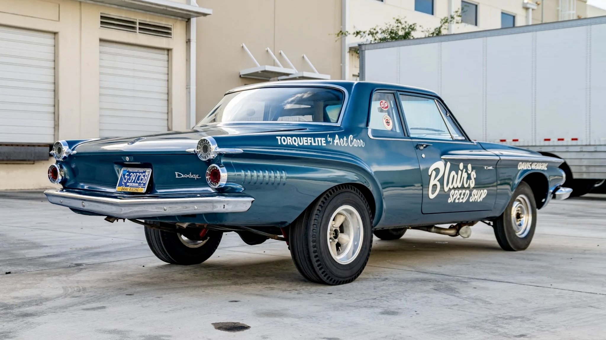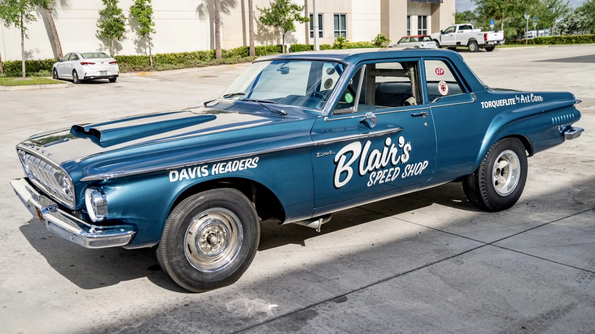 Outside, it’s painted in its original Cobalt Blue Poly (EE-1), though it was resprayed decades ago. The vintage-style white lettering mimics its early drag racing livery, complete with Blair’s Speed Shop graphics. A hood scoop, tow-bar brackets, offset headlights, and stacked taillights complete the menacing look. Sure, there are some paint chips and imperfections—but let’s be honest, they only add to the car’s street cred.