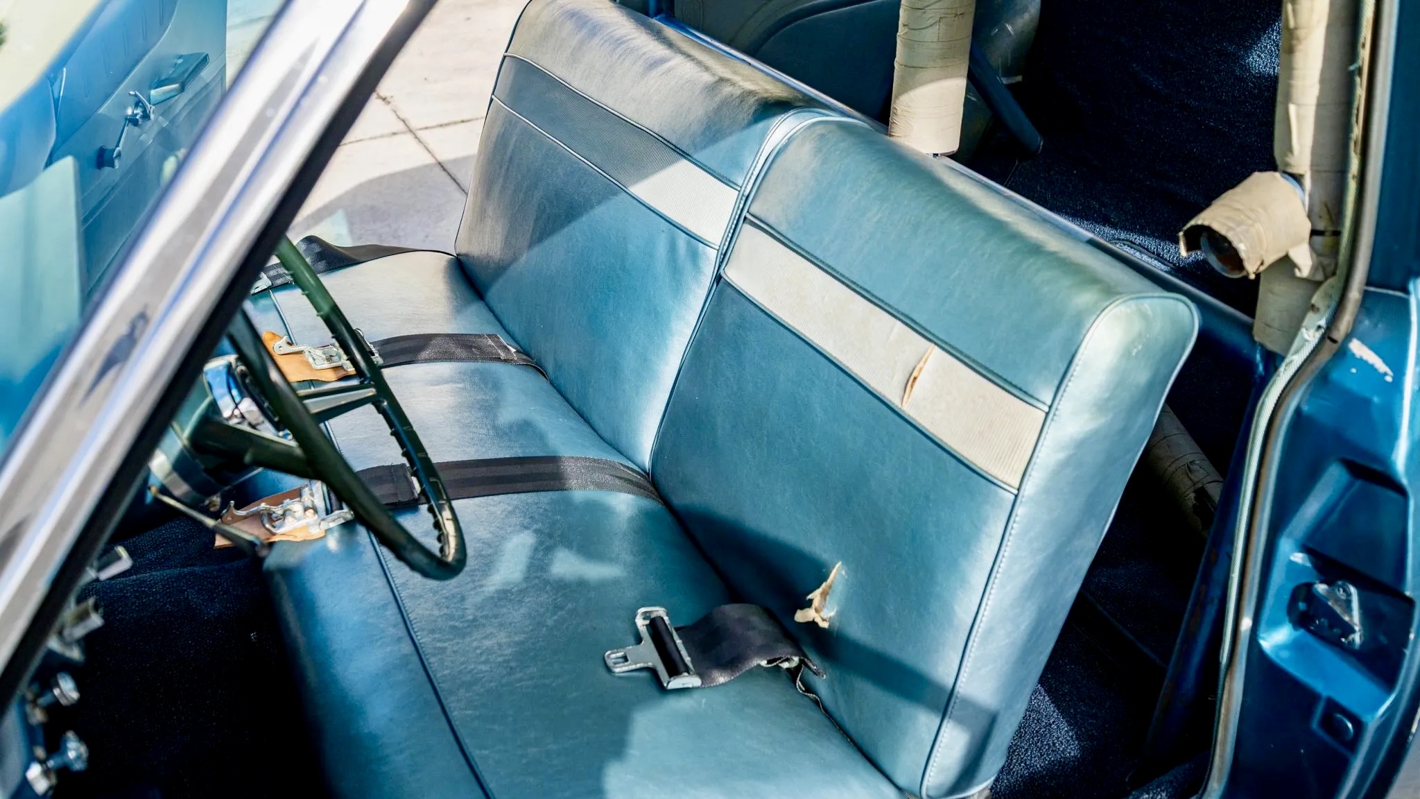 Inside, it’s old-school racing through and through. The front bench seat’s been re-covered in blue and gray vinyl, while the rear seat’s long gone—replaced by a bolt-in roll bar. A two-spoke steering wheel (with a cracked rim, no less) sits in front of a column-mounted Sun tach, a Stewart-Warner oil pressure gauge, and a big sweeping 120-mph speedo. The tach was updated to solid-state by Williamson’s Instruments in Arkansas, and a coolant gauge has been added under the dash.