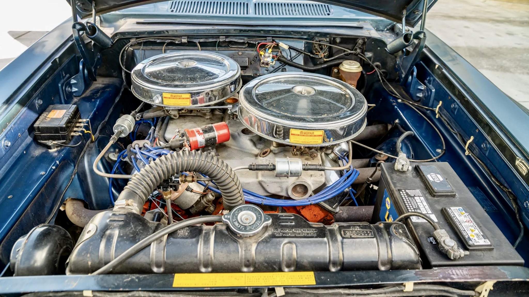 Under the hood is a proper Mopar monster. The 6.8-liter (413 cubic-inch) Max Wedge V8 sports dual Carter 3447 four-barrel carbs on a short-ram intake, pumping out over 400 horsepower. While the original block was swapped early in its life, this engine still brings the heat with a high-lift cam, 11.25:1 compression pistons, and equal-length Davis Headers that scream through a dual exhaust with capped cutouts. It even had an oil change in late 2024, although the seller mentions a small leak at the exhaust-header gasket.