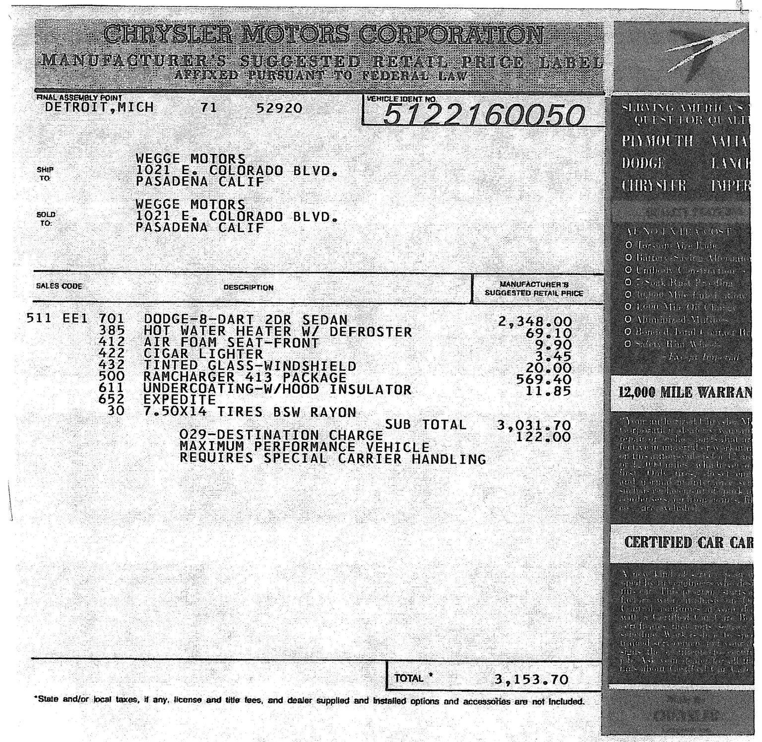 The auction includes some real gems for collectors: a broadcast sheet, a copy of the original window sticker ($3,153.70 new!), display boards, vintage photos, notes, extra tires, and even a tow bar. The Dart is being sold with a clean Montana title registered to the seller’s LLC.