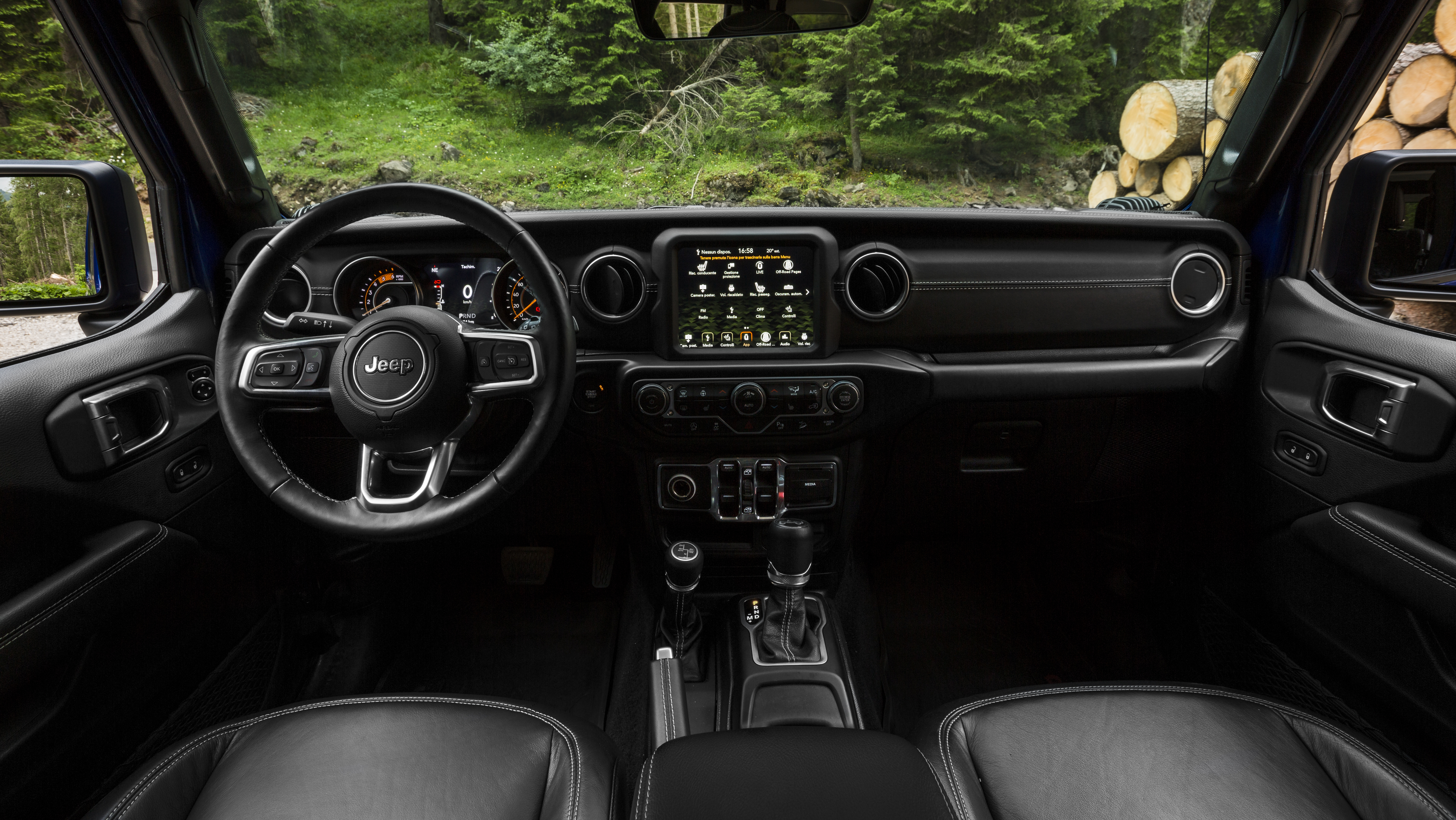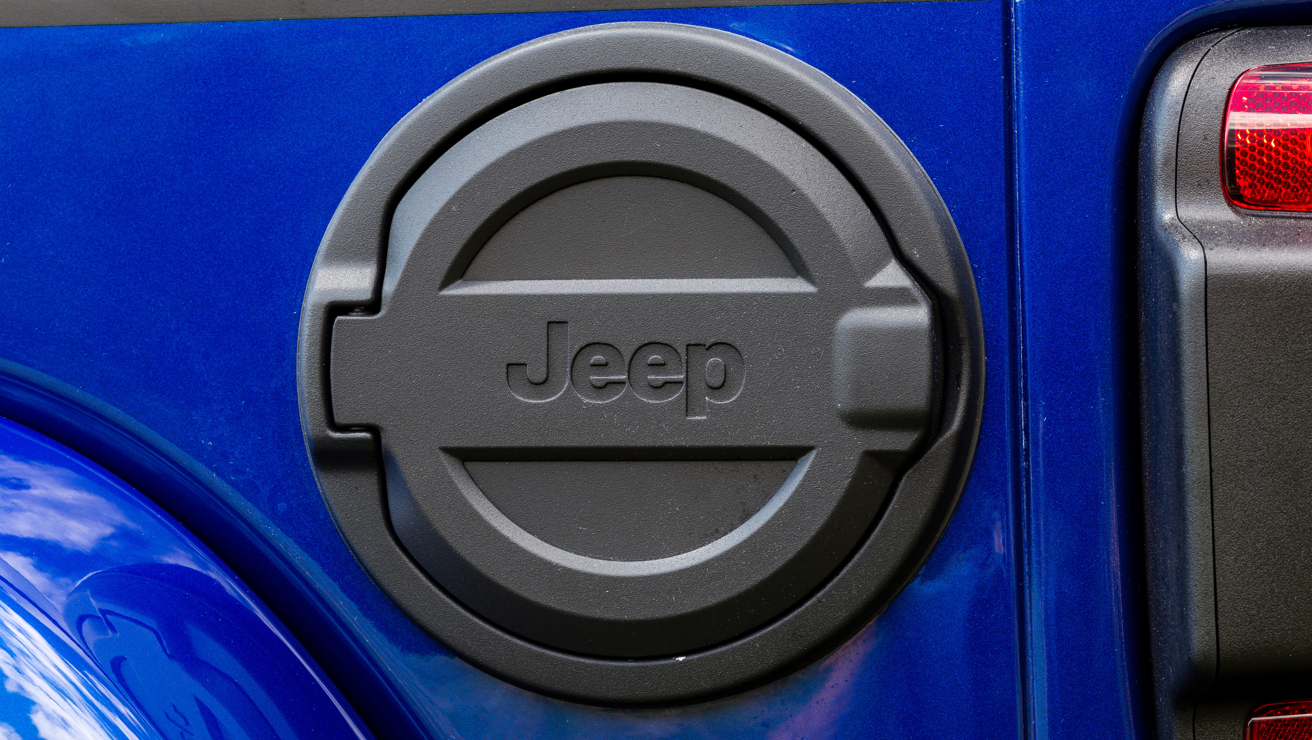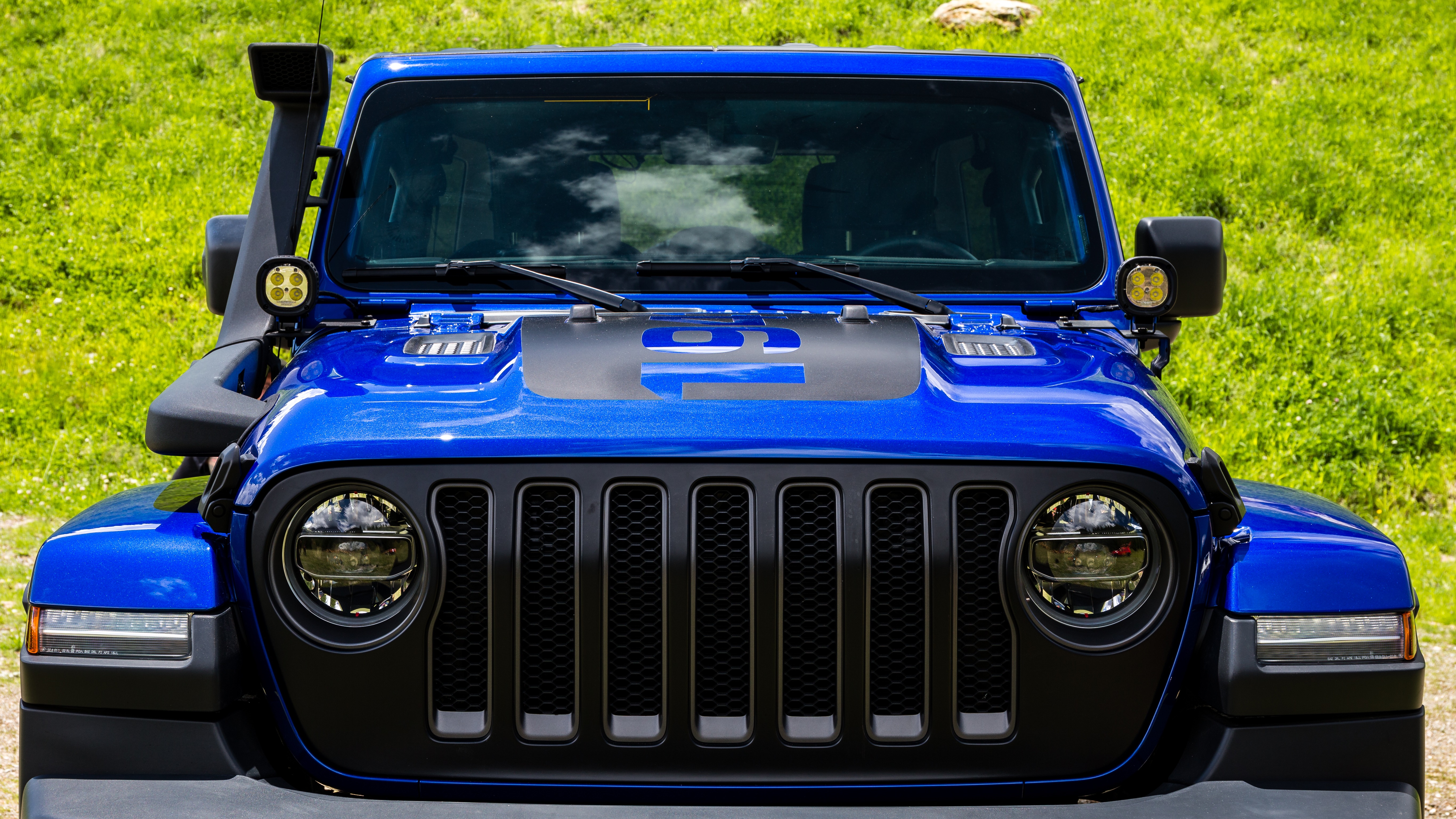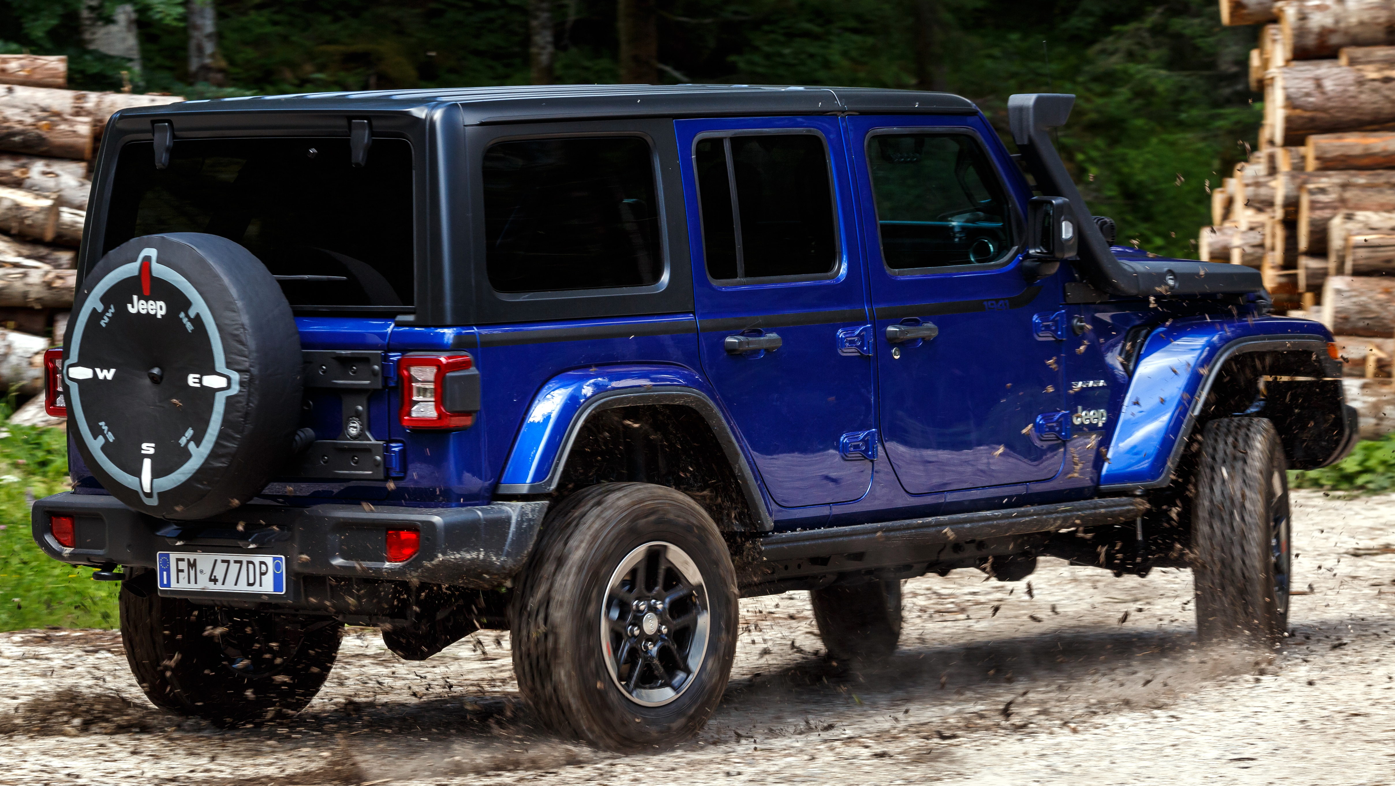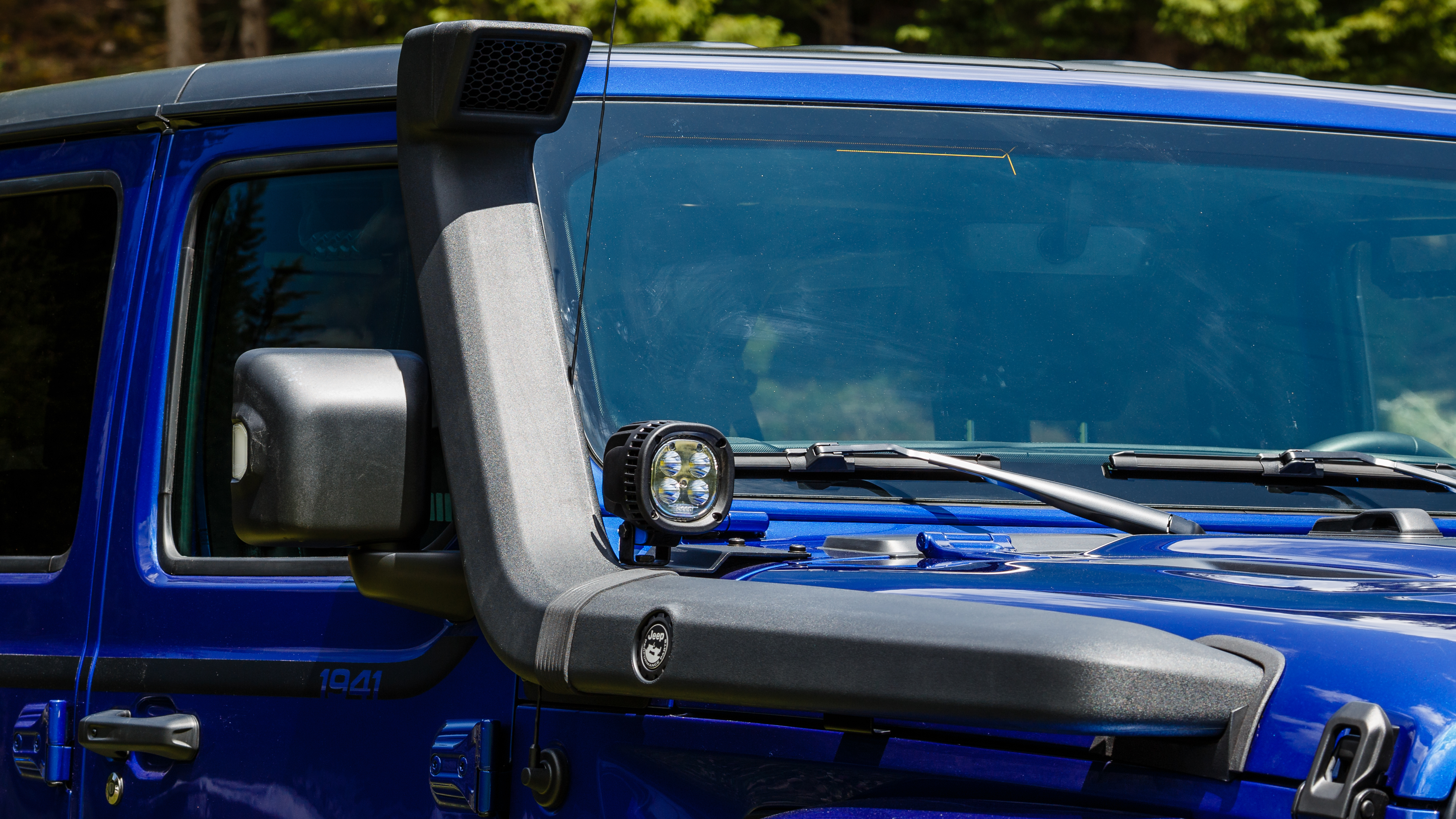 The 1941 heritage is evoked on several different parts of the vehicle such as the wheel, gear knob, and tailgate table. The vehicle is also enhanced with other JPP selected from the Jeep Wrangler parts catalog such as a matte black seven-slot front grille, mudguards, off-road lights, and mirror caps, all contrasting with the Ocean Blue Metallic Clear Coat paint.