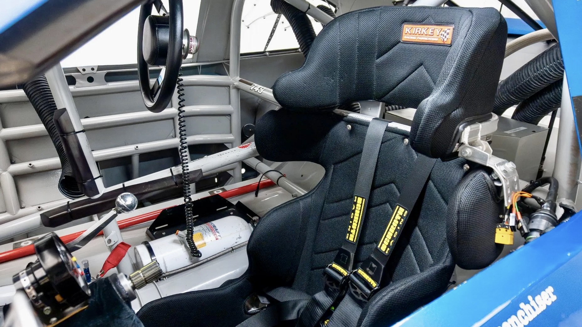 Inside, the cockpit is stripped and purposeful. A fixed Kirkey aluminum racing seat and Schroth harness keep the driver firmly in place within the fully padded roll cage. A carbon-fiber dash houses Spek Pro gauges that monitor vital stats like oil pressure, water temperature, and voltage. Toggle switches control key systems, and a quick-release steering wheel, brake-bias adjuster, dual MSD ignition boxes, and a Safecraft fire-suppression system highlight its true competition pedigree. There’s no odometer, and as expected, no traditional VIN—this is a purebred race car sold on a bill of sale, not a street-legal vehicle.