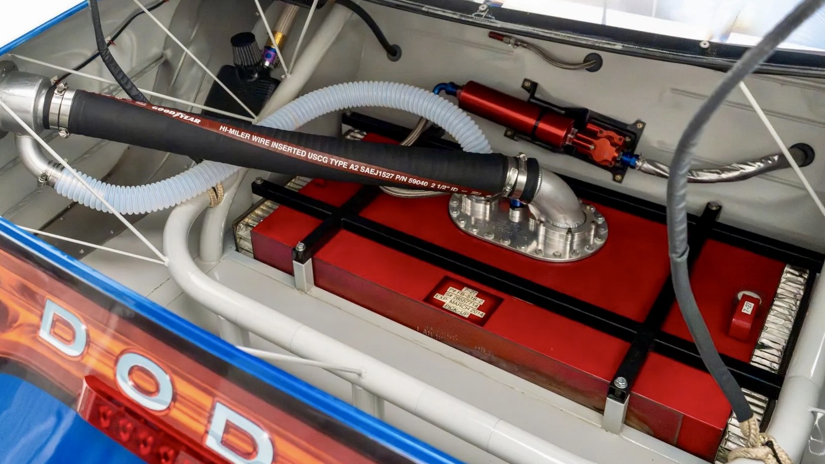 Under the hood sits a 5.9-liter (358 cubic-inch) V8 engine topped with a Holley four-barrel carburetor and backed by an Andrews Products “dog box” four-speed manual transmission. The setup produces that raw, unfiltered NASCAR roar fans expect, delivered through dual side-exit exhaust pipes. Additional race-spec components include a heated dry-sump oiling system, tubular headers, and Dodge-branded valve covers. The car sends power to the rear wheels and retains its period-correct AP Racing disc brakes, ensuring it stops as well as it goes.