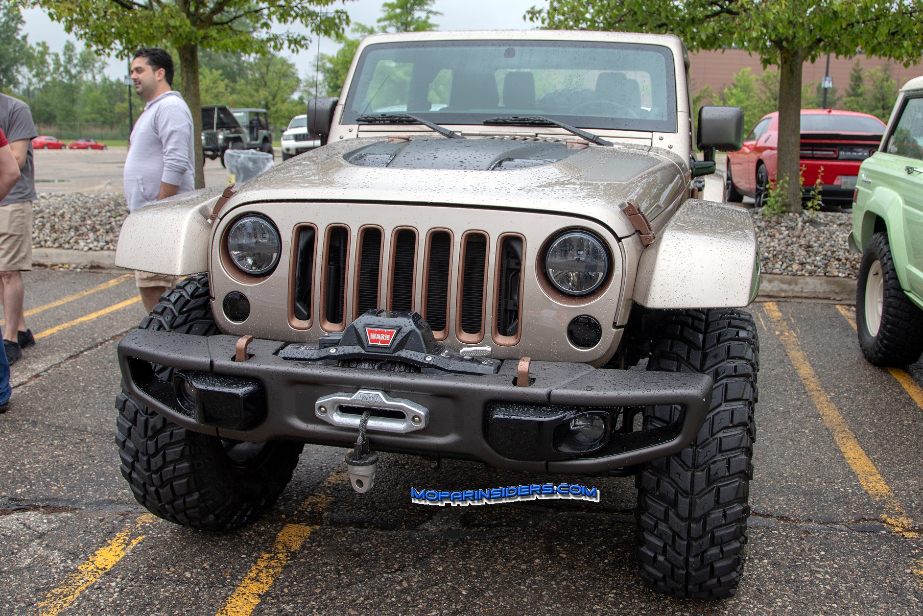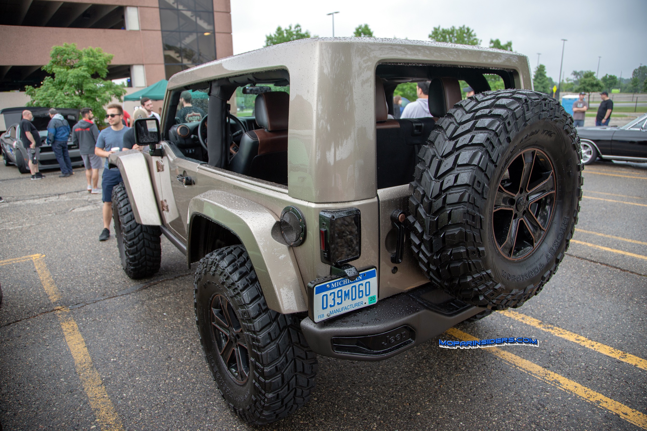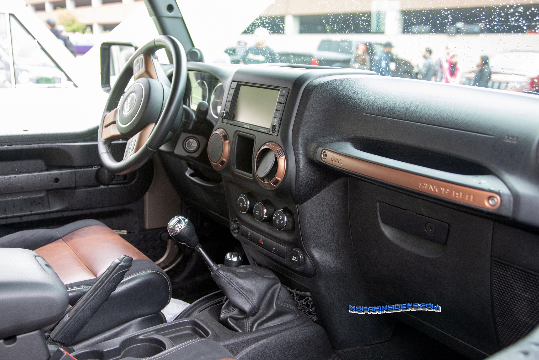The interior features dark saddle Katzkin leather seating, copper accents on the steering wheel spokes, vent rings and passenger grab handle and Mopar slush mats.