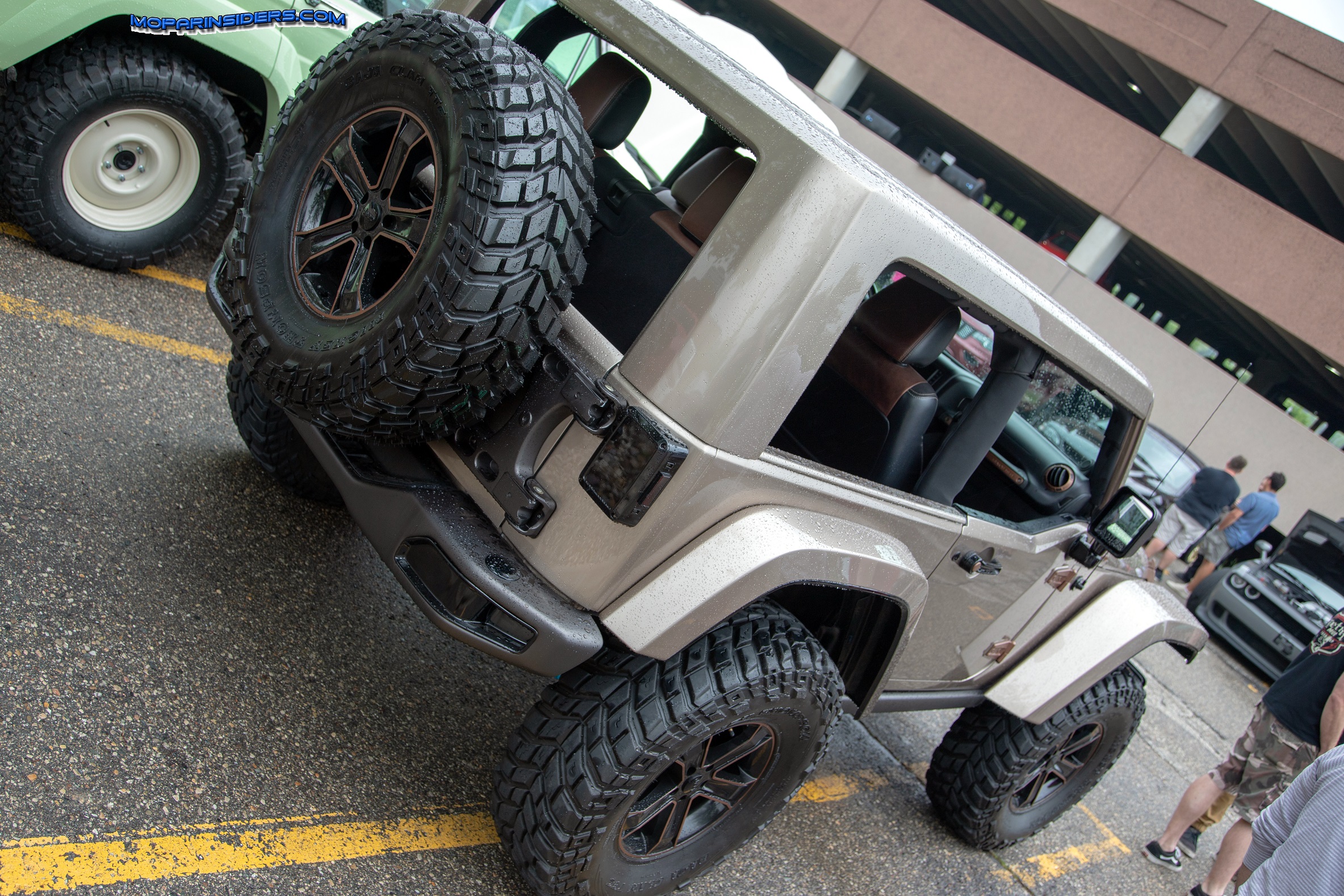 Featuring a custom one-piece, windowless hard top, the body is finished in a metallic sandstone with copper and brown accents. The top and windshield were chopped two inches, and the b-pillar was removed creating a massive opening from front to rear. The door and hood hinges, tow hooks, grille slats and headlamp surrounds are finished in a copper tone, and the bumpers, side rails, side mirrors and hood decal are dark brown. The bumpers are customized versions from the Wrangle Rubicon 10th Anniversary model, as is the hood. Custom high line fender flares, Truck-Lite LED headlamps, LED rear taillamps and side markers, a massive Warn Zeon winch and TeraFlex spare tire carrier round off the exterior enhancements.