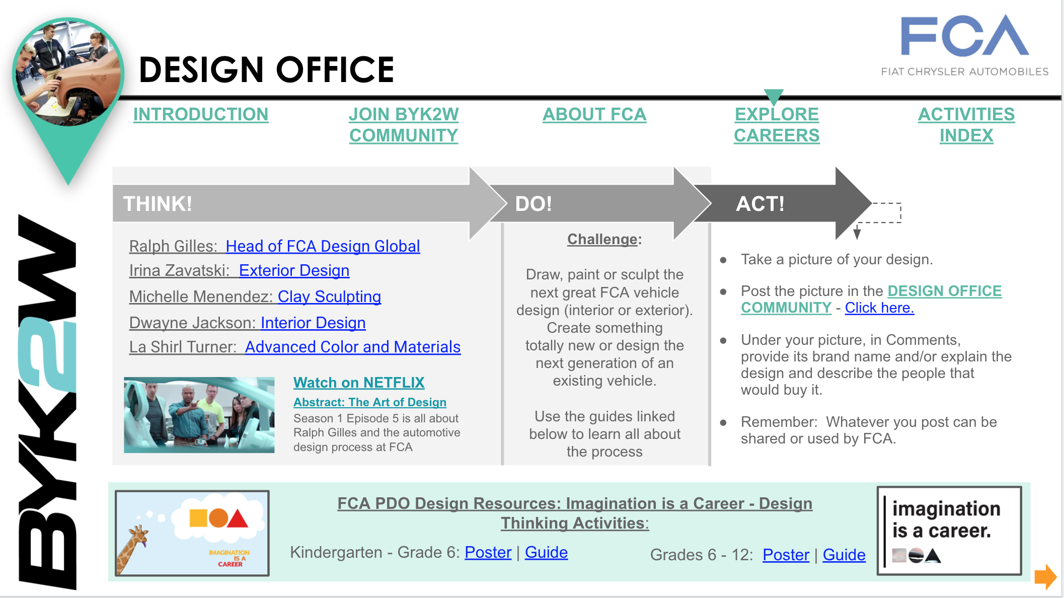 - Think! – Wonder what it’s like to be an automotive designer? Get a peek inside the FCA Design Studios with designers who have created some of the most exciting vehicles on the road today.