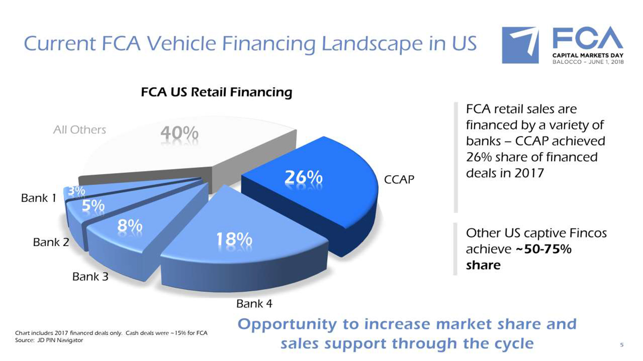 As part of the 5 year presentation FCA announced that they are looking at the possibility of creating a captive financing arm in the North American market. This would be done either through an acquisition or through a startup. FCA sees this as an opportunity to increase their financing share in the US market as the Santander rebranded Chrysler Capital only achieved a 26% share of financed deals in 2017 compared to a 50-75% share typically seen by a captive financing arm.