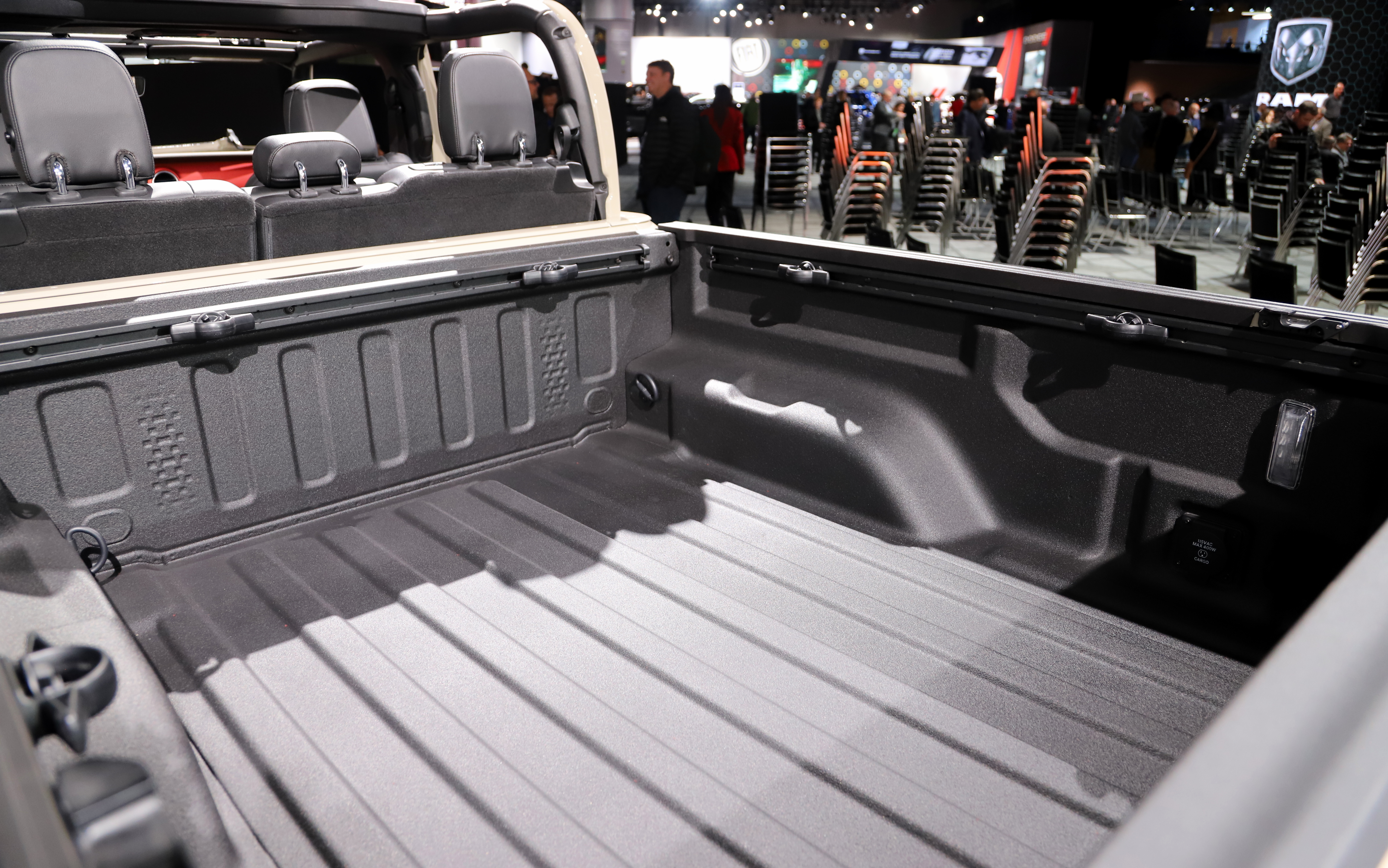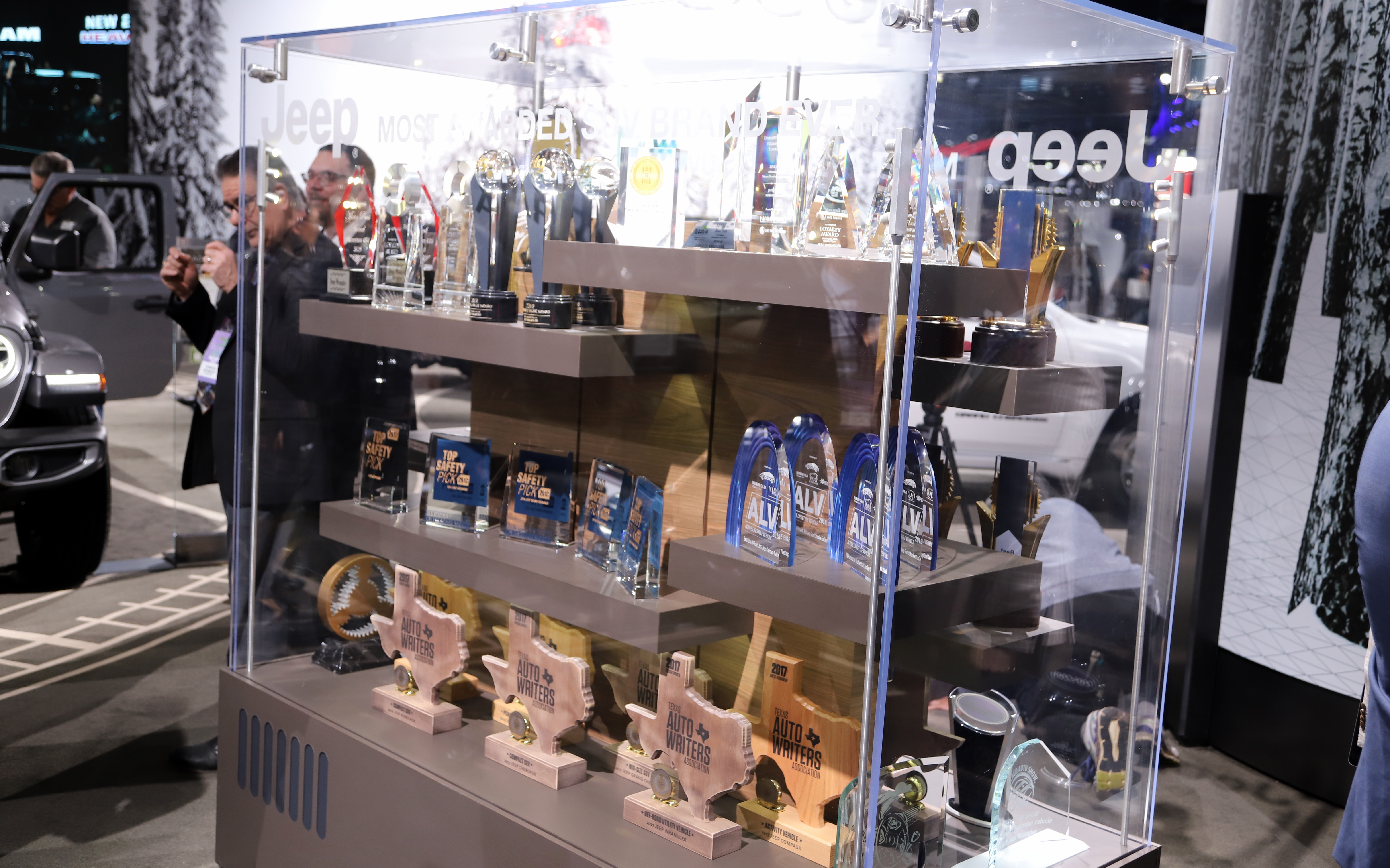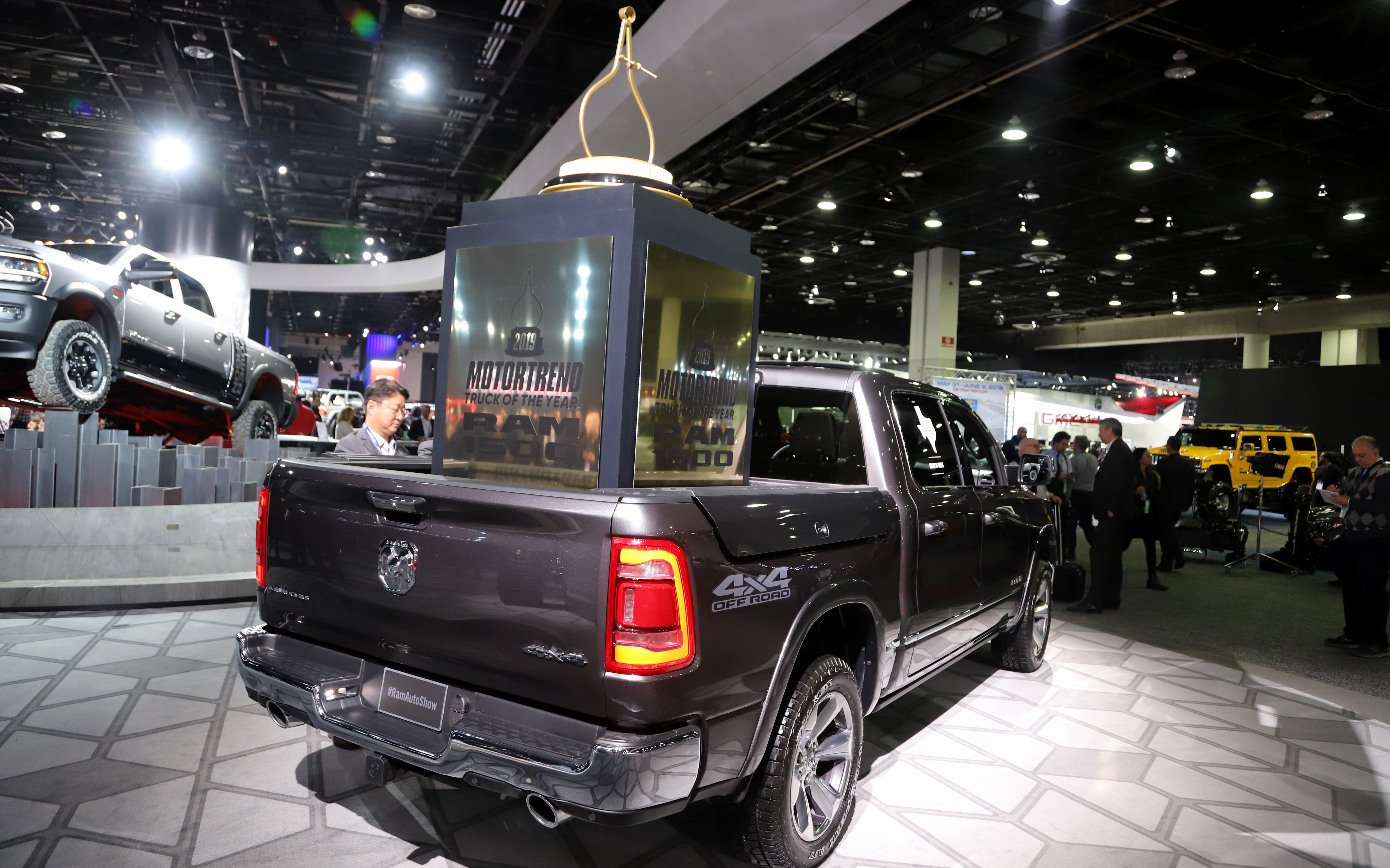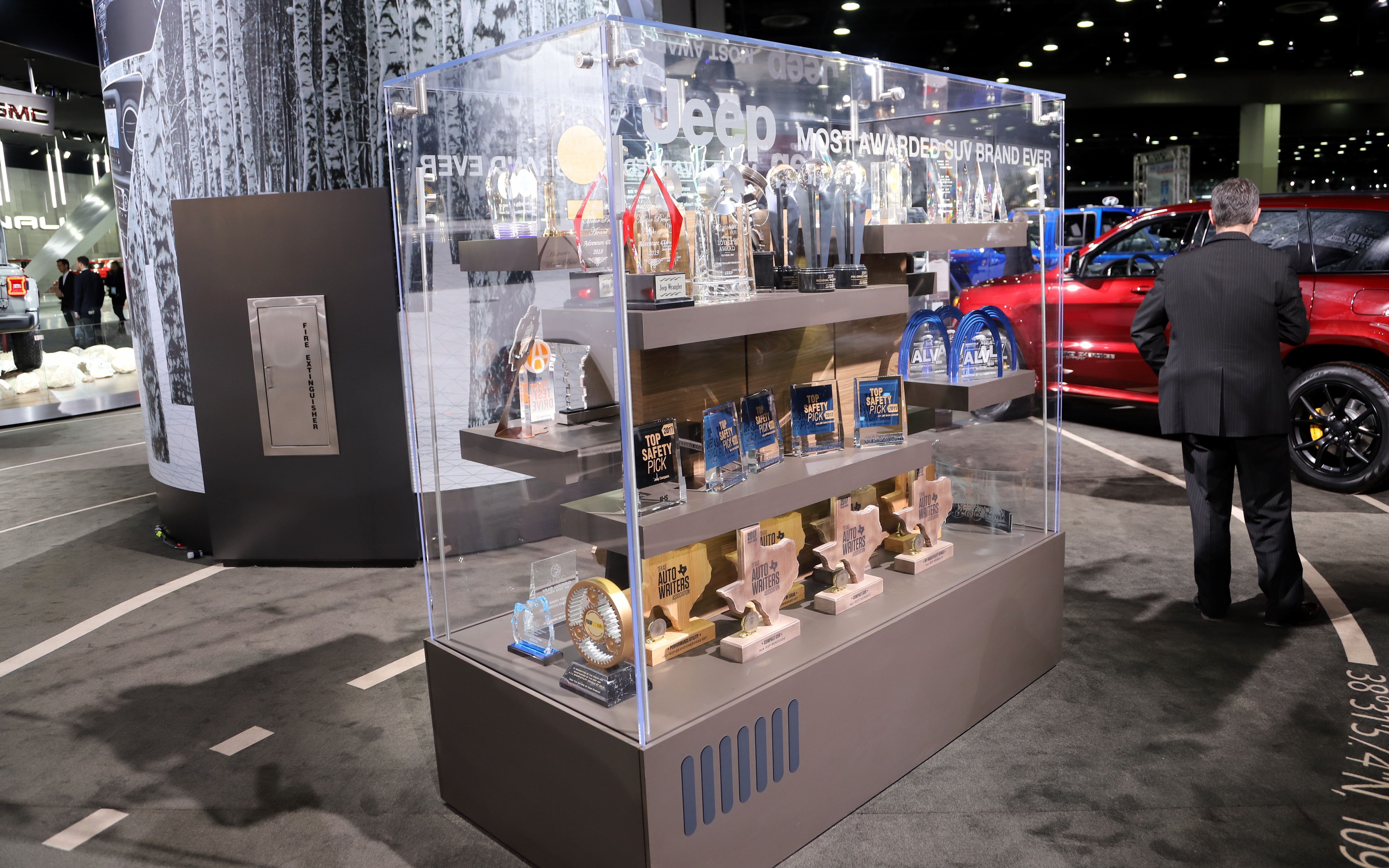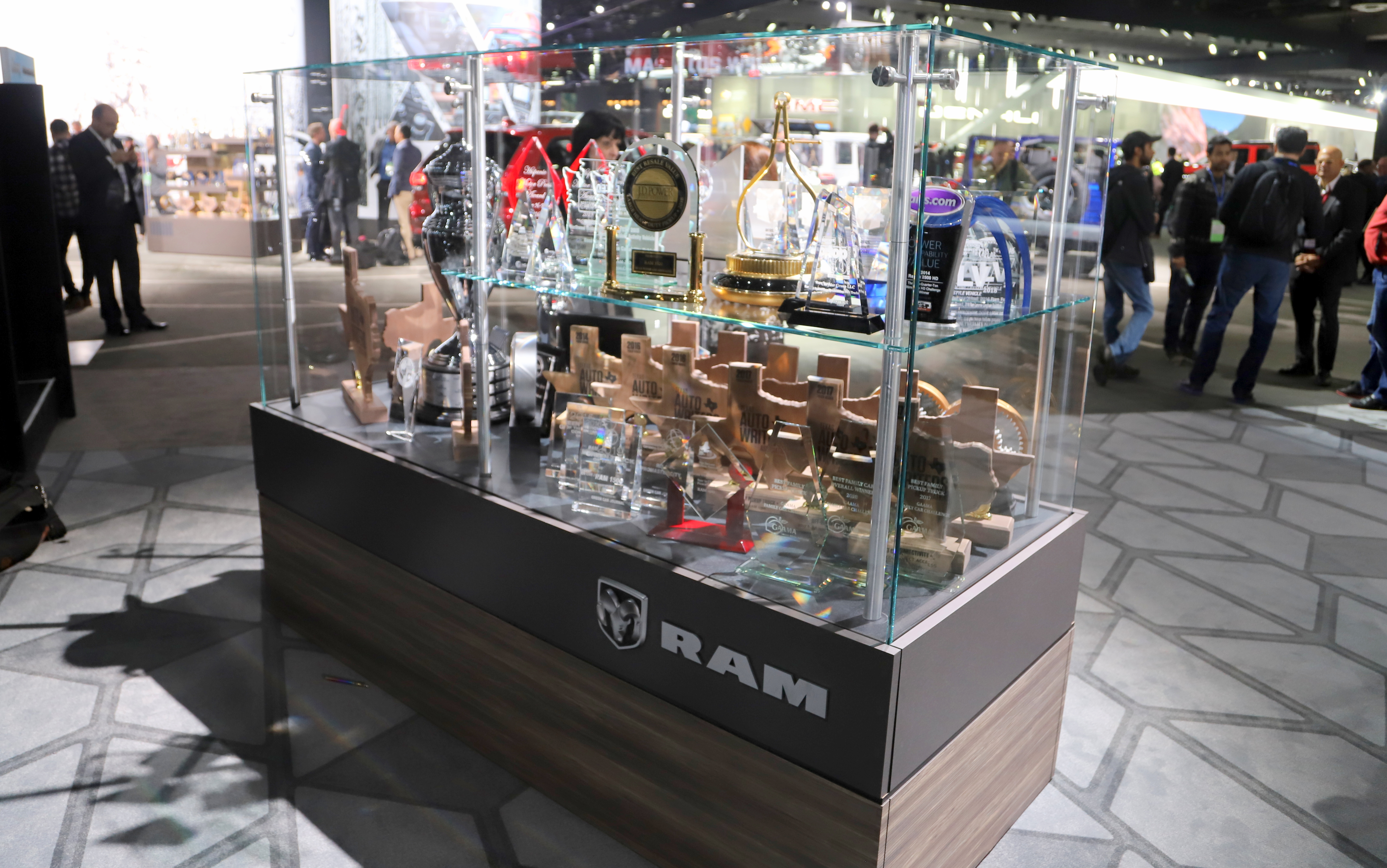 FCA made sure the media and show goers for this next week know how well their brands are doing on the market, with Ram and Jeep having two huge trophy cases backed with awards over the last couple of years. Speaking of awards, in the front of the exhibit sat an all-new 2019 Ram 1500 Limited Crew Cab 4×4 Off-Road, with a huge Motor Trend trophy in the bed, making sure everyone knew within the Ford, Chevrolet and GMC exhibits could see who was title winner this year. Standing next to that truck was a glass case featuring this year’s 2019 Truck of the Year trophy.