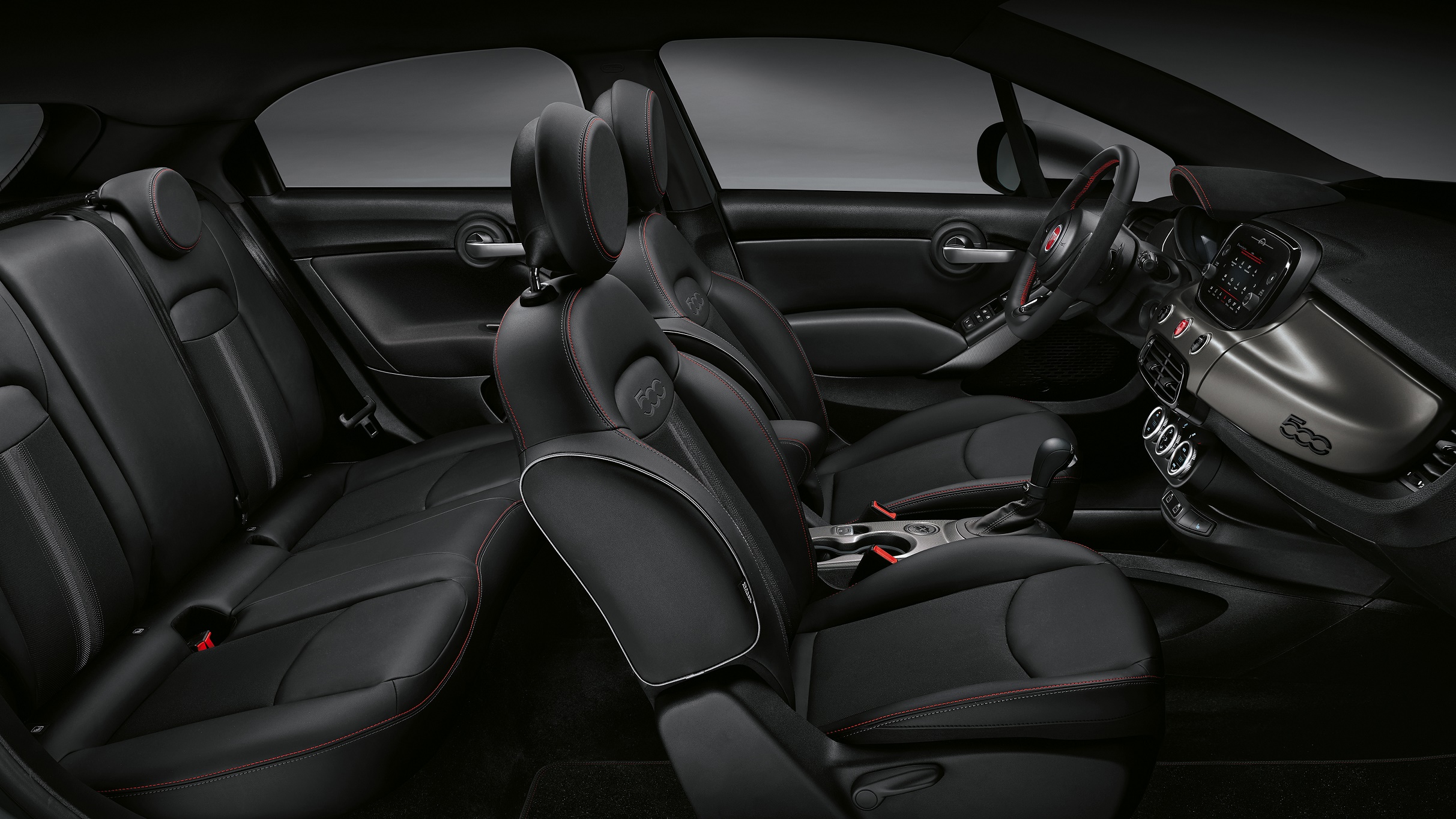 The 500L Sport adds 17-inch aluminum wheels, autonomous city brake, electrochromic rearview mirror, Black Technoprene interior, tinted privacy glass, and ambient lighting.