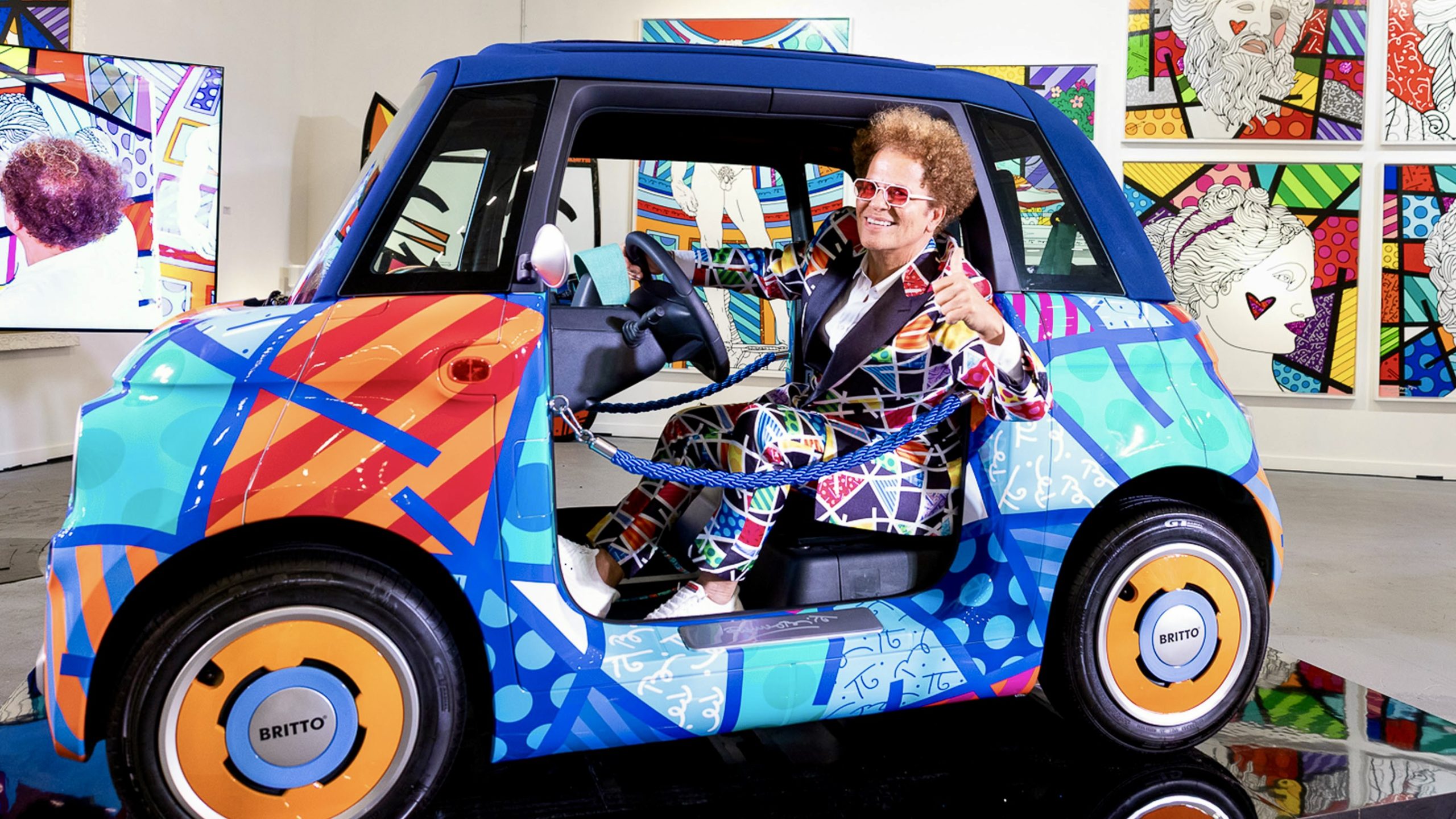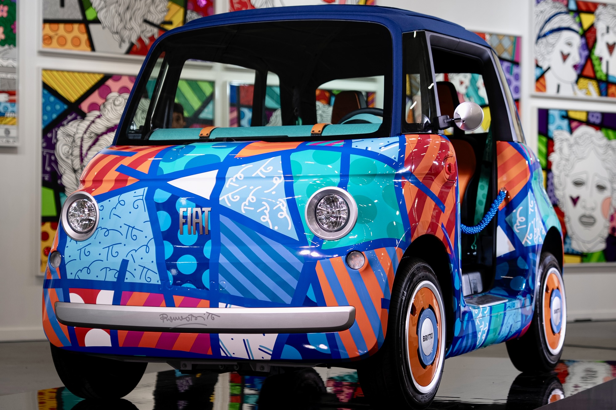 To help introduce the Topolino’s personality to the U.S., Fiat tapped internationally acclaimed artist Romero Britto to create a special one-of-one showcase vehicle. The result is known as the “Brittolino” — a vibrant artistic interpretation of the tiny EV designed specifically for its appearance at Art Week Miami.